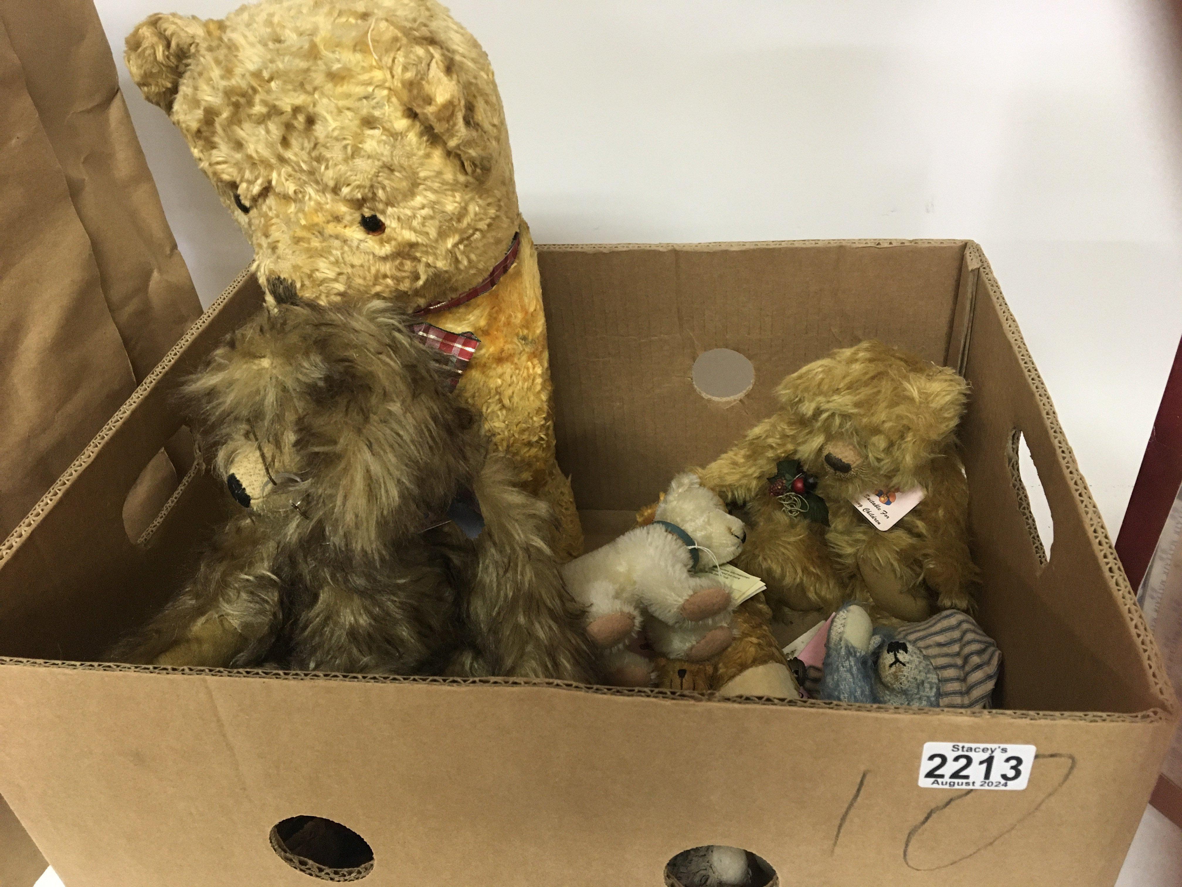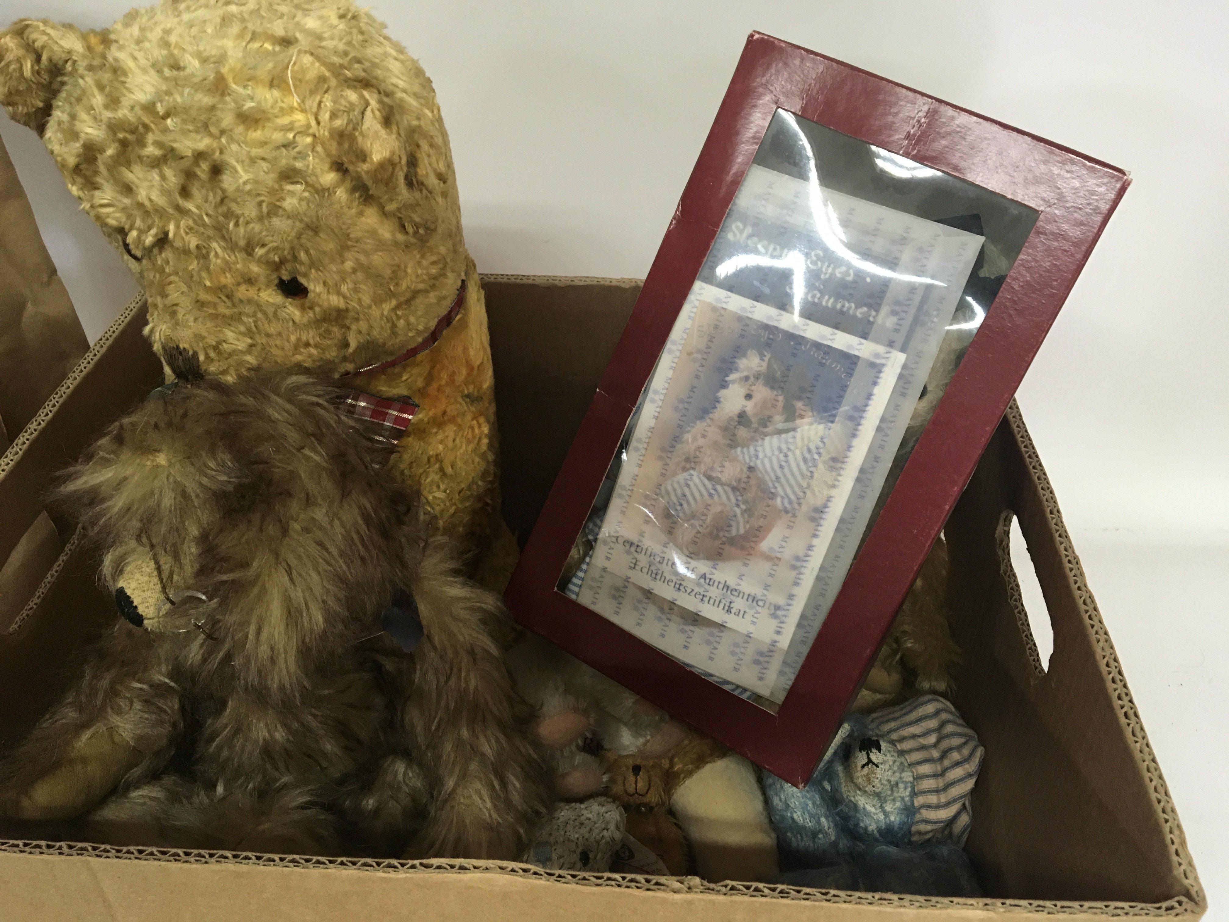 A box containing a collection of Vintage Teddy Bears including a small Eisbar bear with hanging tags and other bears.