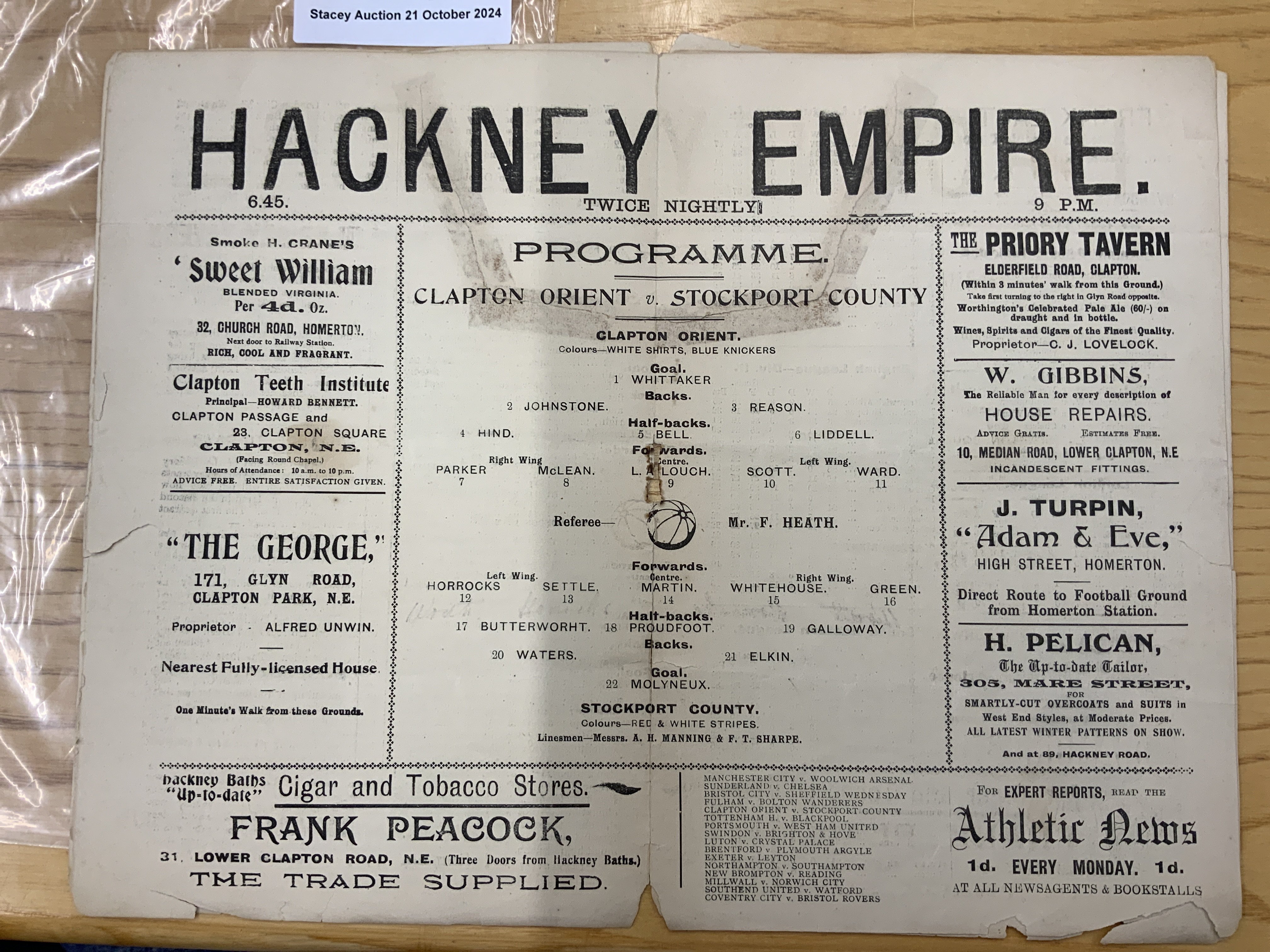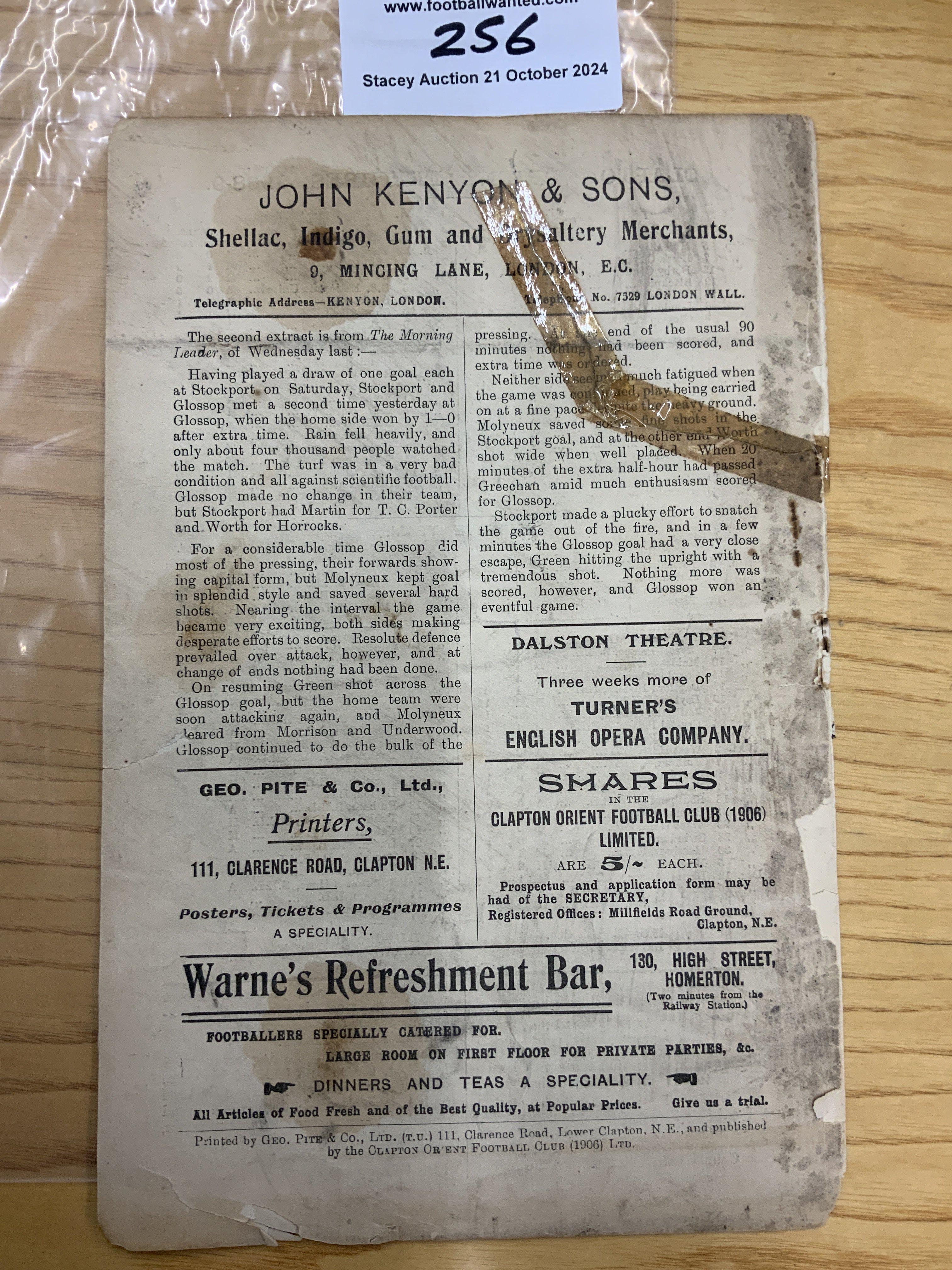 1908 - 1909 Clapton Orient v Stockport County Football Programme: Whist just about all there it is in need of a repair due to tape failing and split spine. No team changes but inspection required.