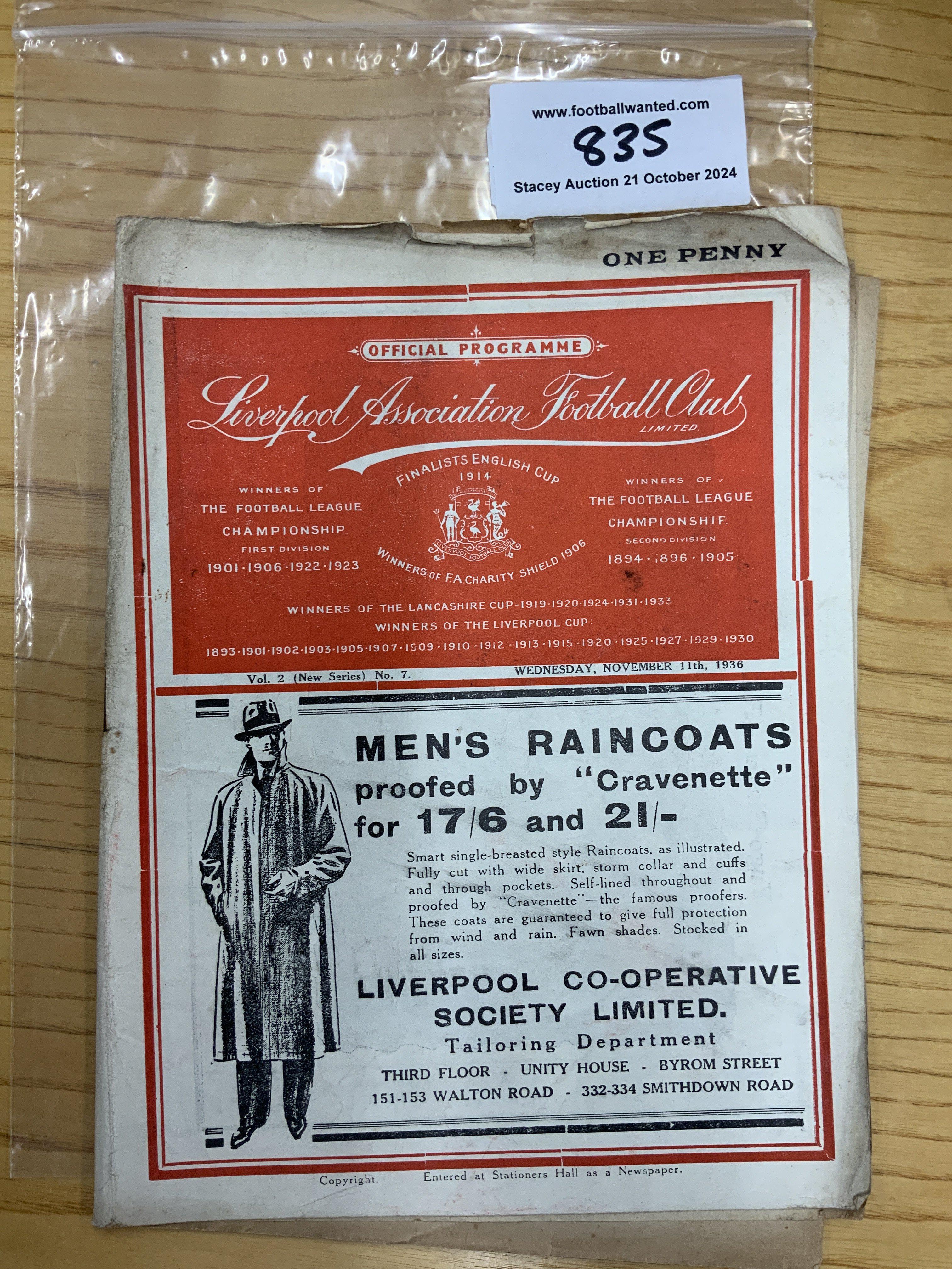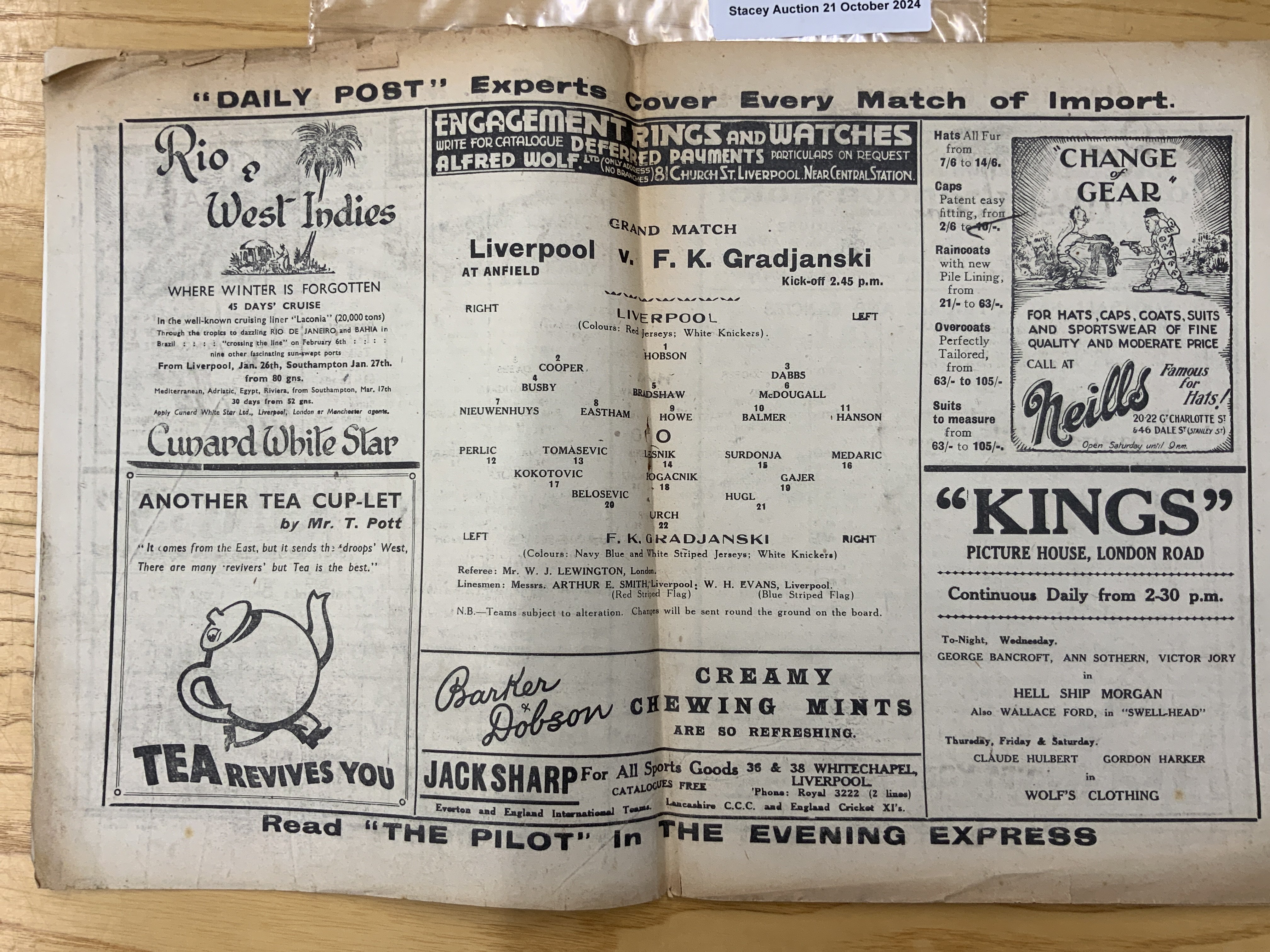 36/37 Liverpool v Gradjanski Football Programme: Fair condition friendly v Yugoslavian team with no team changes. Few tears to top edge and never folded correctly from day one.