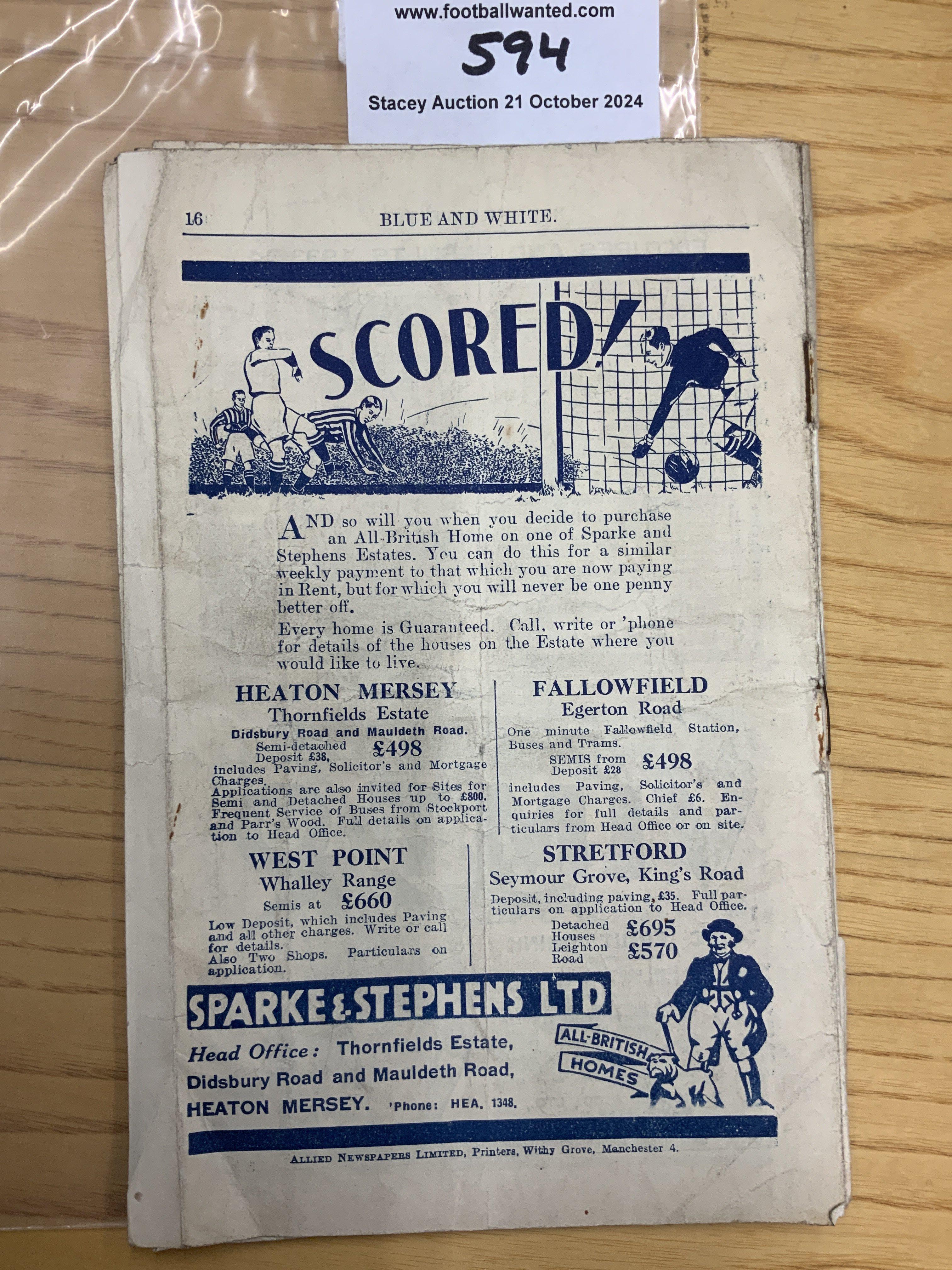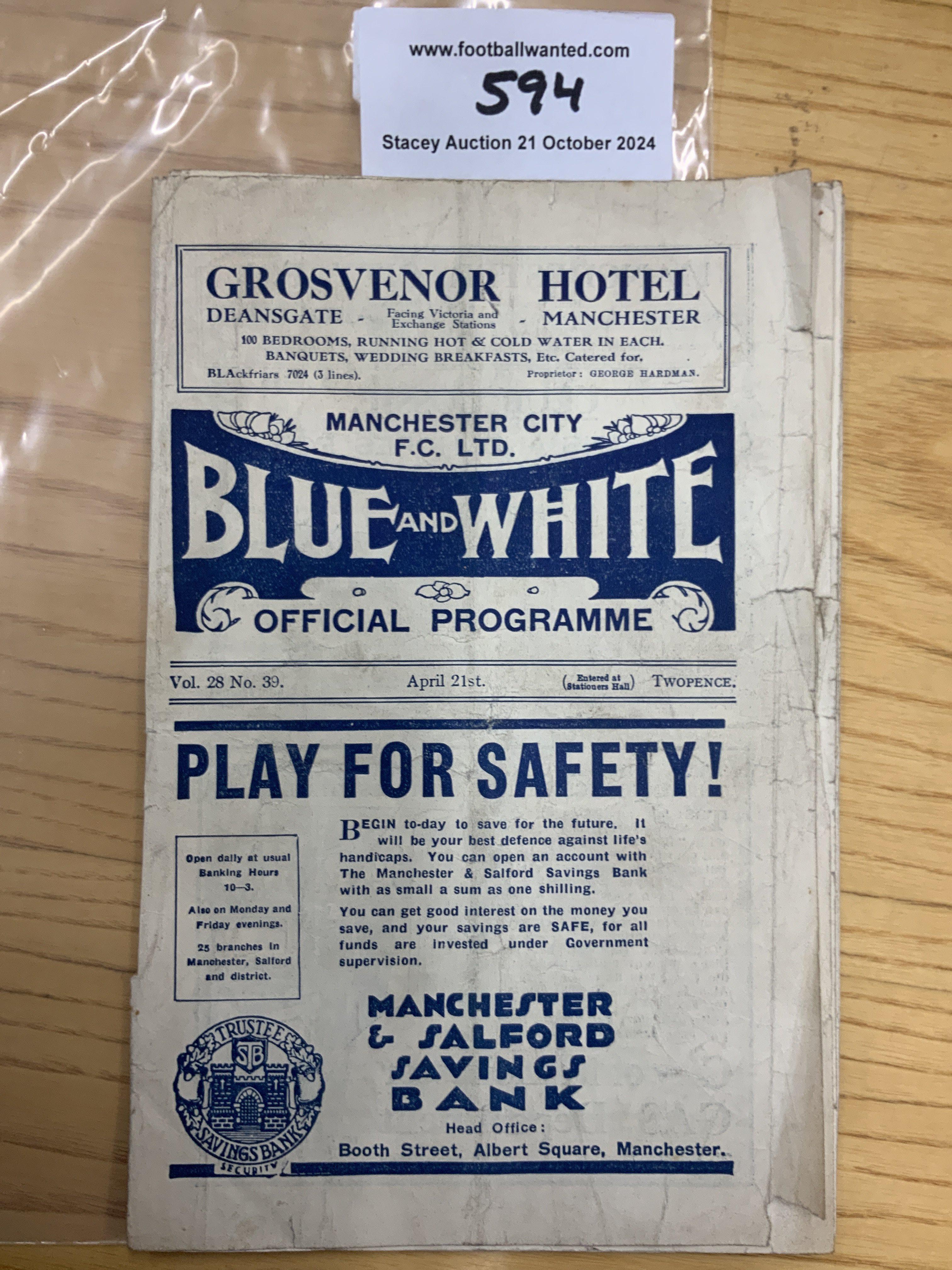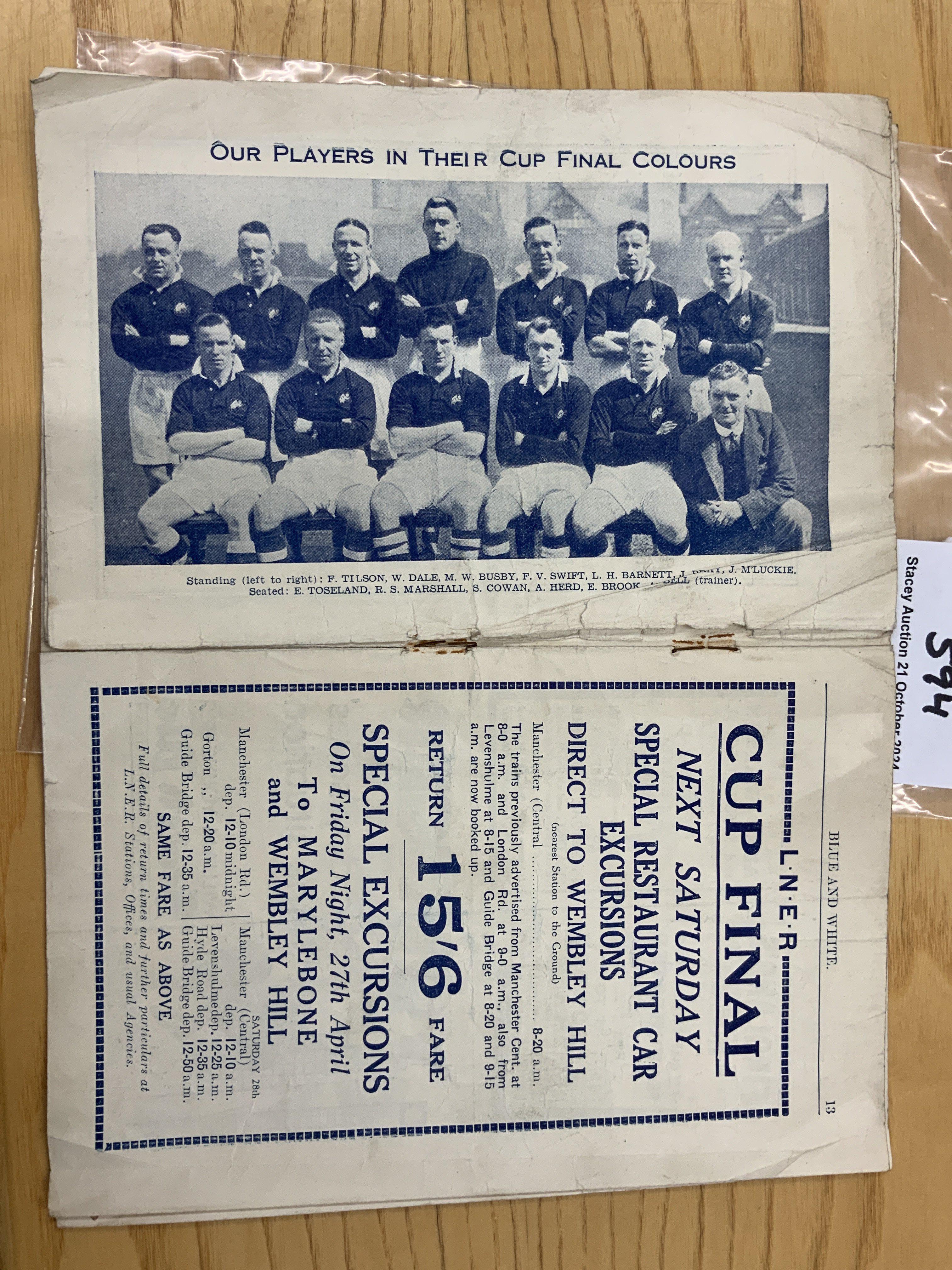 33/34 Manchester City v Chelsea Football Programme: Poor condition as pages 7-11 missing inside. Split spine but nice picture of City in the cup final strip that they will be wearing in their next match.