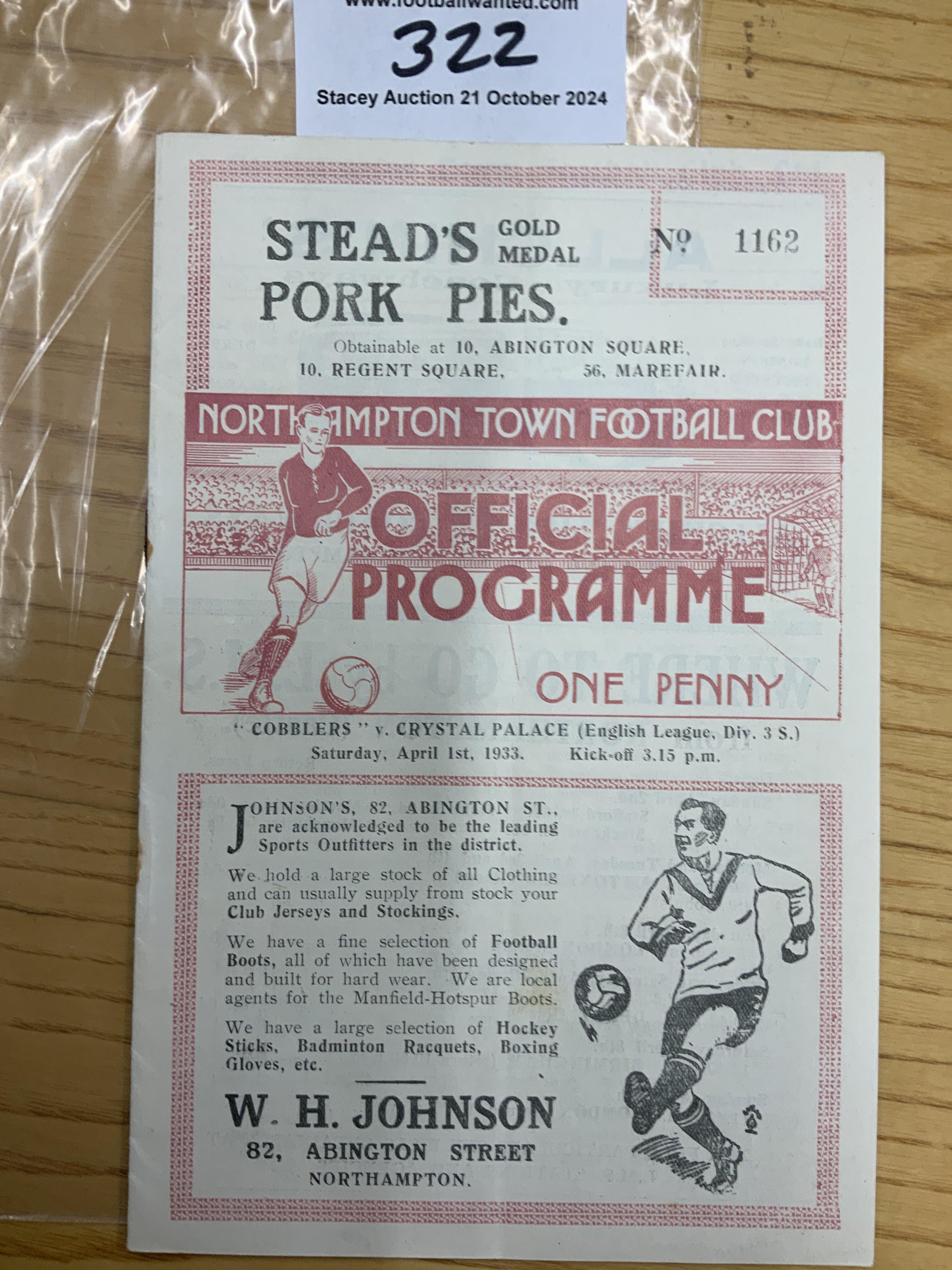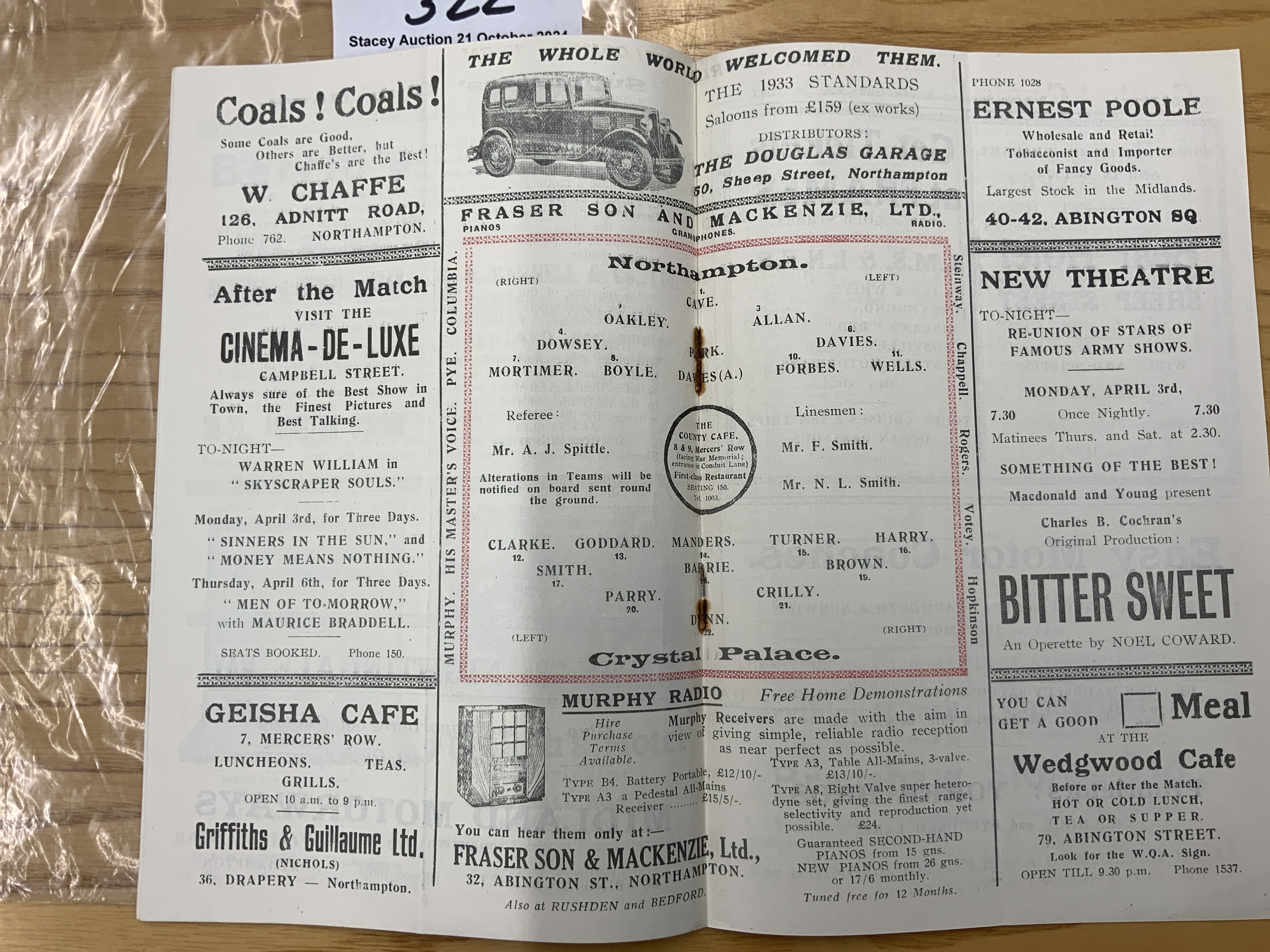 32/33 Northampton v Crystal Palace Football Programme: Good condition with no team changes. League match dated 1 4 1933 has rusty staples holding firm.