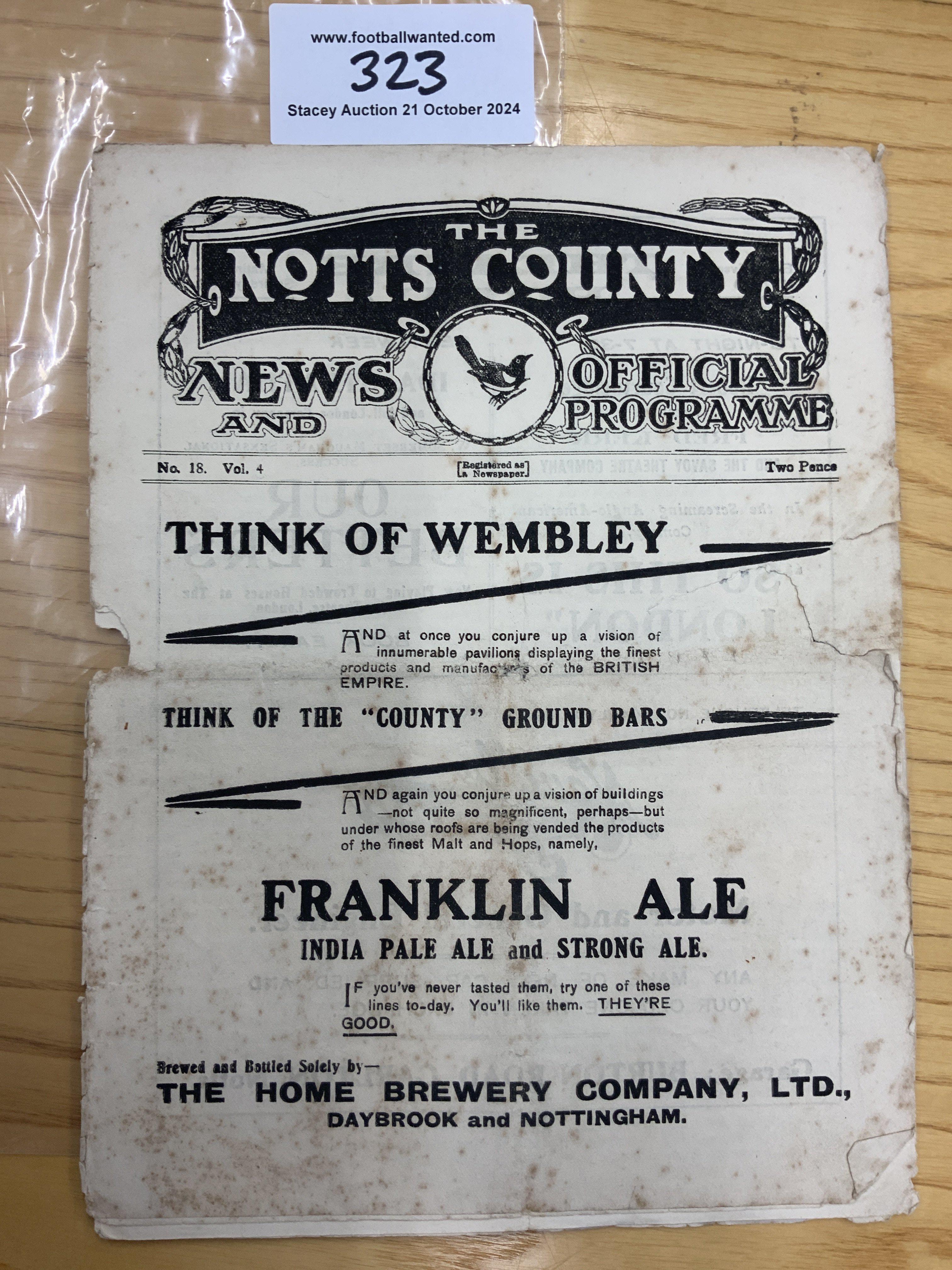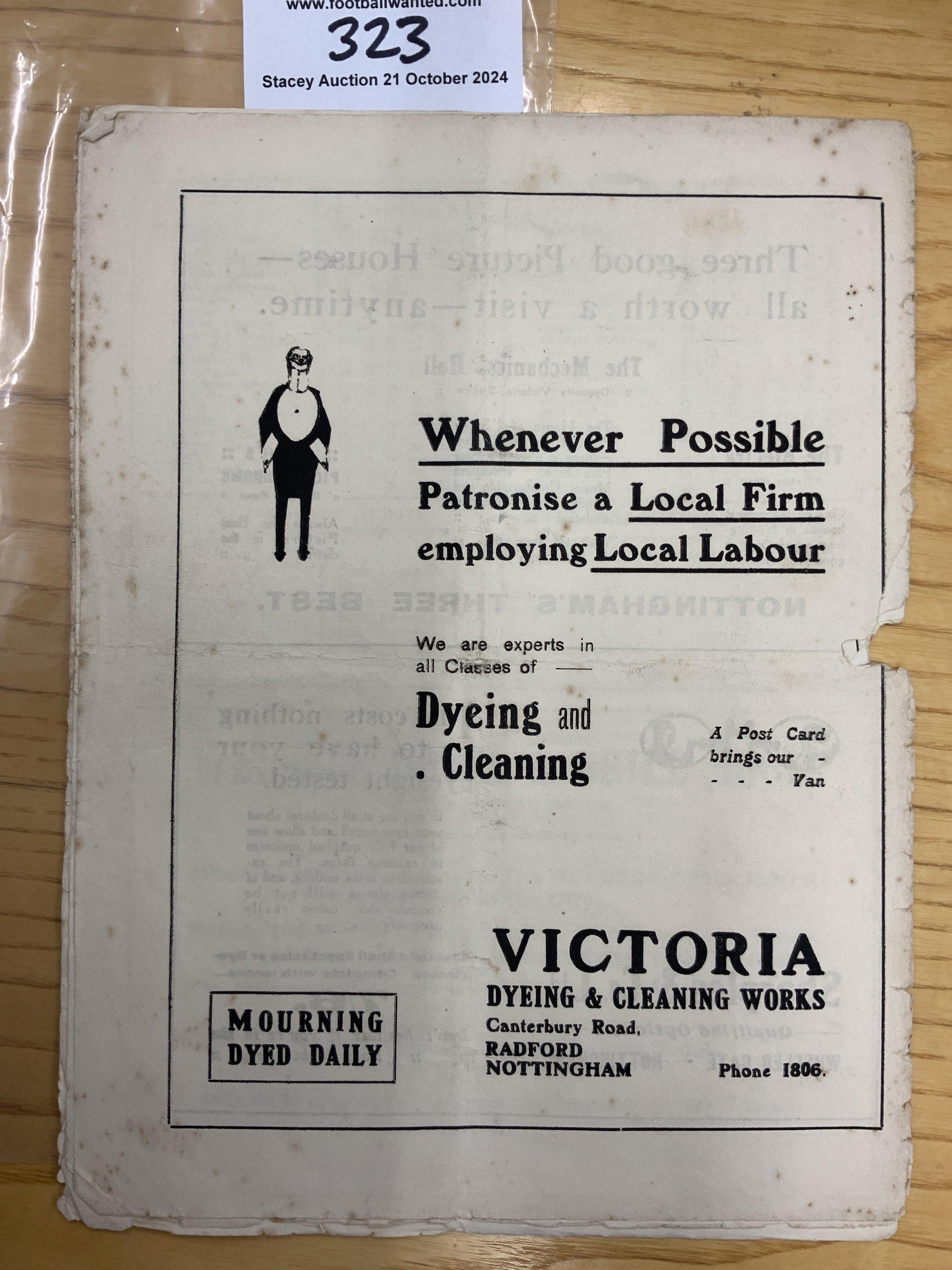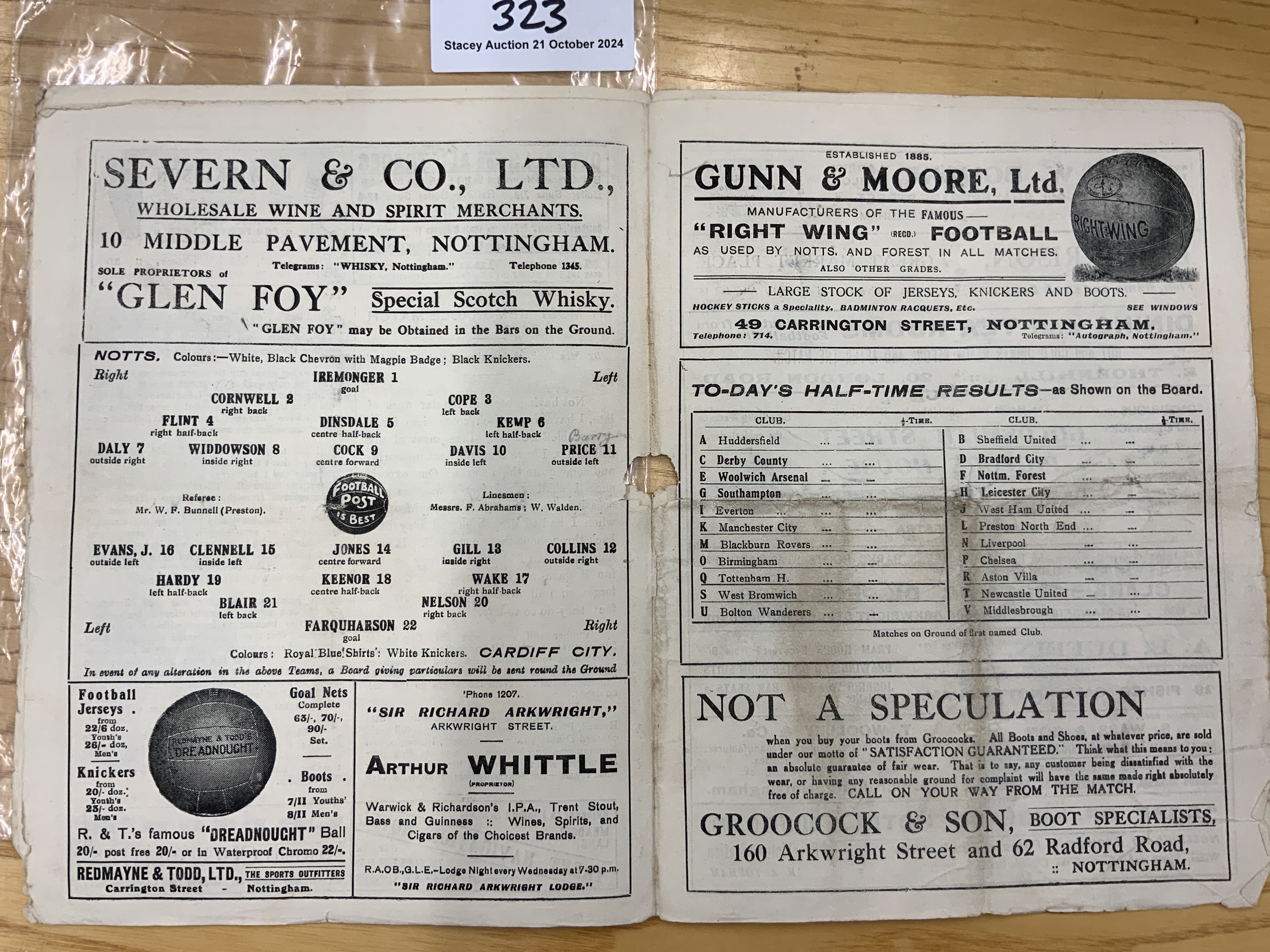 1923 - 1924 Notts County v Cardiff City Football Programme: League match dated 22 3 1924 has no team changes. A hole the size of a 5p where staple used to be with a fold and a few small tears to edge.