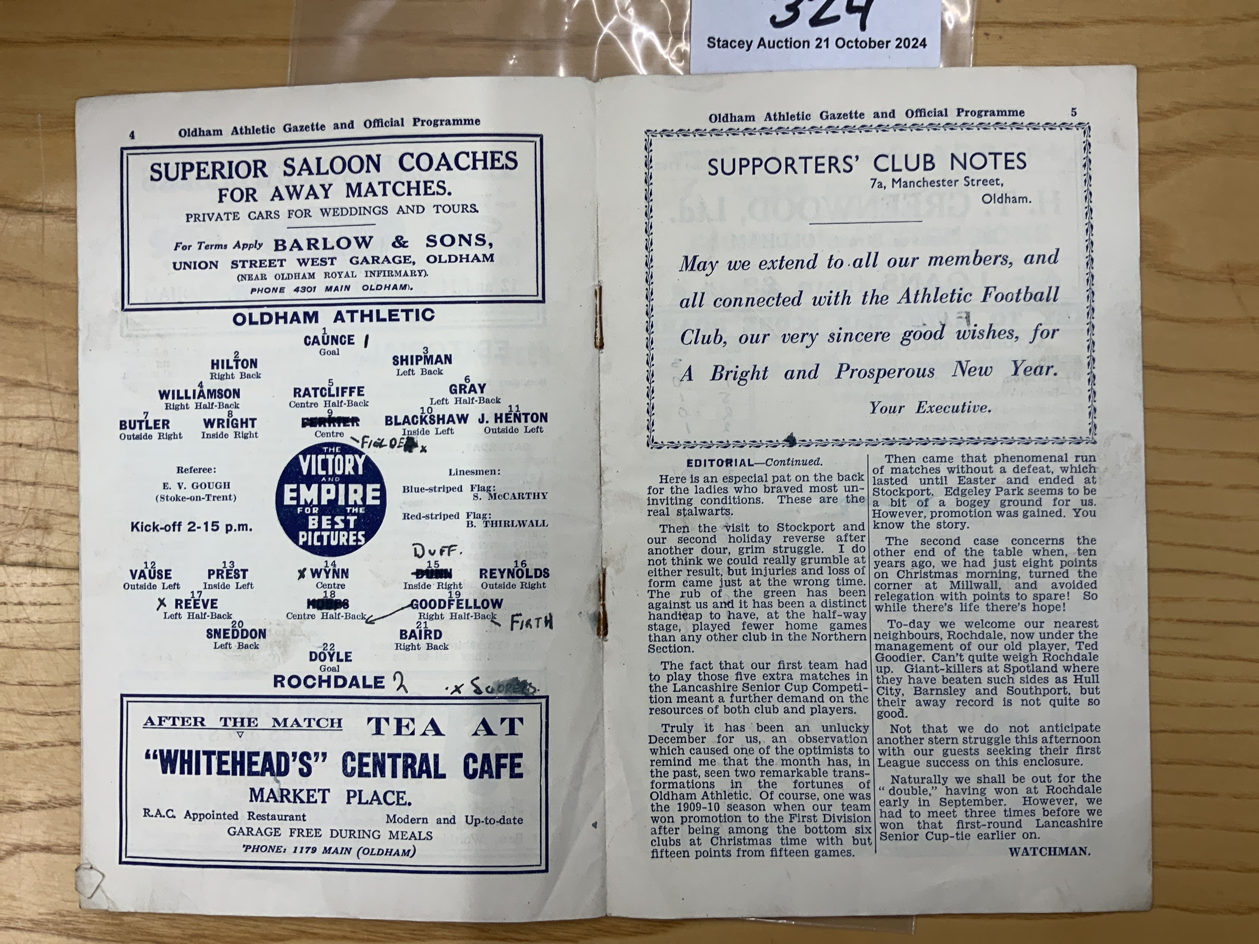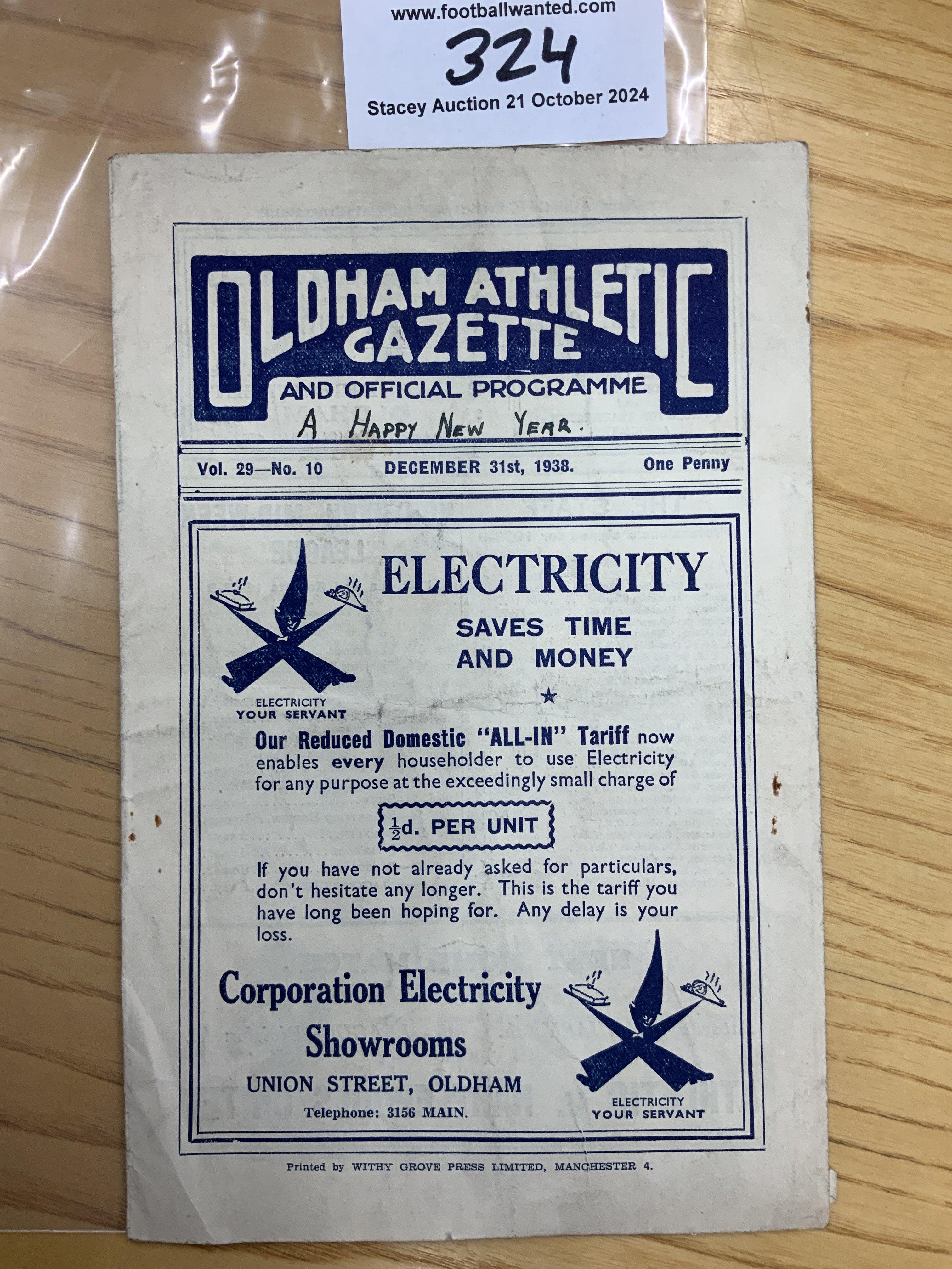 38/39 Oldham v Rochdale Football Programme: Good condition with team changes. League match dated 31 12 1938 has A Happy New Year written to cover.