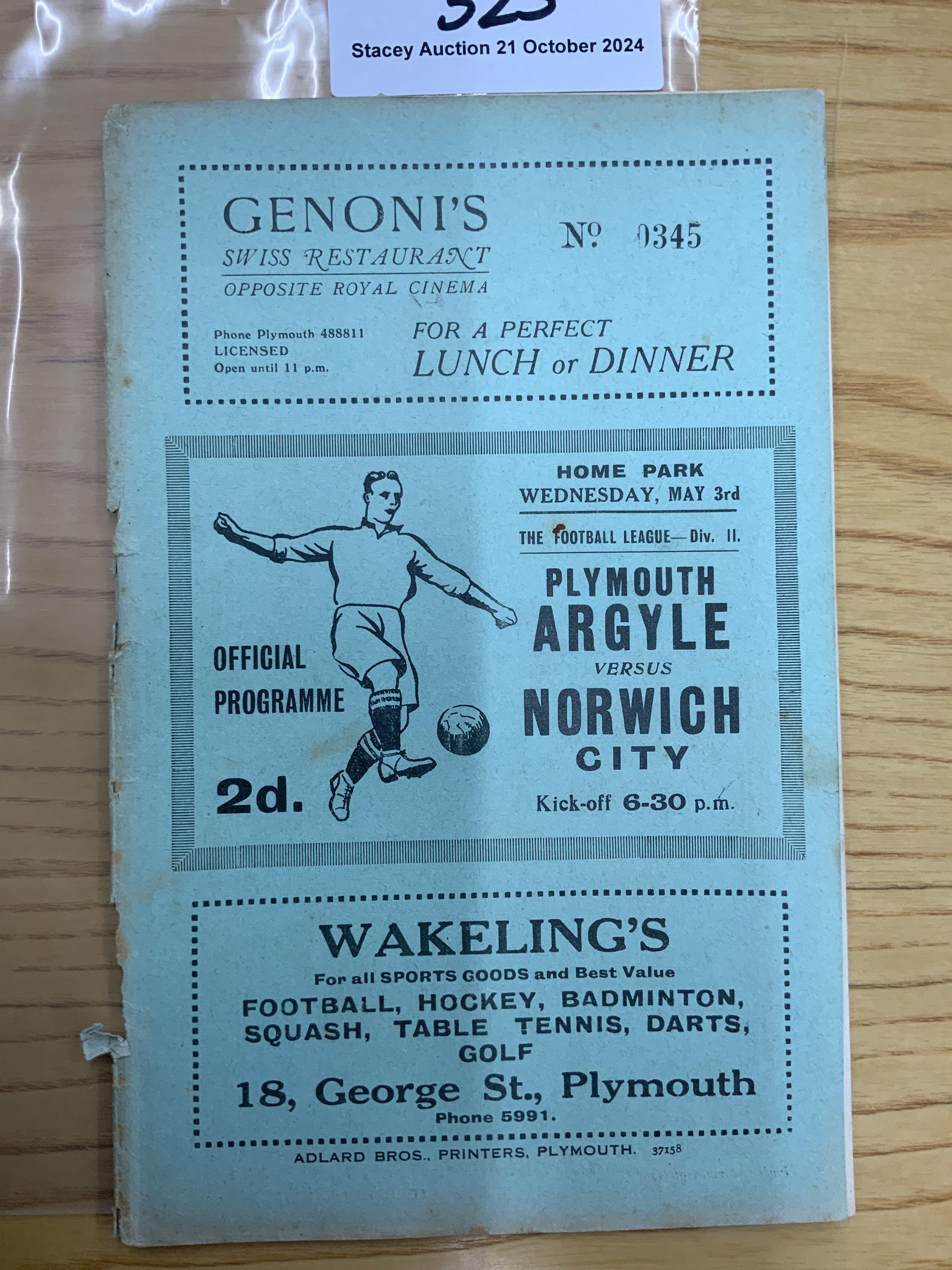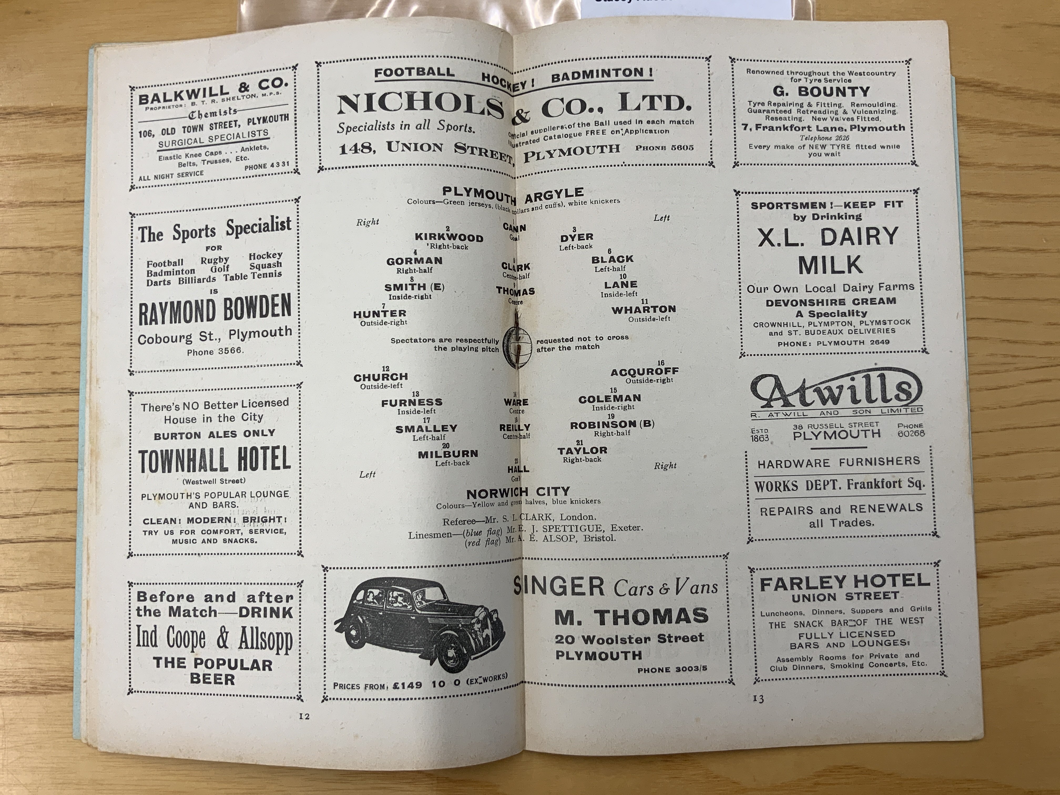 38/39 Plymouth Argyle v Norwich City Football Programme: Fair condition with no team changes although spine has some wear and tiny paper loss to rear edge. League match dated 3 5 1939.
