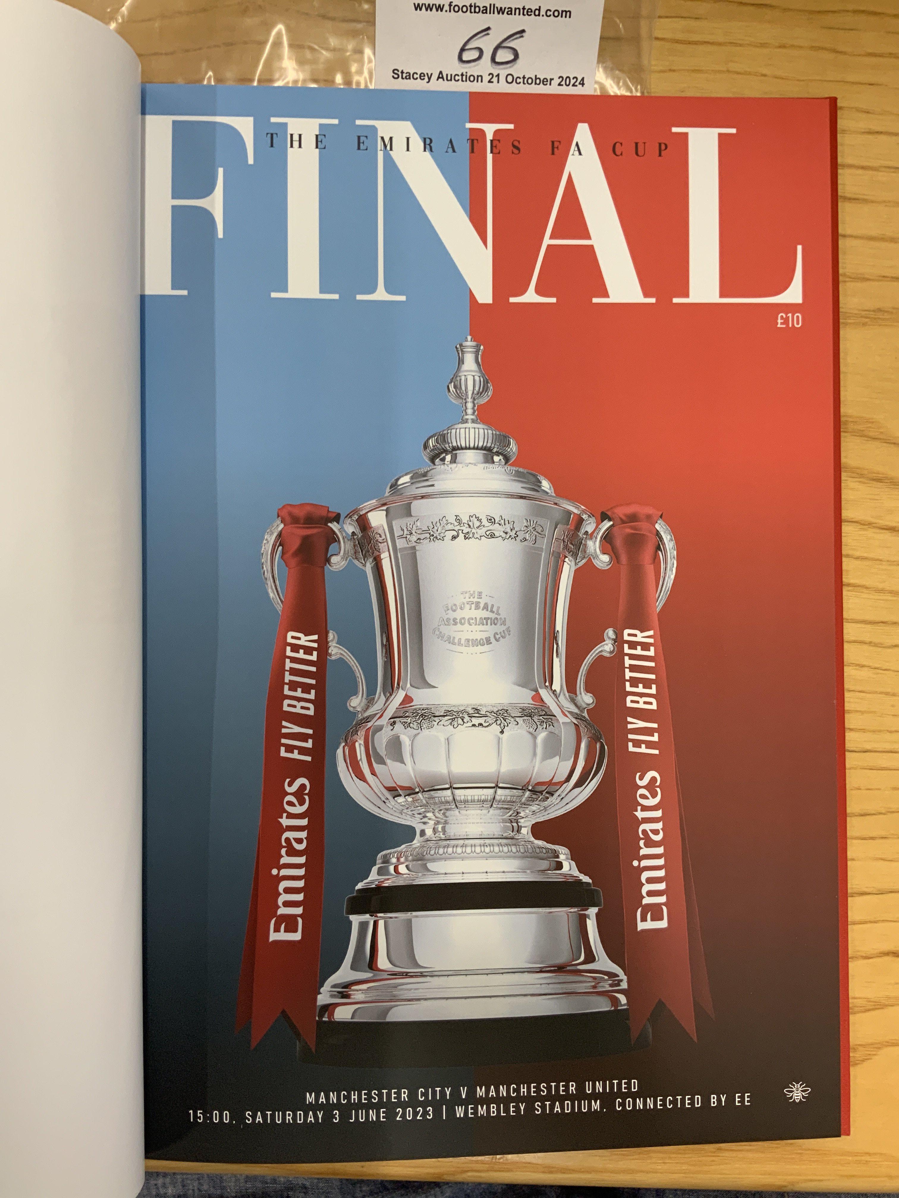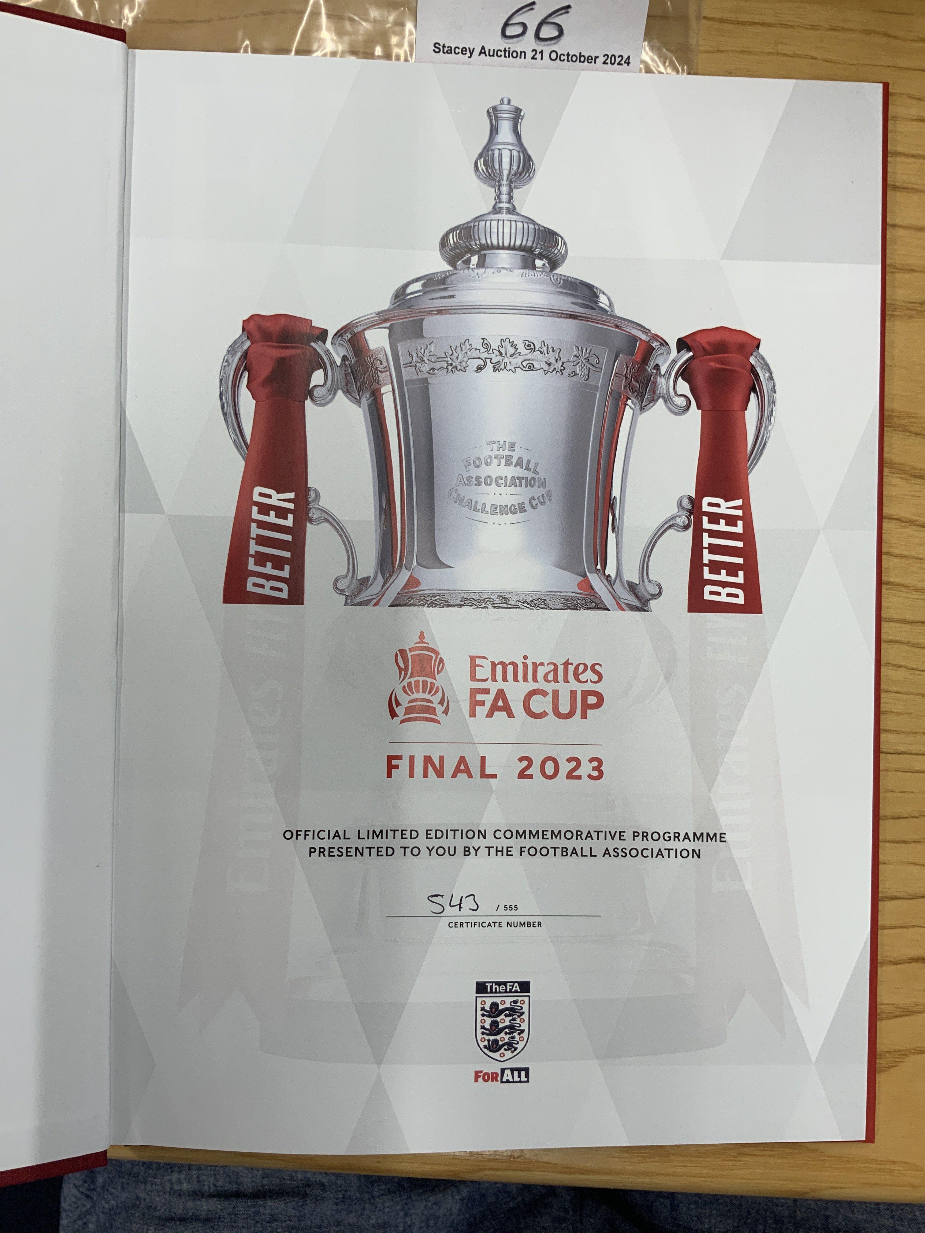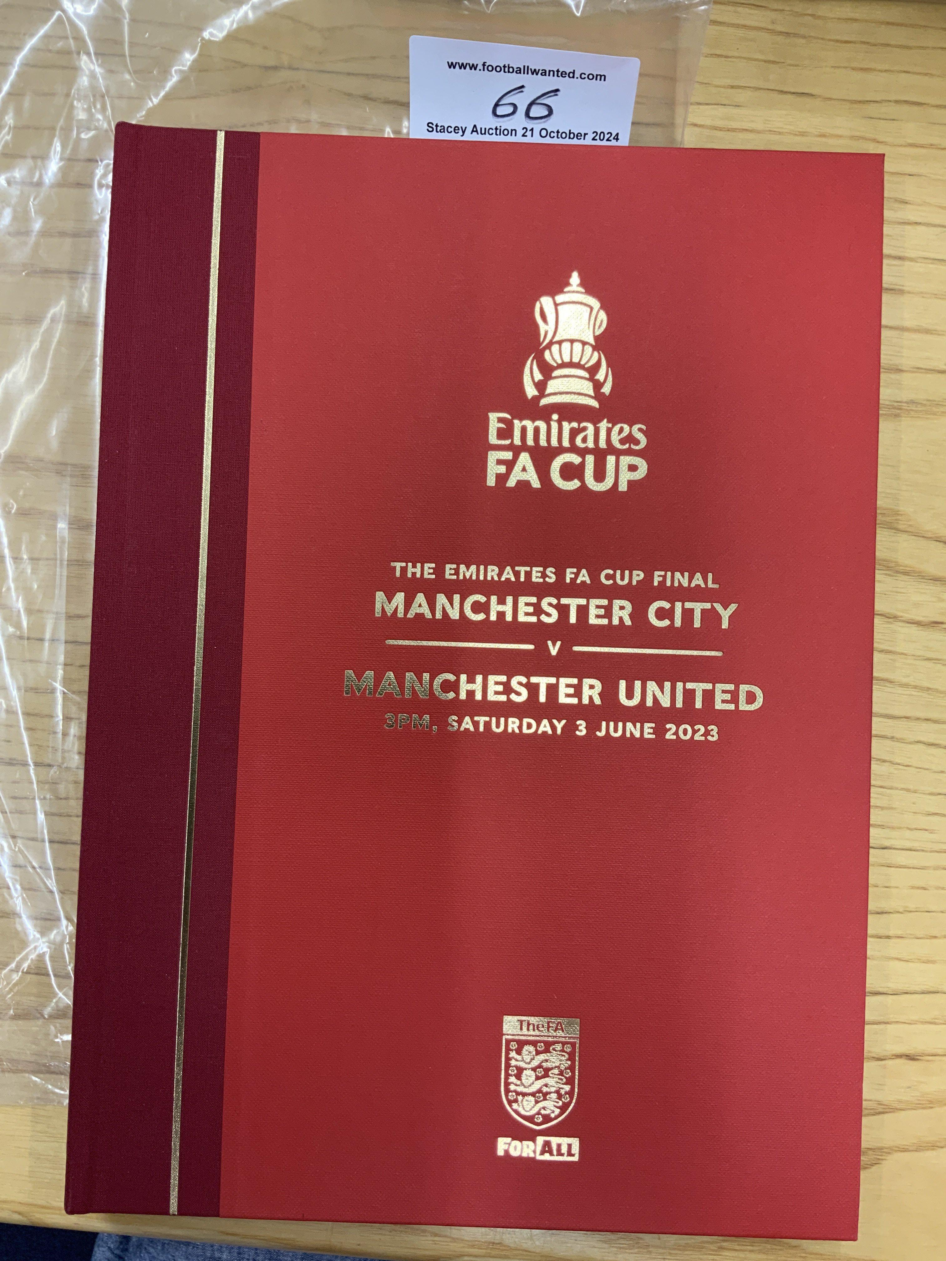 2023 Hardback FA Cup Final Football Programme: Manchester United v Manchester City Ltd edition number 543 of 555. Excellent condition bound in red cover with gold embossing.