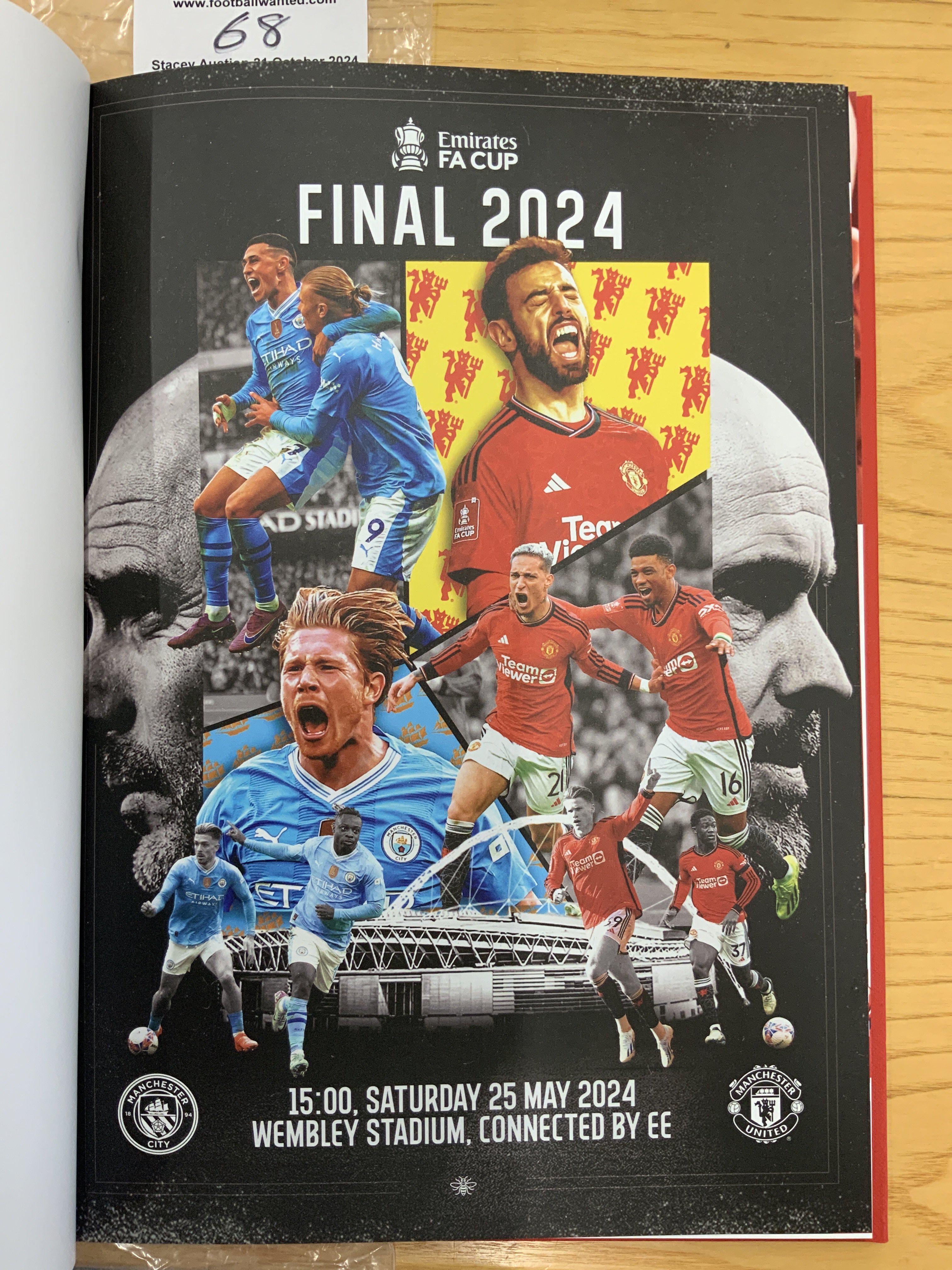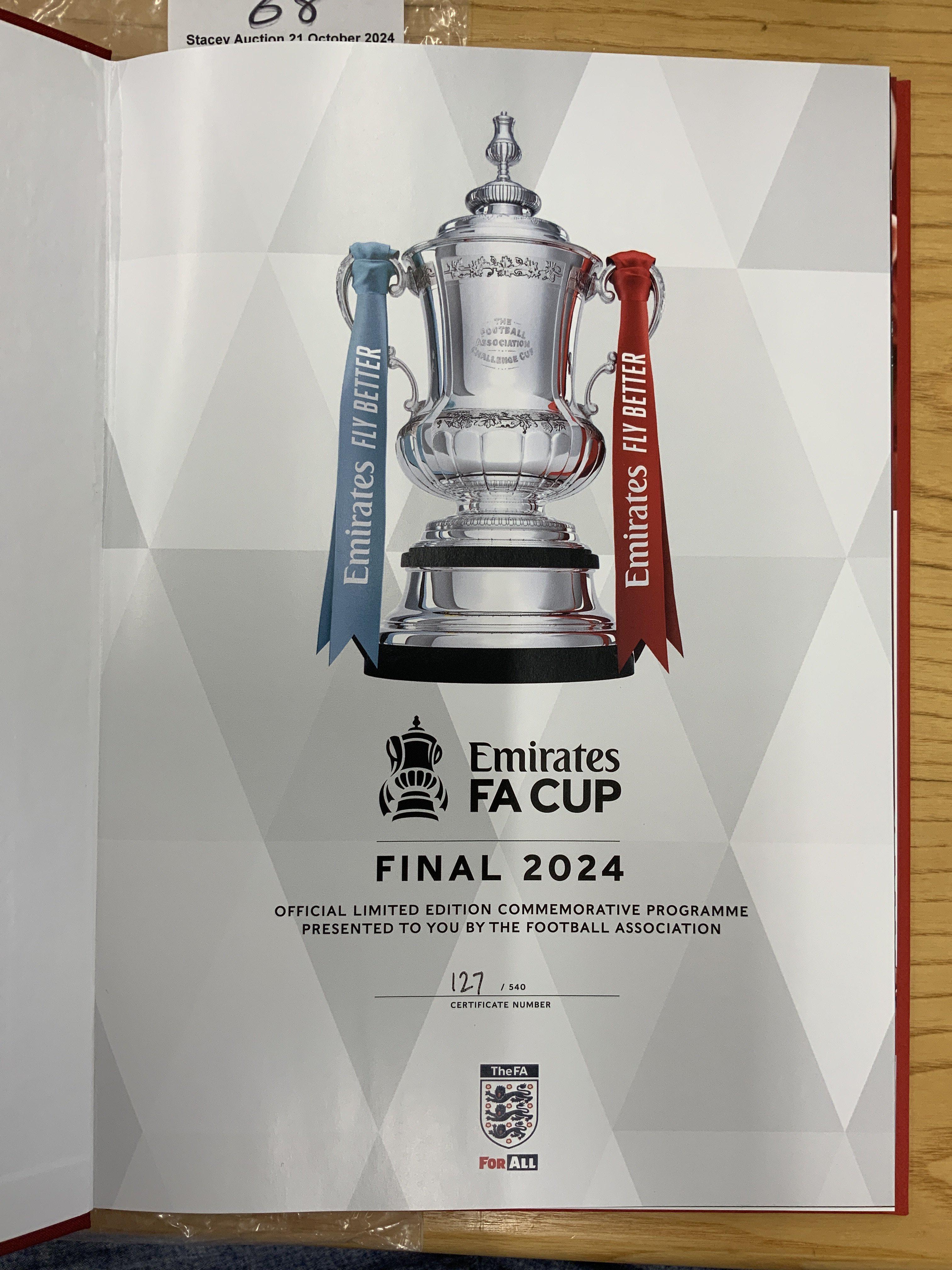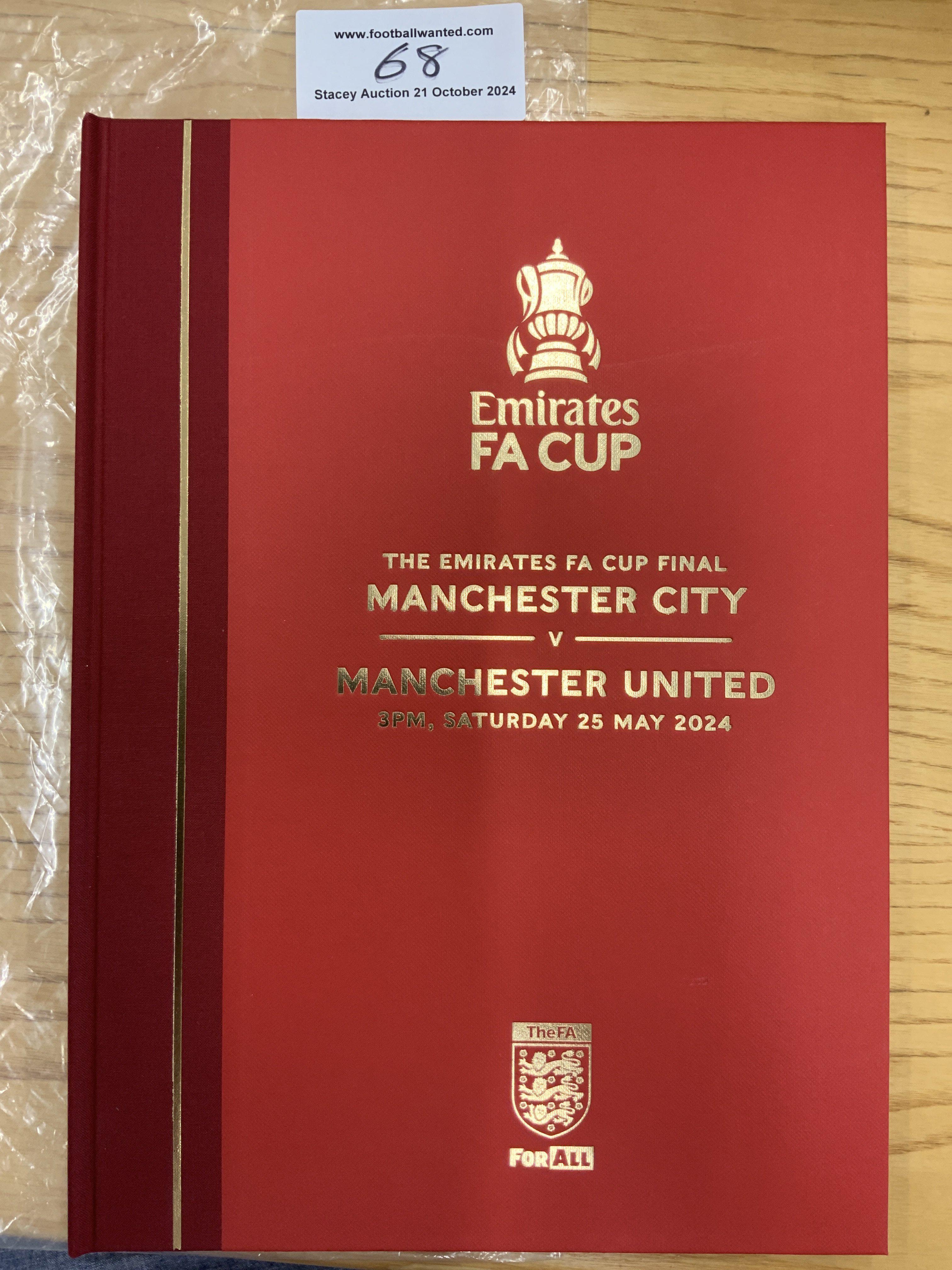 2024 Hardback FA Cup Final Football Programme: Manchester United v Manchester City Ltd edition number 127 of 540. Excellent condition bound in red cover with gold embossing. Not the more common Club Wembley version.