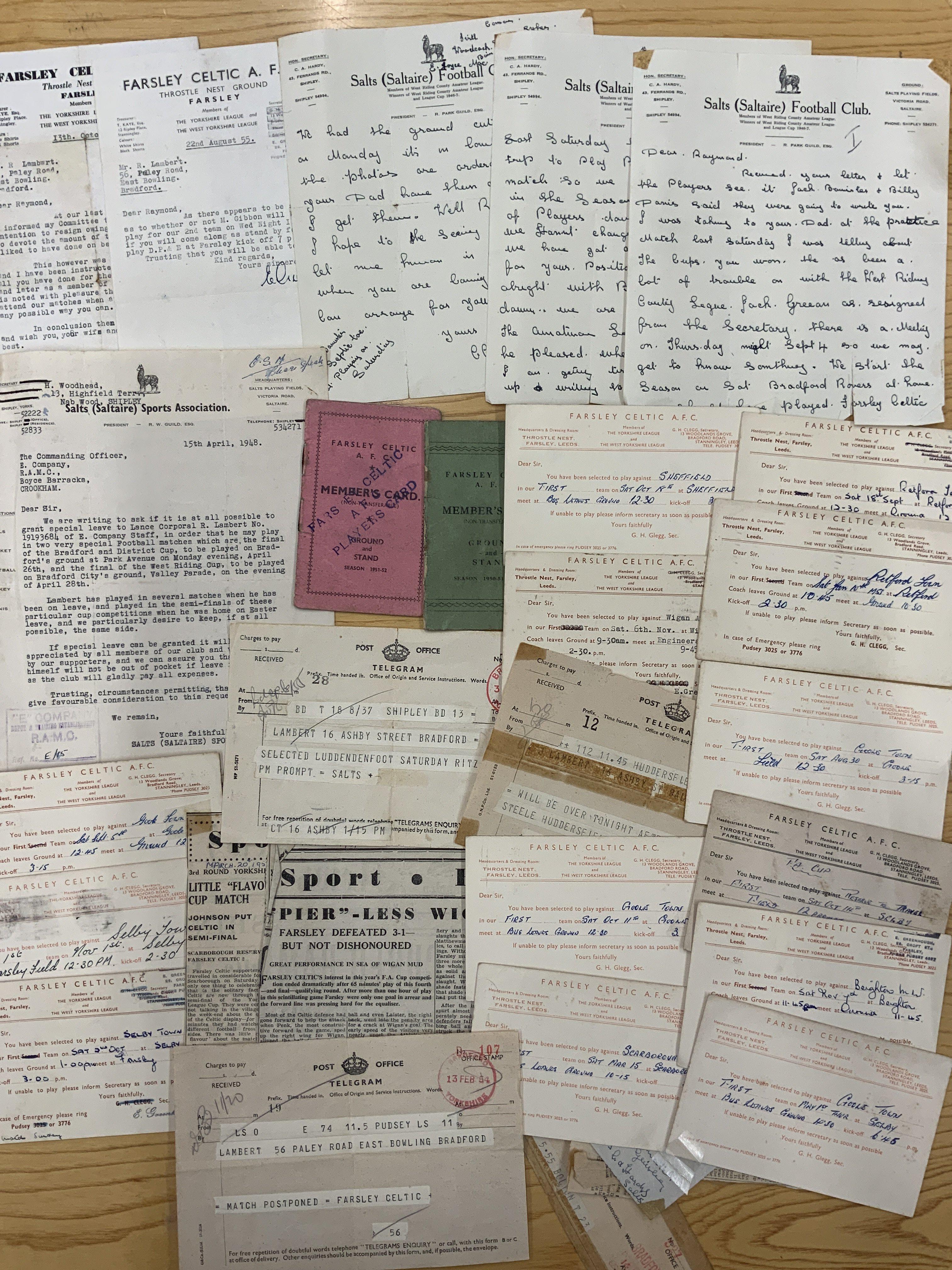 40s + 50s Farsley Celtic Football Memorabilia: Includes selected to play postcard size invites, press reports, telegrams, player membership booklets, letters including Salts football club and items relating to ex player Raymond Lambert.