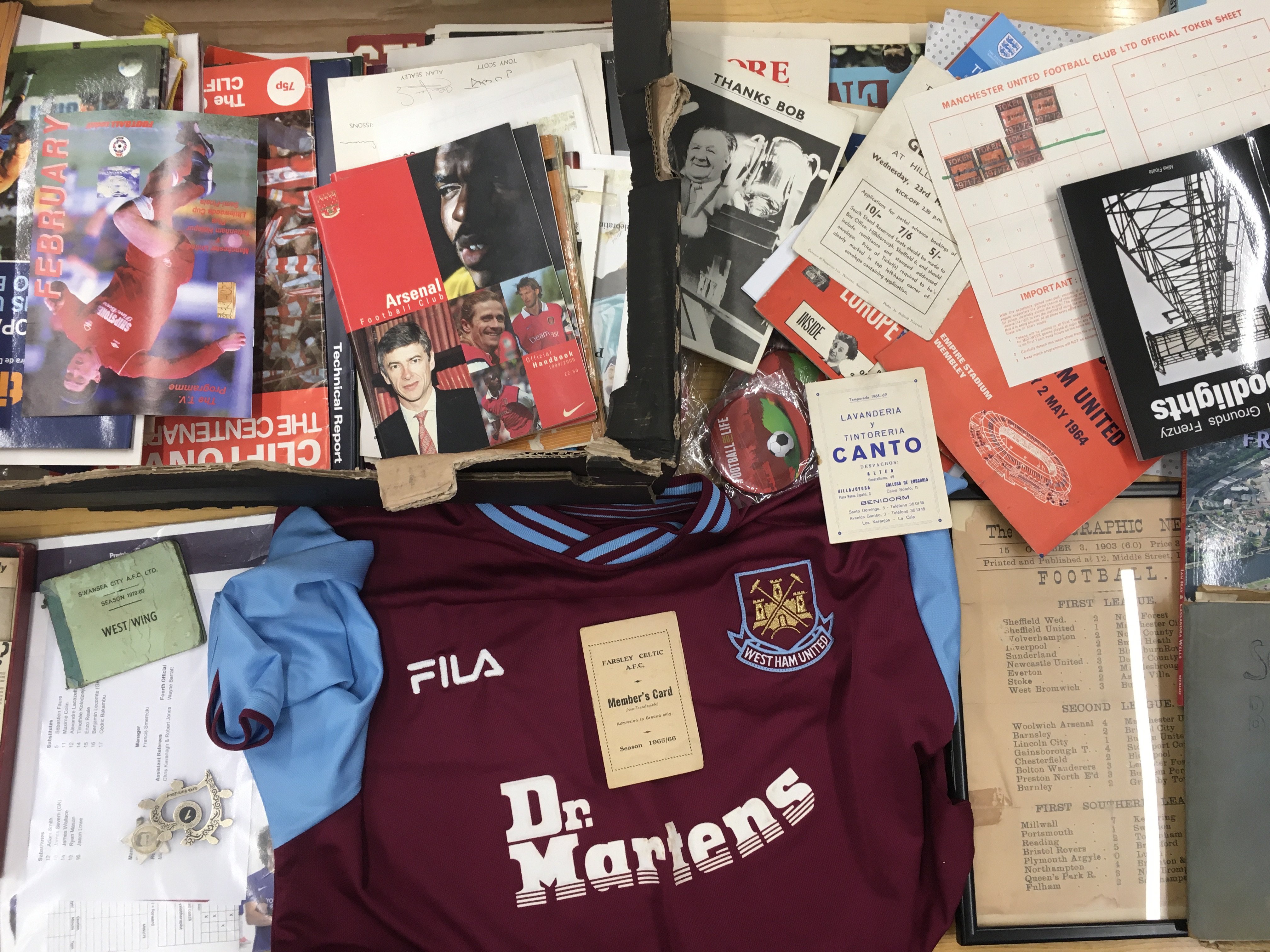 Football Memorabilia Box: West Ham shirt, Newspapers, Team sheets, Menus, Badges, Scrapbooks, Fixtures Lists and more.