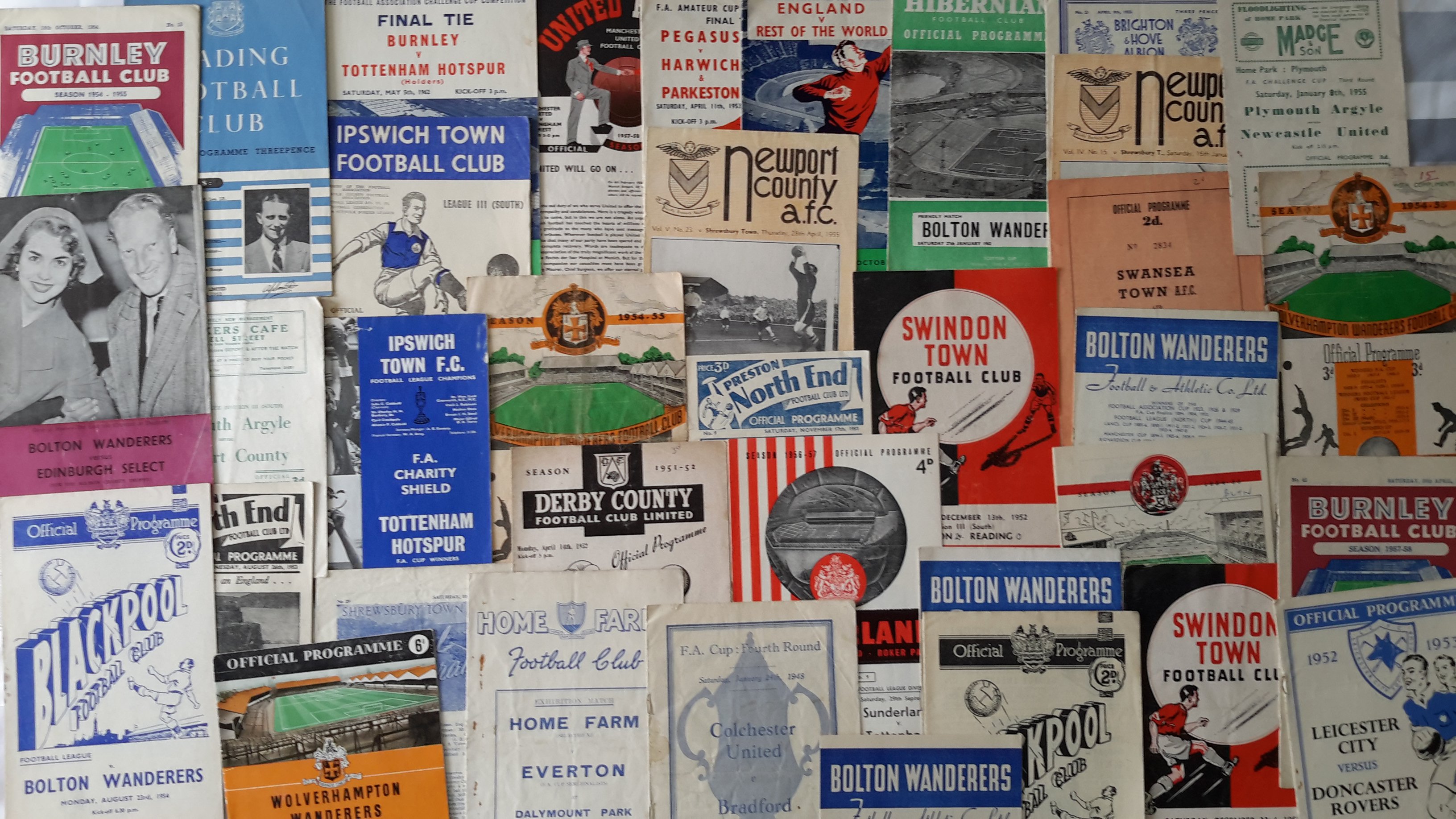 1950s Football Programmes: Includes 47/48 Colchester United v Bradford Park Ave, 50/51 Blackpool v Newcastle, 51/52 Plymouth v Newport, Derby v Portsmouth, 52/53 Home Farm v Everton, Amateur Cup Final, England v Rest of the World. 98 often mid 50s with a further 6 later to include 1962 Charity Shield Ipswich v Tottenham. Fair/good. (104)