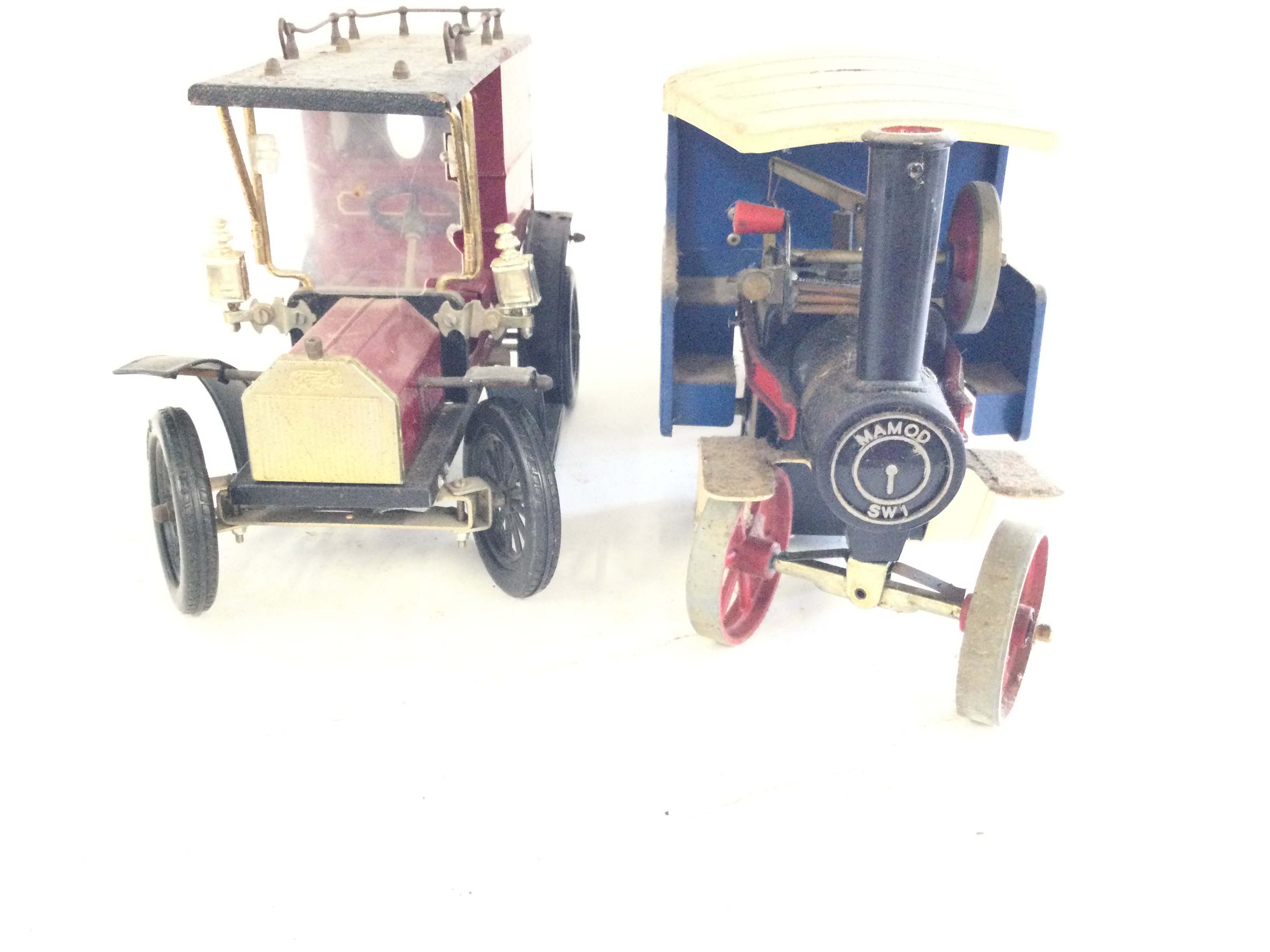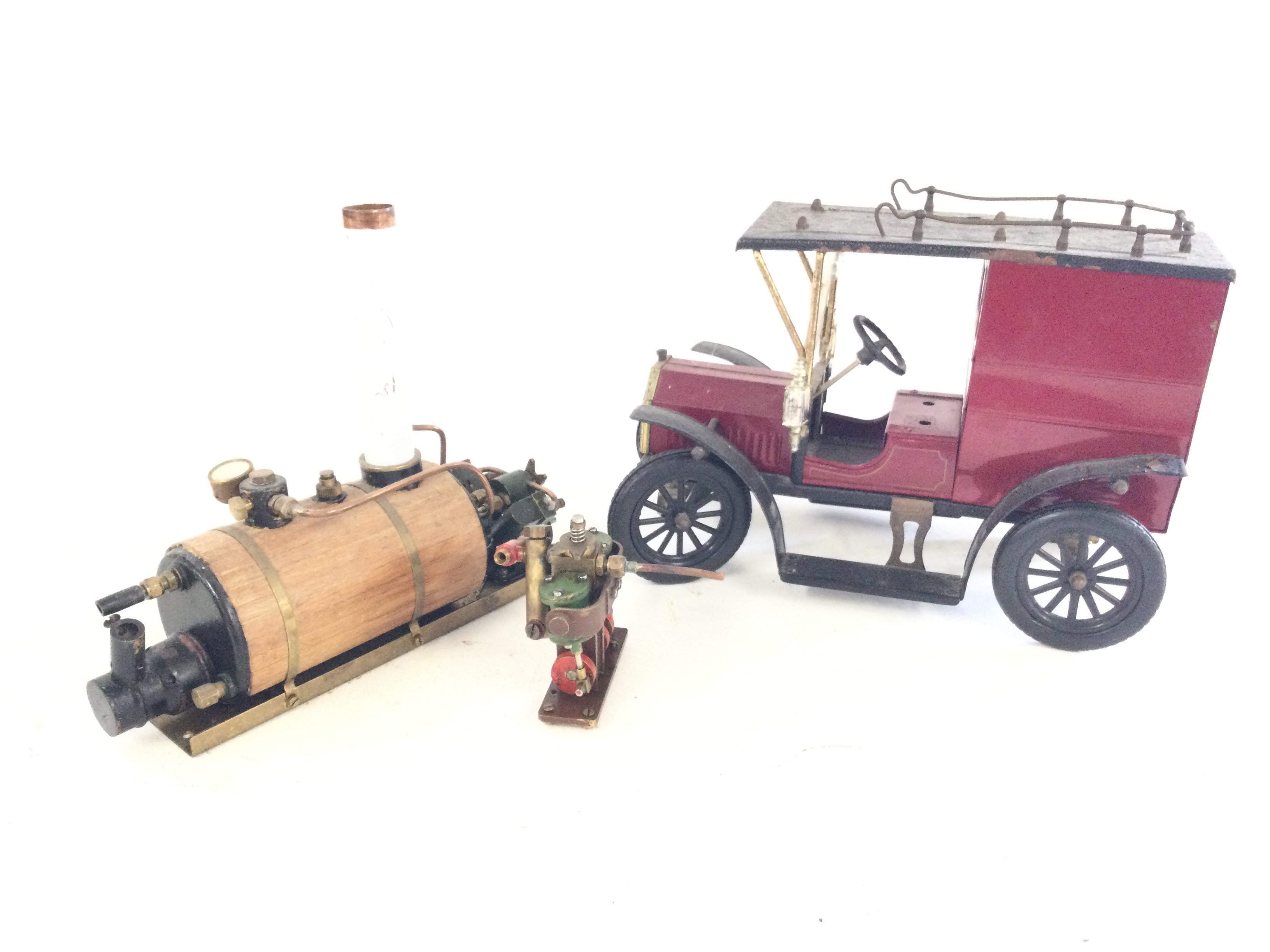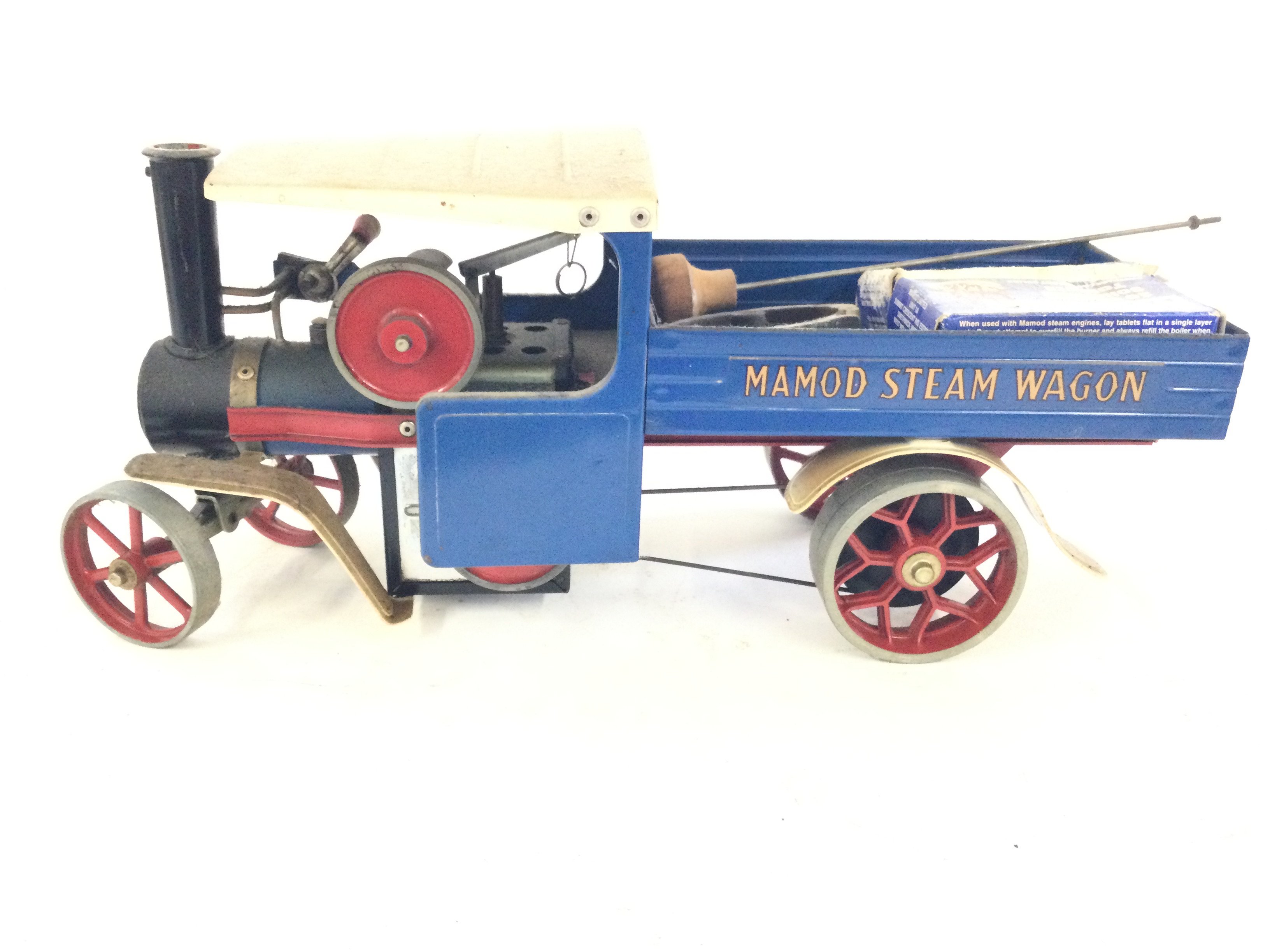 A box containing a Mamod Steam Wagon, a model of a vintage ford car. Plus some I̢ve steam engine models.
