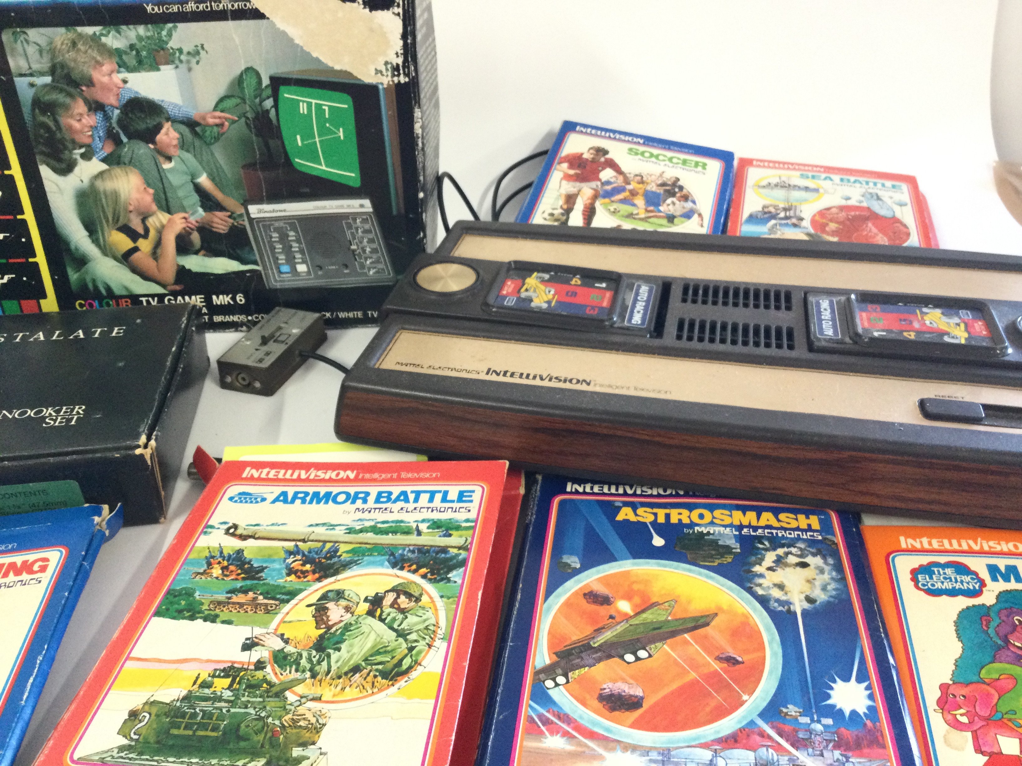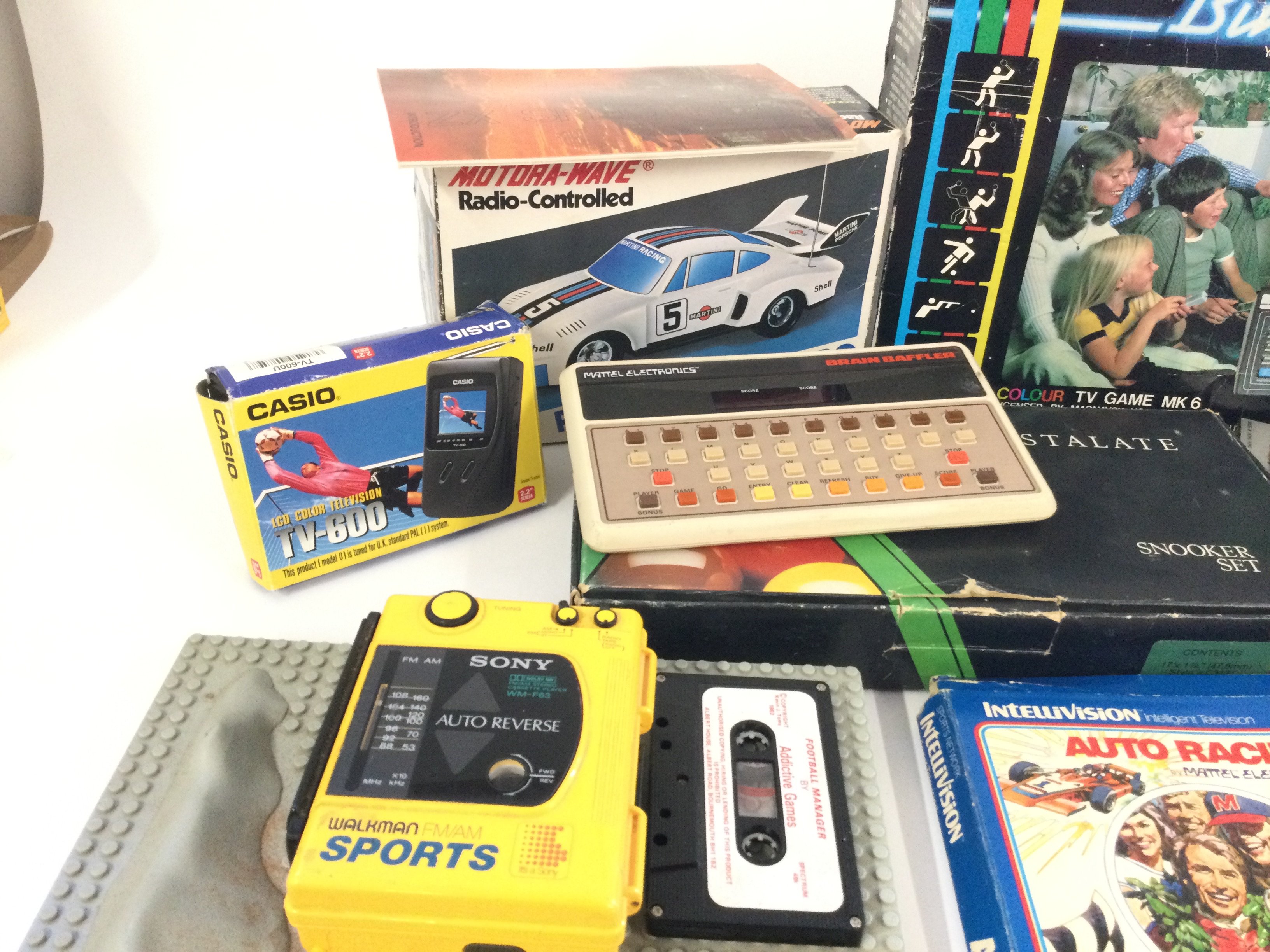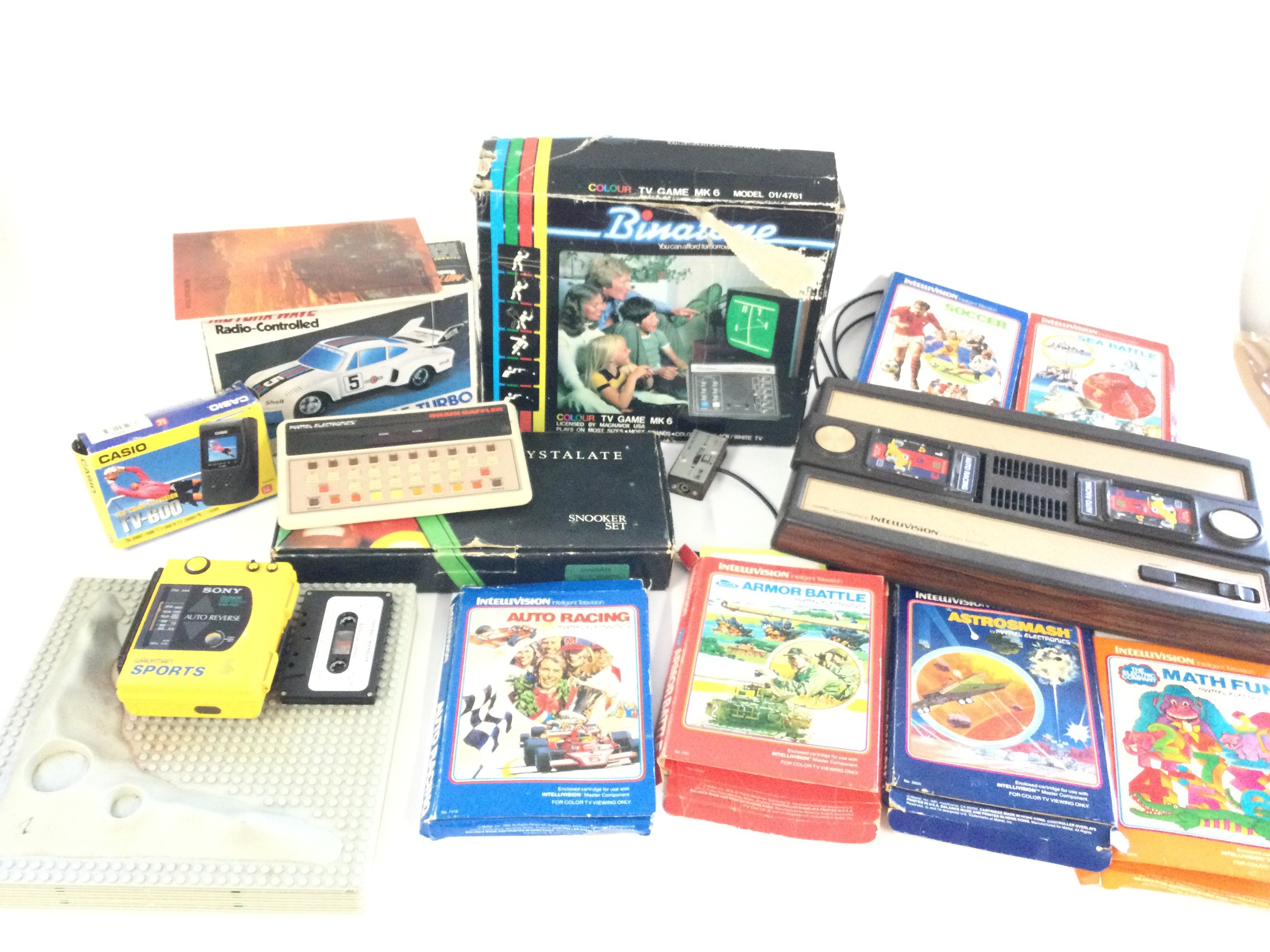 A box containing a Mattel Intellivision plus 6 games, also a Mattel Brain Baffler, a Sony Walkman Sports, a boxed Binatone colour TV game, a Boxed Casio TV-600 pocket TV, a Boxed Motora-wave car, plus a set of Crystalite snooker balls.