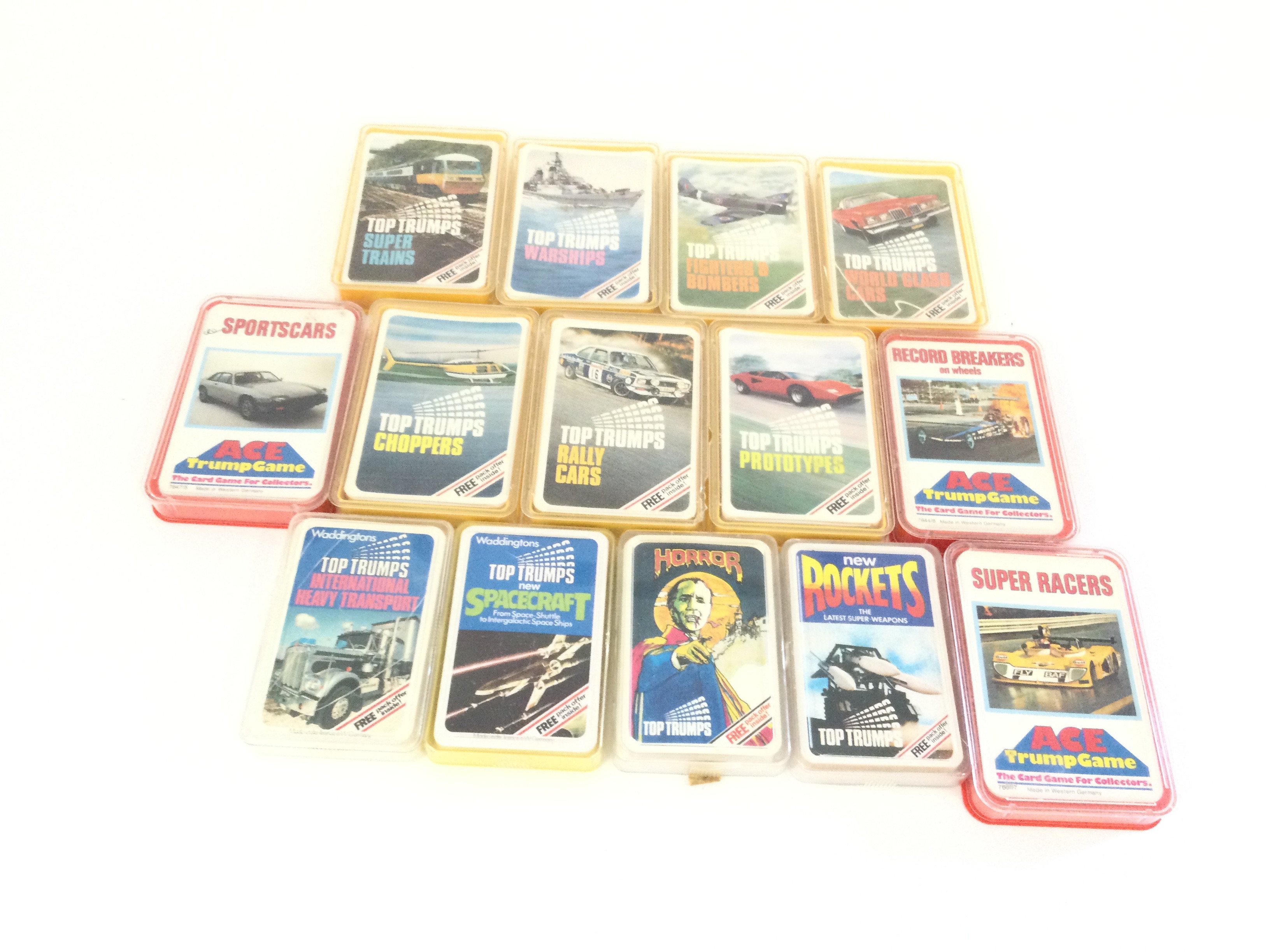 A box containing 14 packs of vintage Top Trumps cards, including a set of ̢Horror̢ cards.