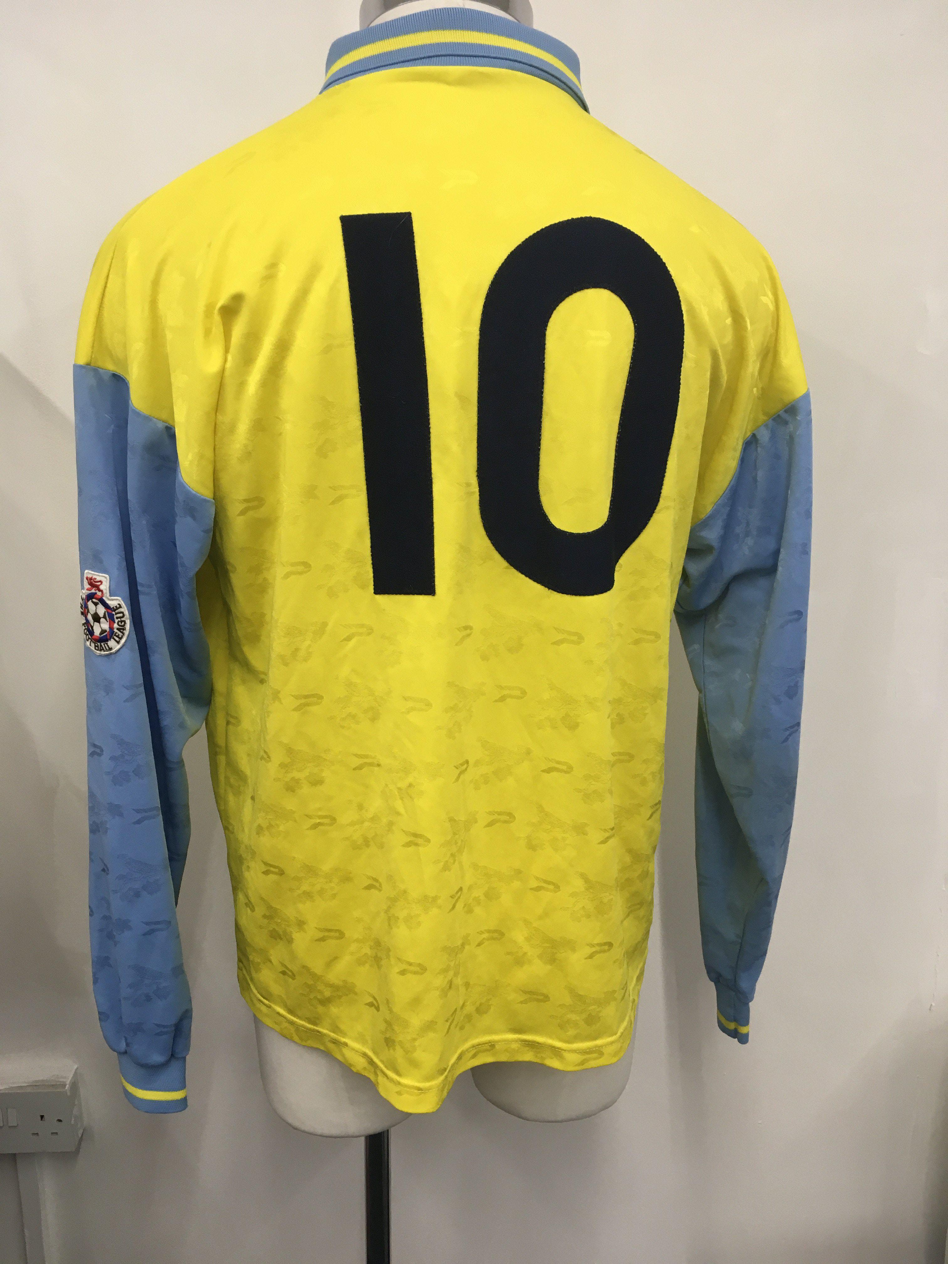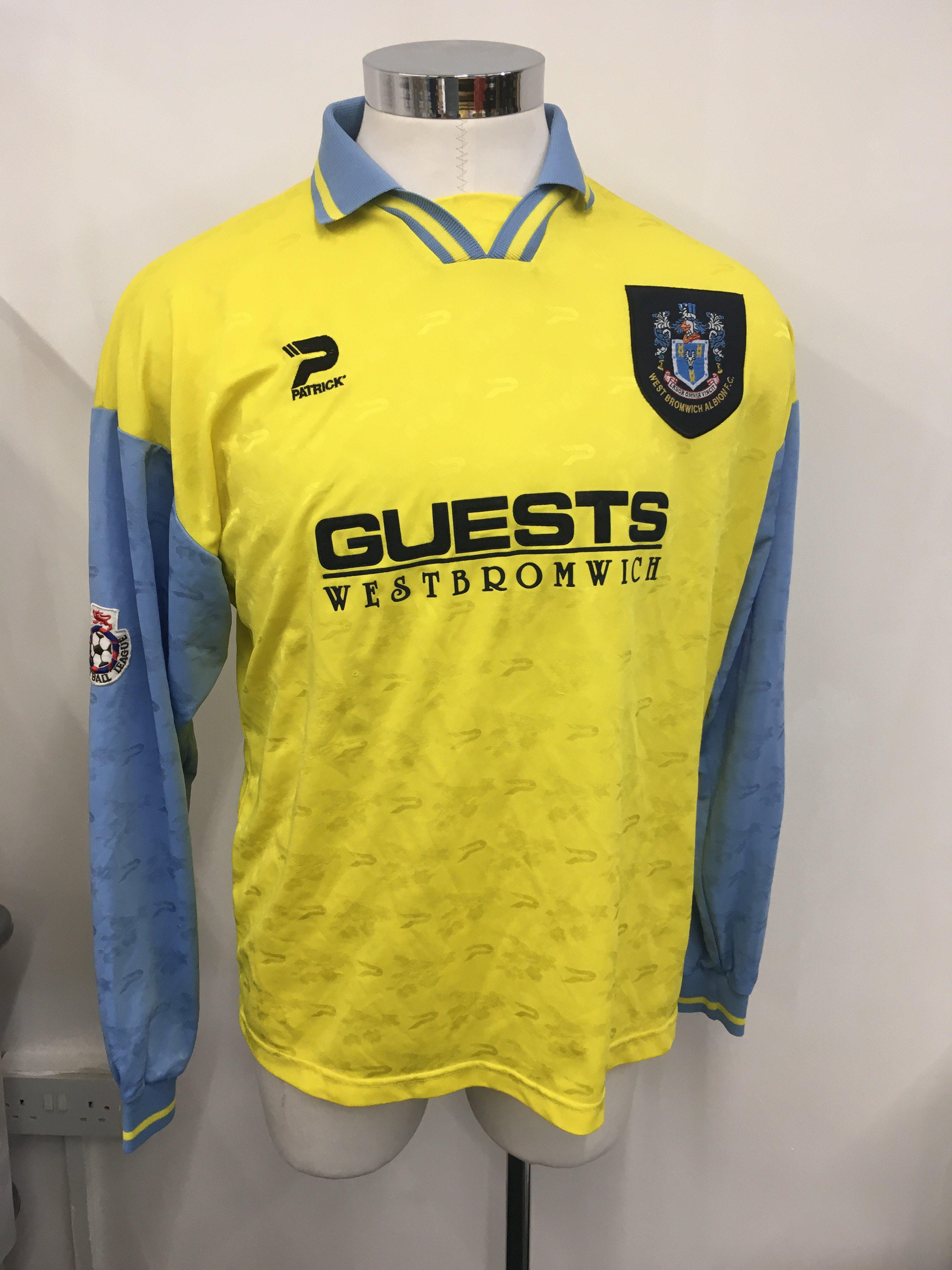 West Brom 1995 - 1996 Match Worn Football Kit. Away long sleeve shirt with Football league badging to arms. Number 10 to rear. Worn by Andy Hunt during the season. Some wear to the shorts. Unwashed kit.