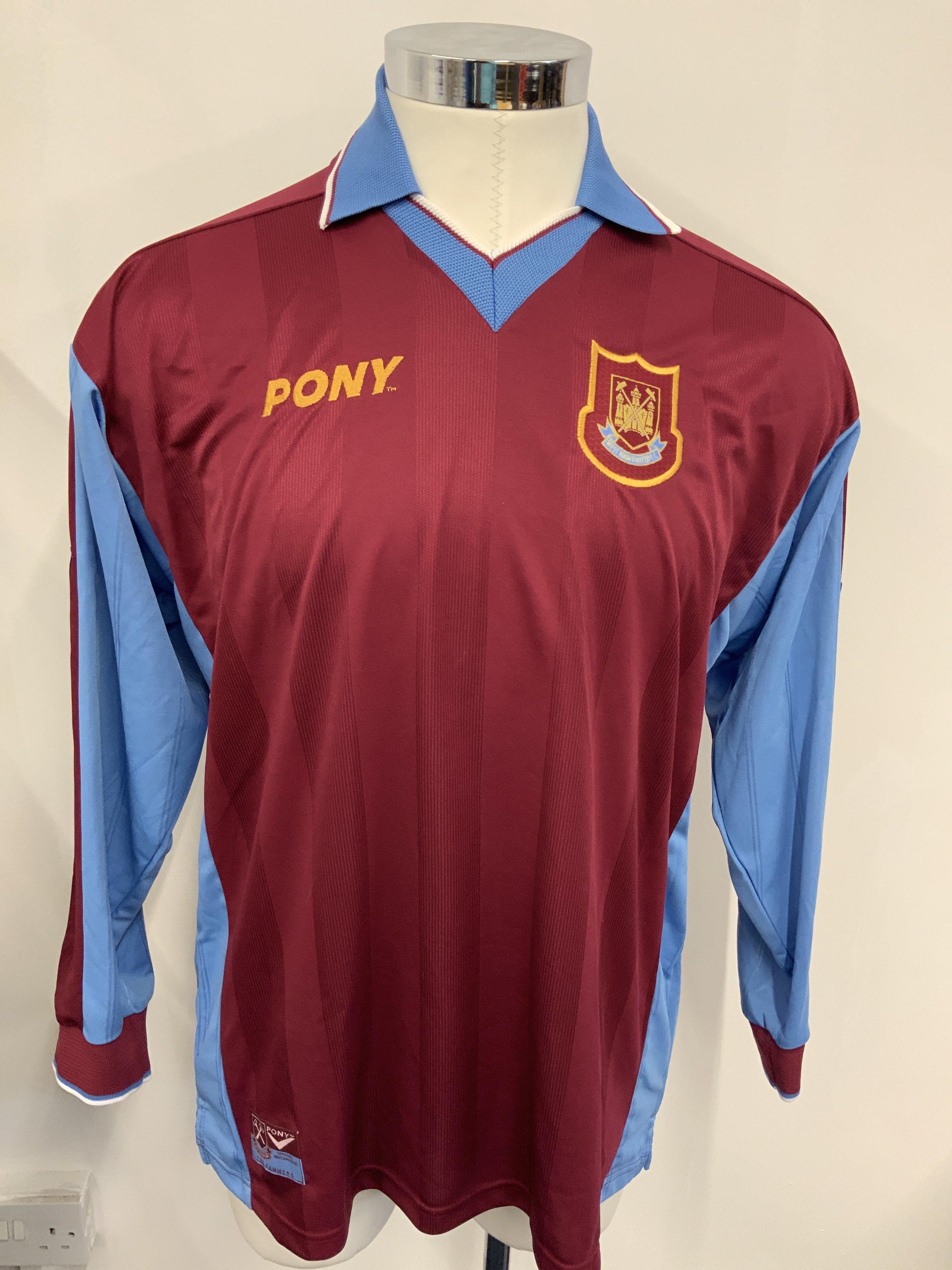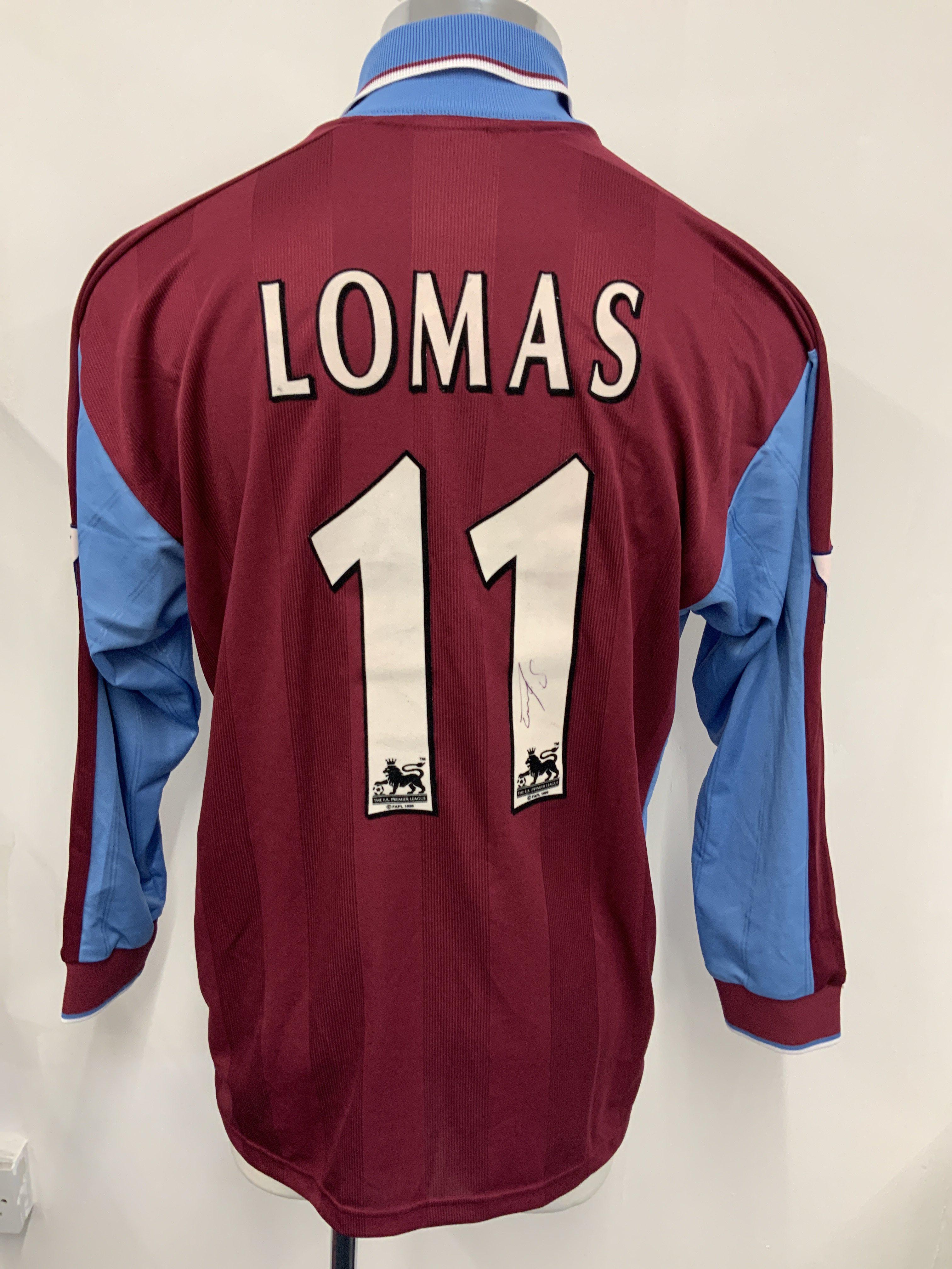 West Ham 1997 - 1998 Match Worn Football Shirt: Home long sleeve shirt with Premier league badging to arms. Lomas Number 11 to rear. Signed by player to the number.