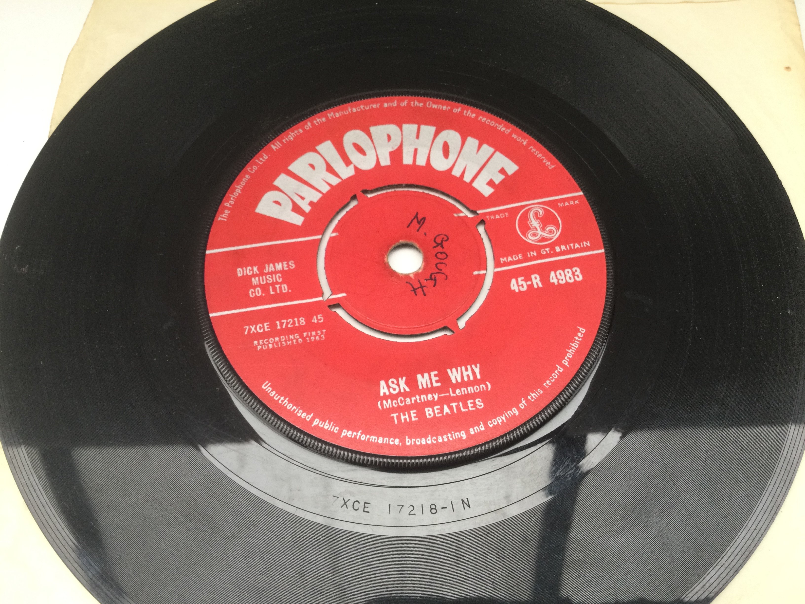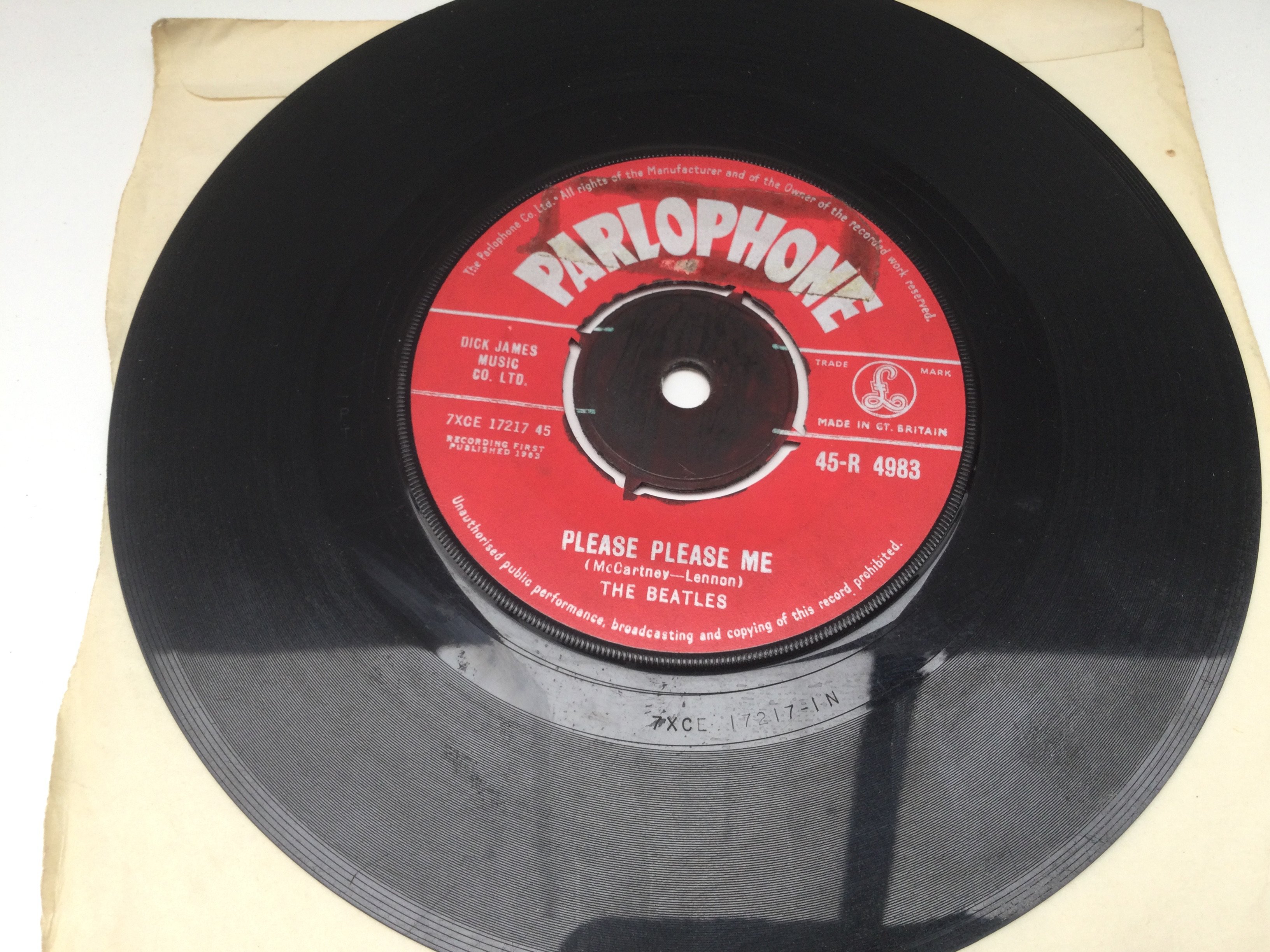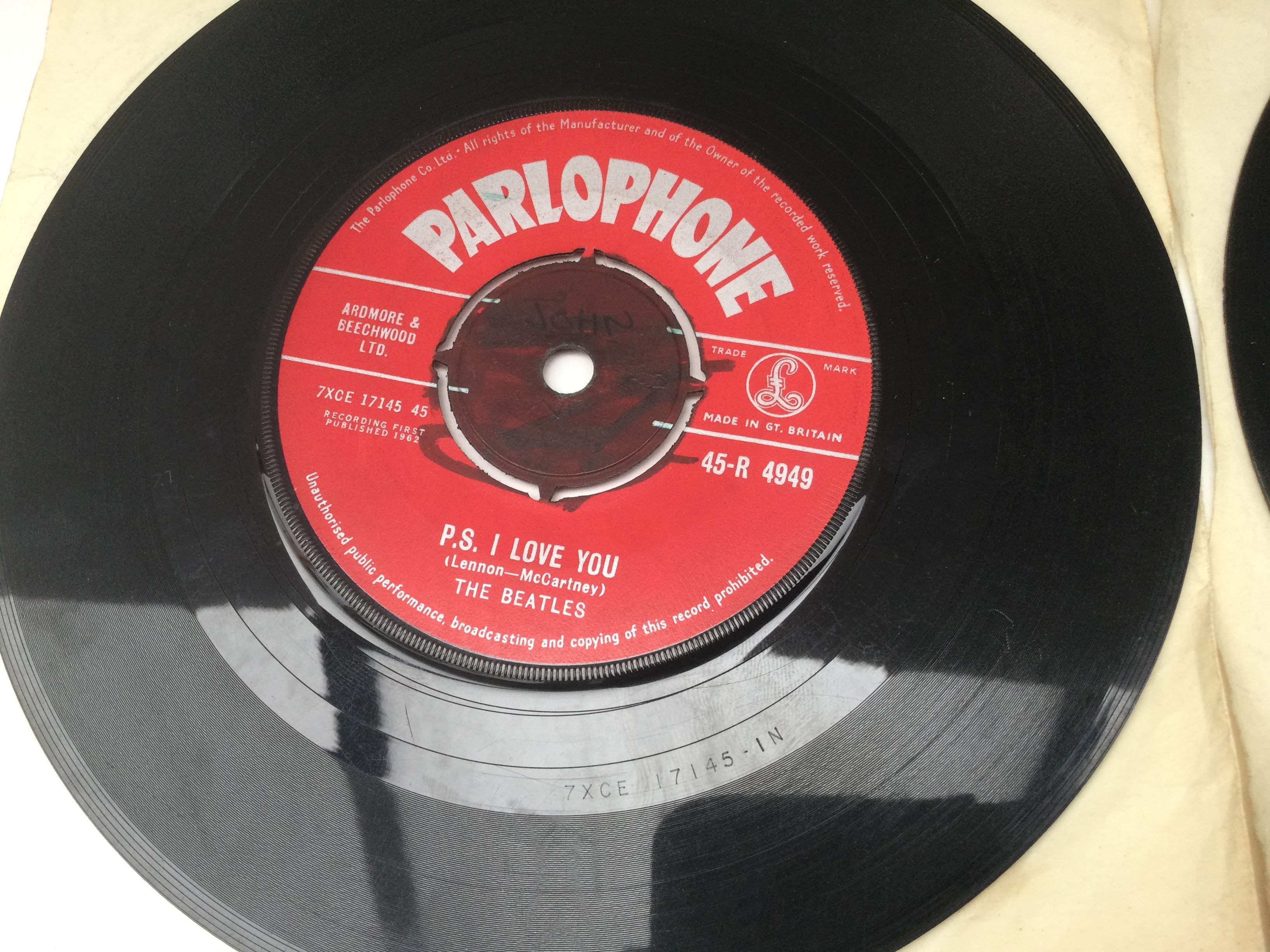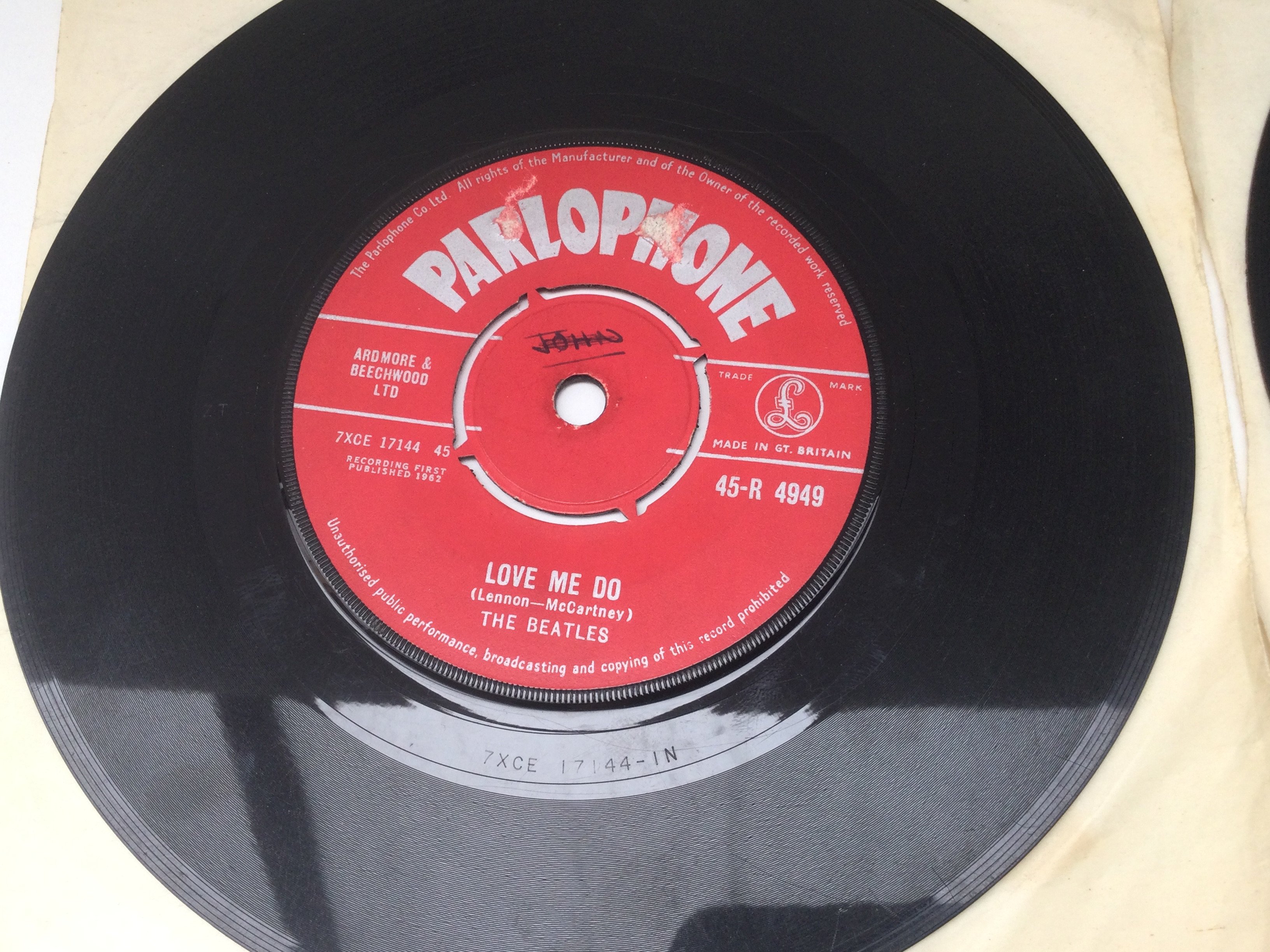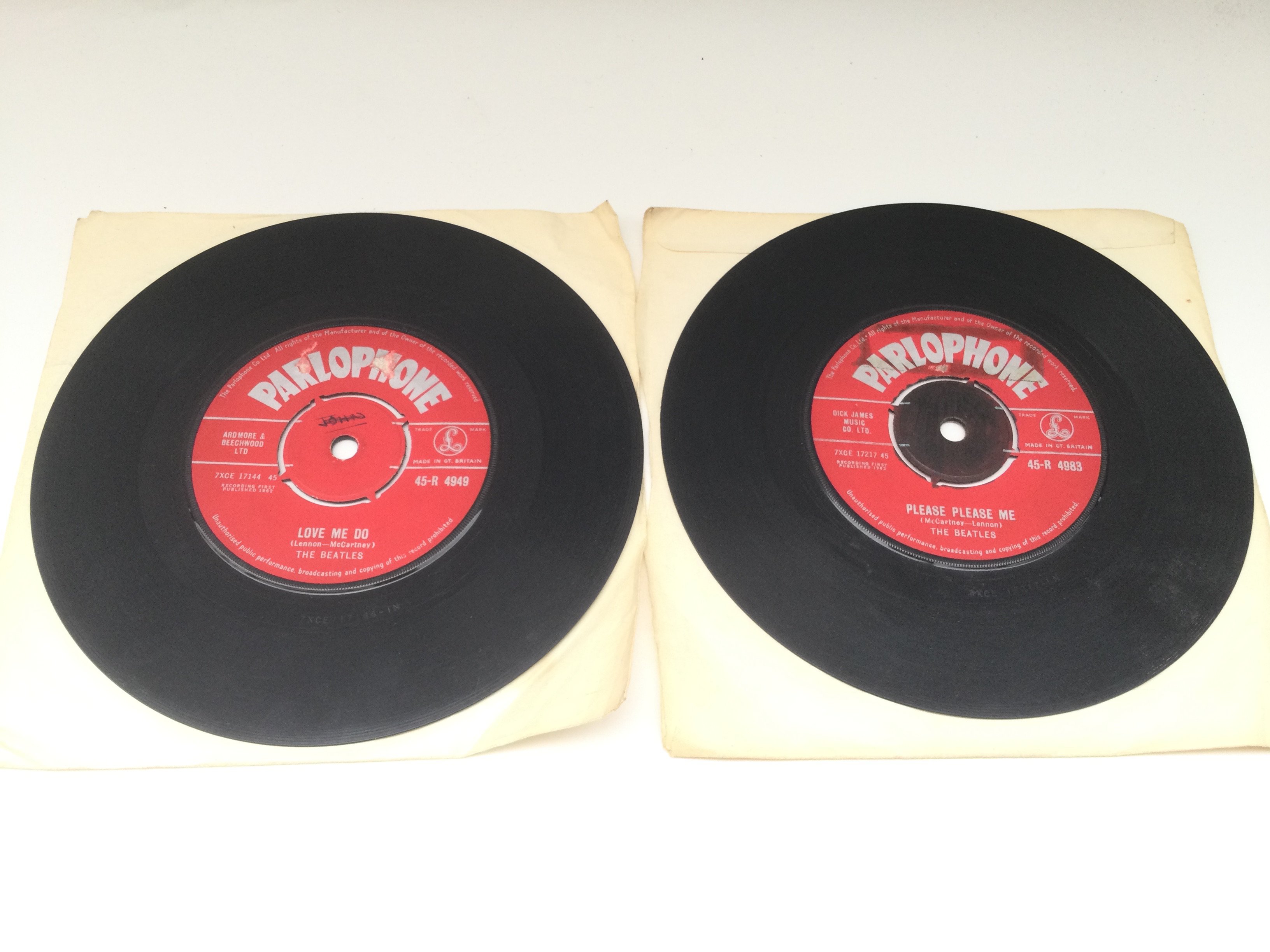 Two early UK pressings of Beatles 7" singles comprising red label issues of 'Love Me Do' and 'Please Please Me'. Both with Made in Gt Britain label text and The Parlophone Co Ltd rim text. ZT tax code for 'Love Me Do' indicating a pre November 1962 pressing. Scratch to the run out grooves on side A, writing and pen marks on label for Love Me Do. No scratches on Please Please Me but similar writing and pen marks to label.