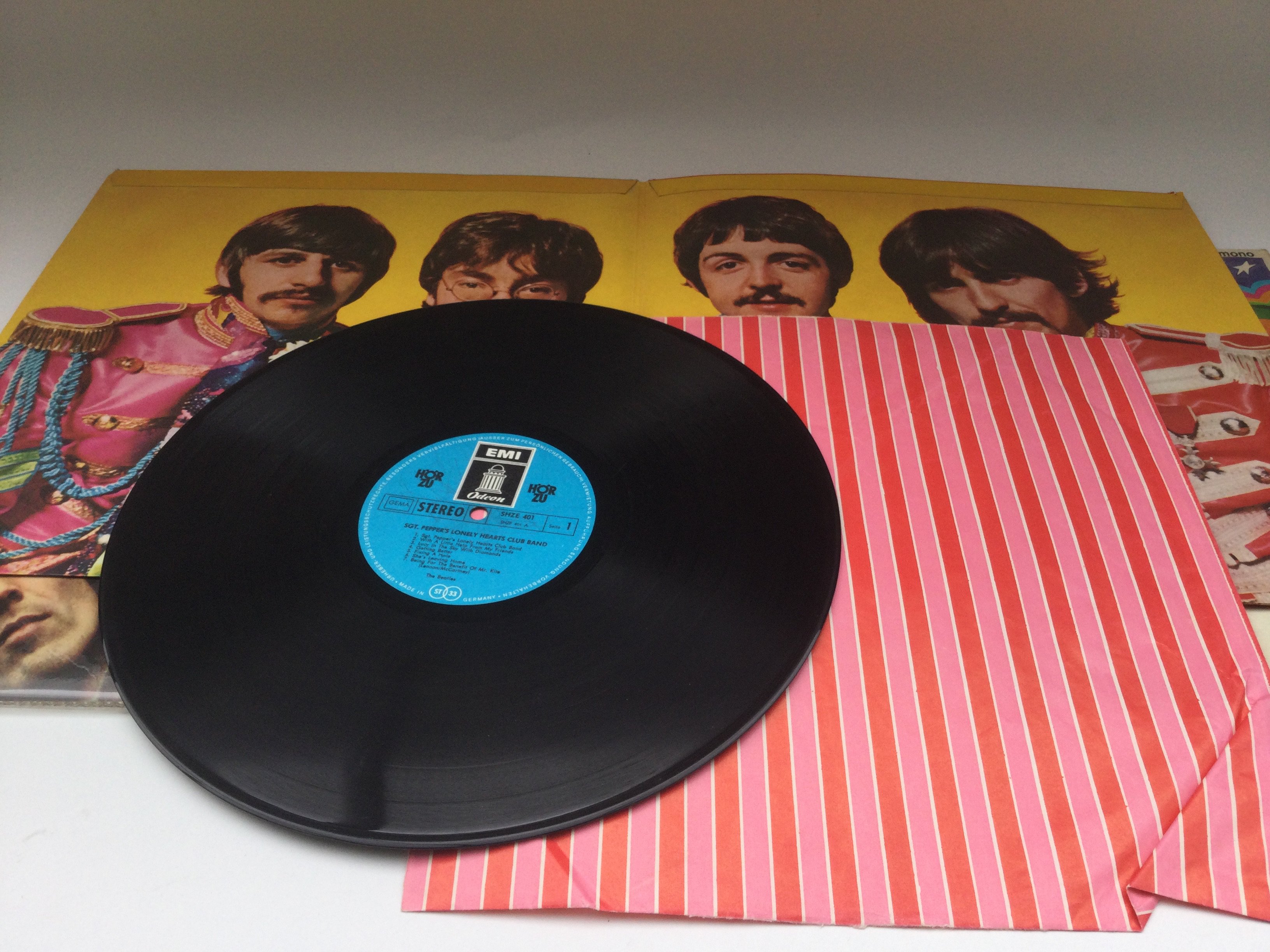 Three Beatles LPs comprising a German pressing of 'Sgt Pepper', feelable scratch on Side A, plus 'Rubber Soul' and 'A Collection Of Beatles Oldies'.
