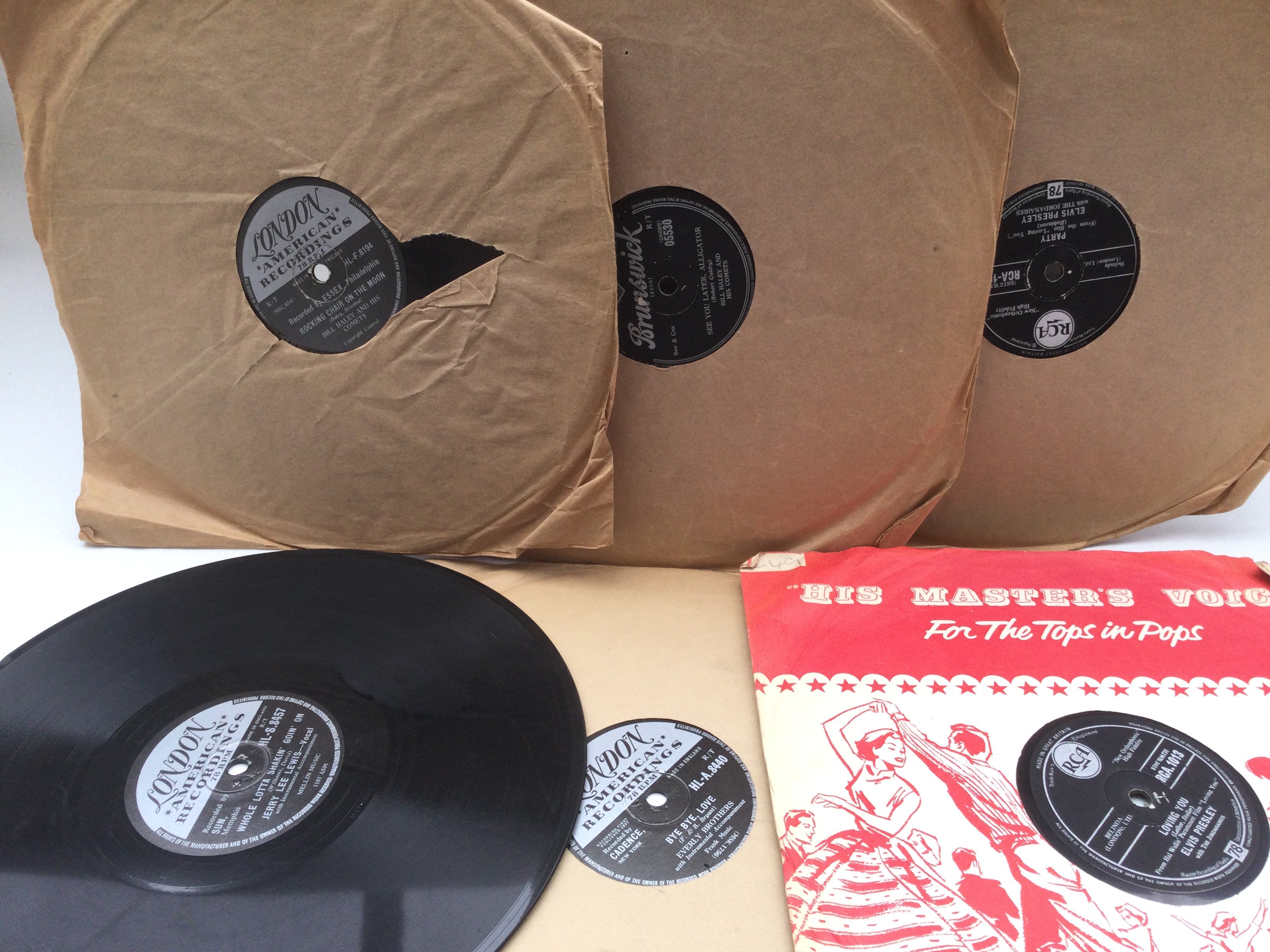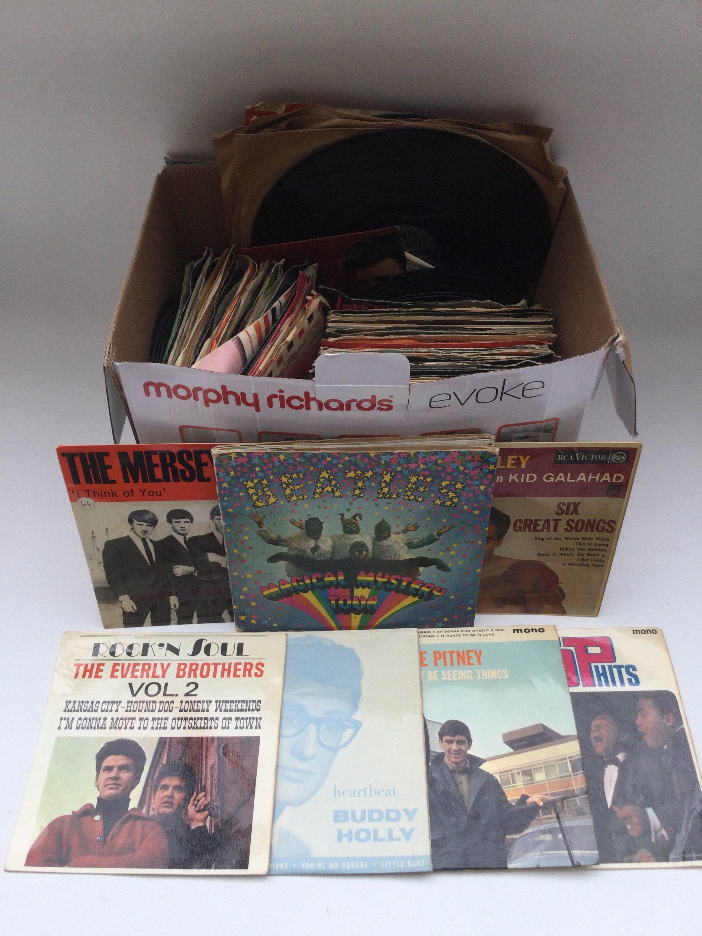 A box of 7" singles, EPs and 78s by various artists including Elvis Presley, The Beatles, Jerry Lee Lewis and many more.