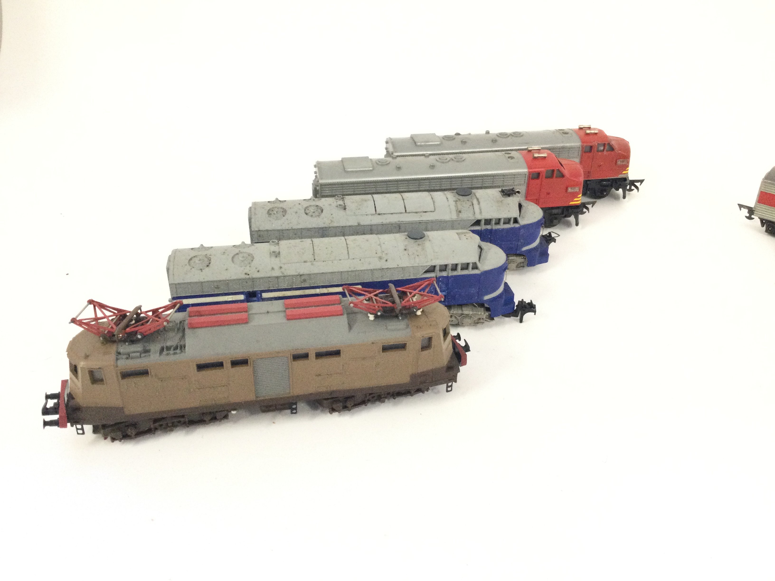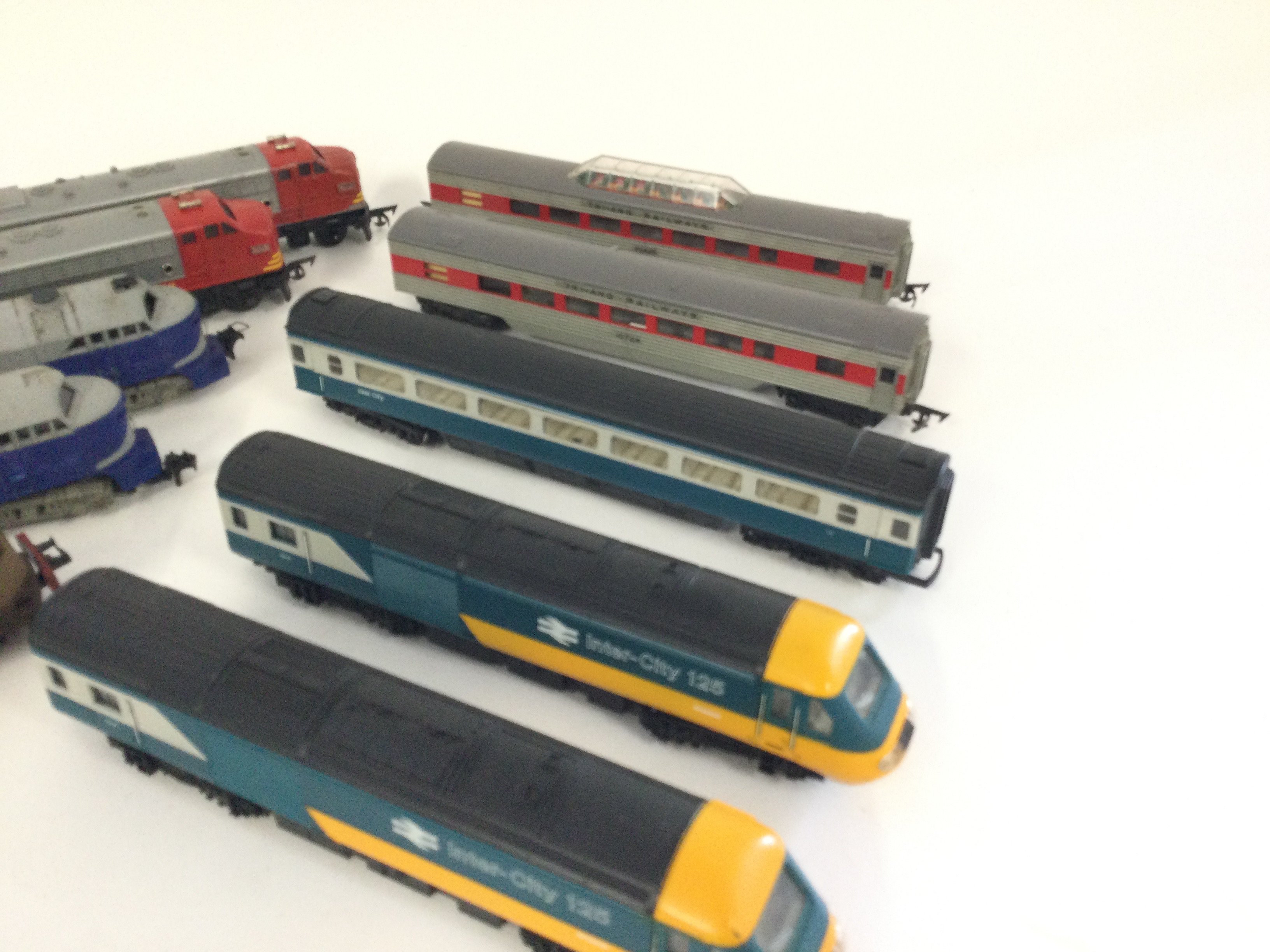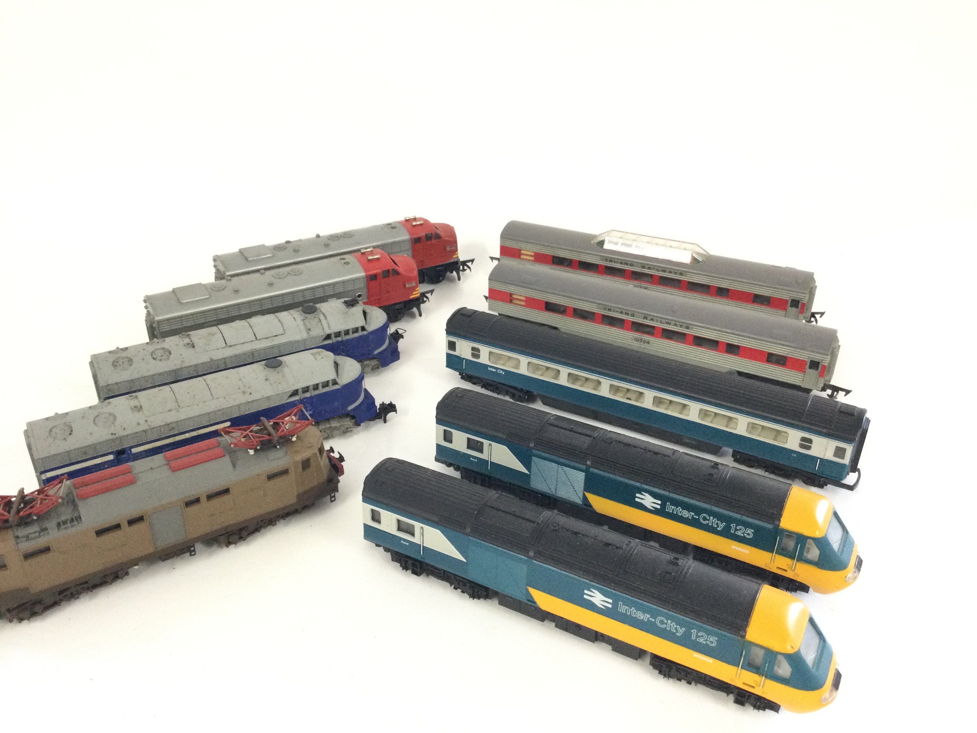 A box of assorted Hornby locos. Ic125 3 car set Triang railway transcontinental set 4 cars Rivarossi Wabash motor and dummy units plus 1 other.