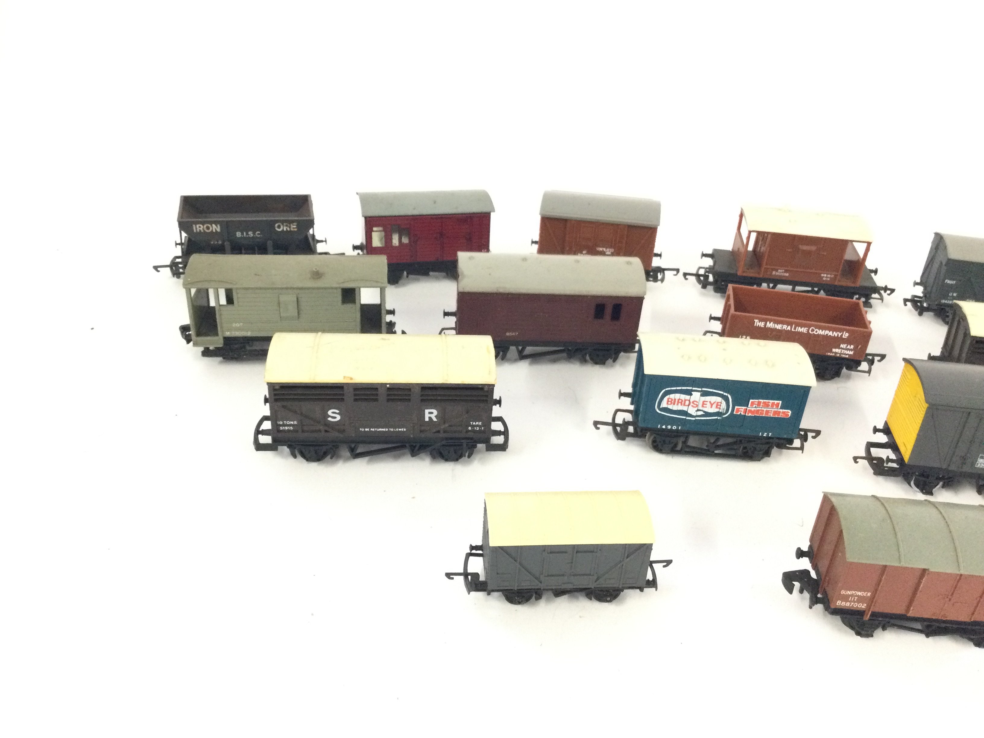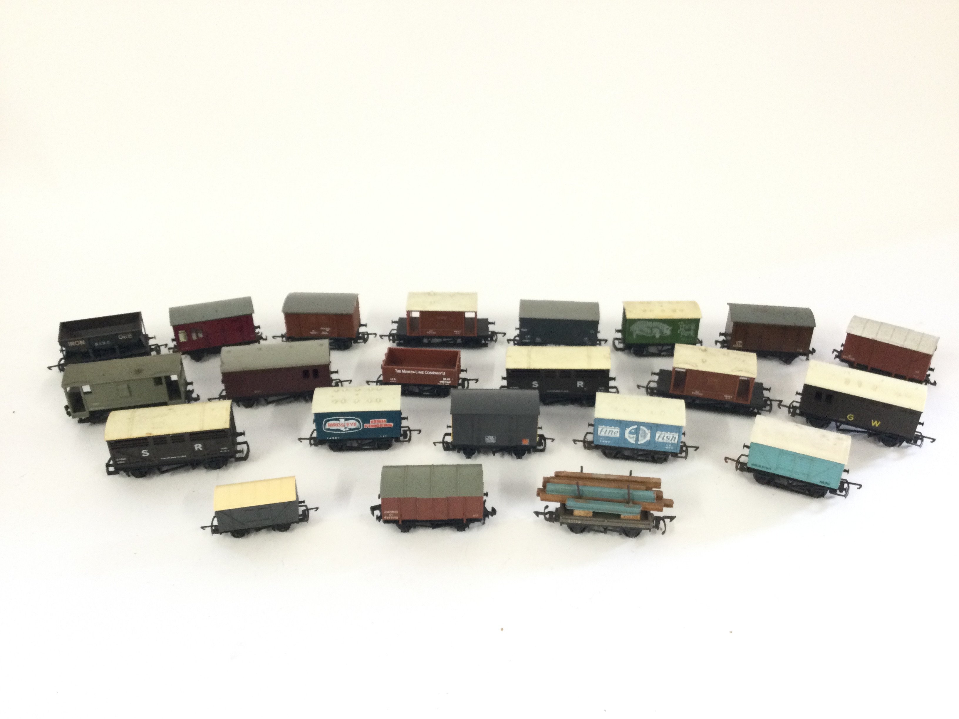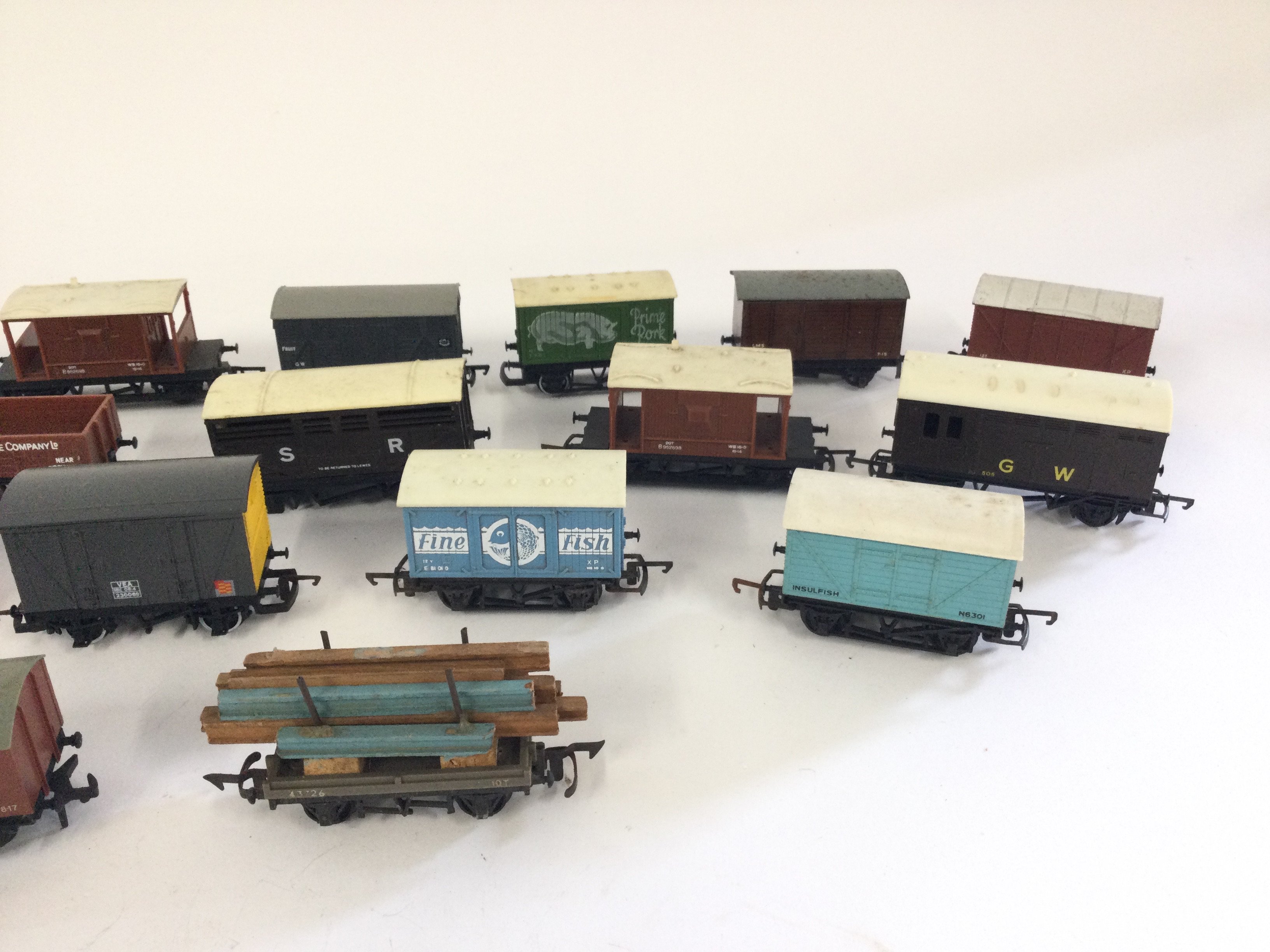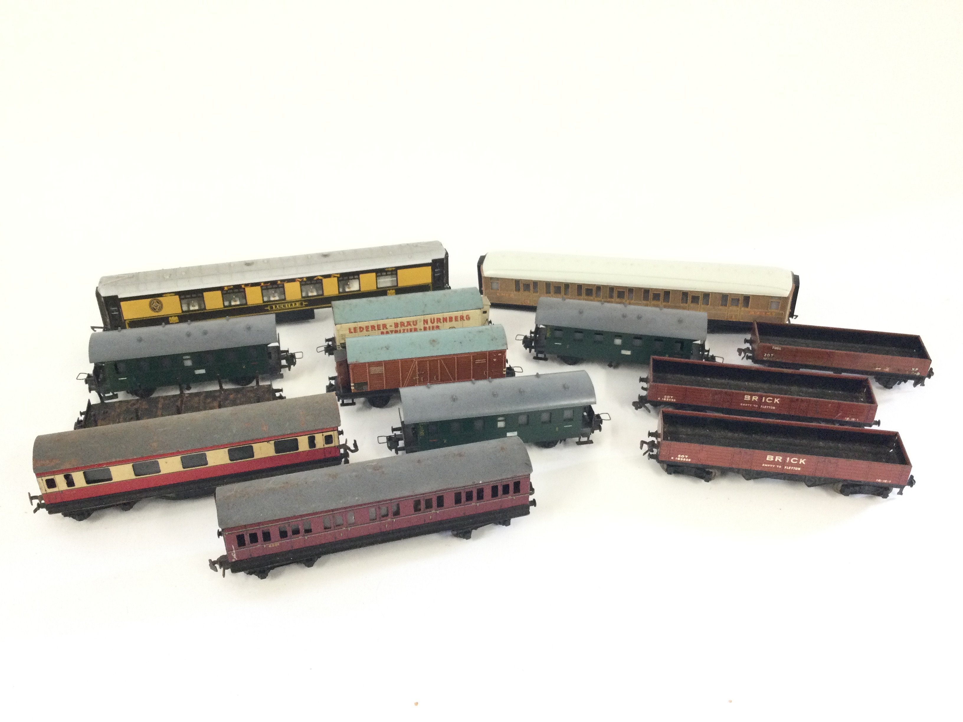 A box containing a quantity of rolling stock Hornby Trix Duplo etc.