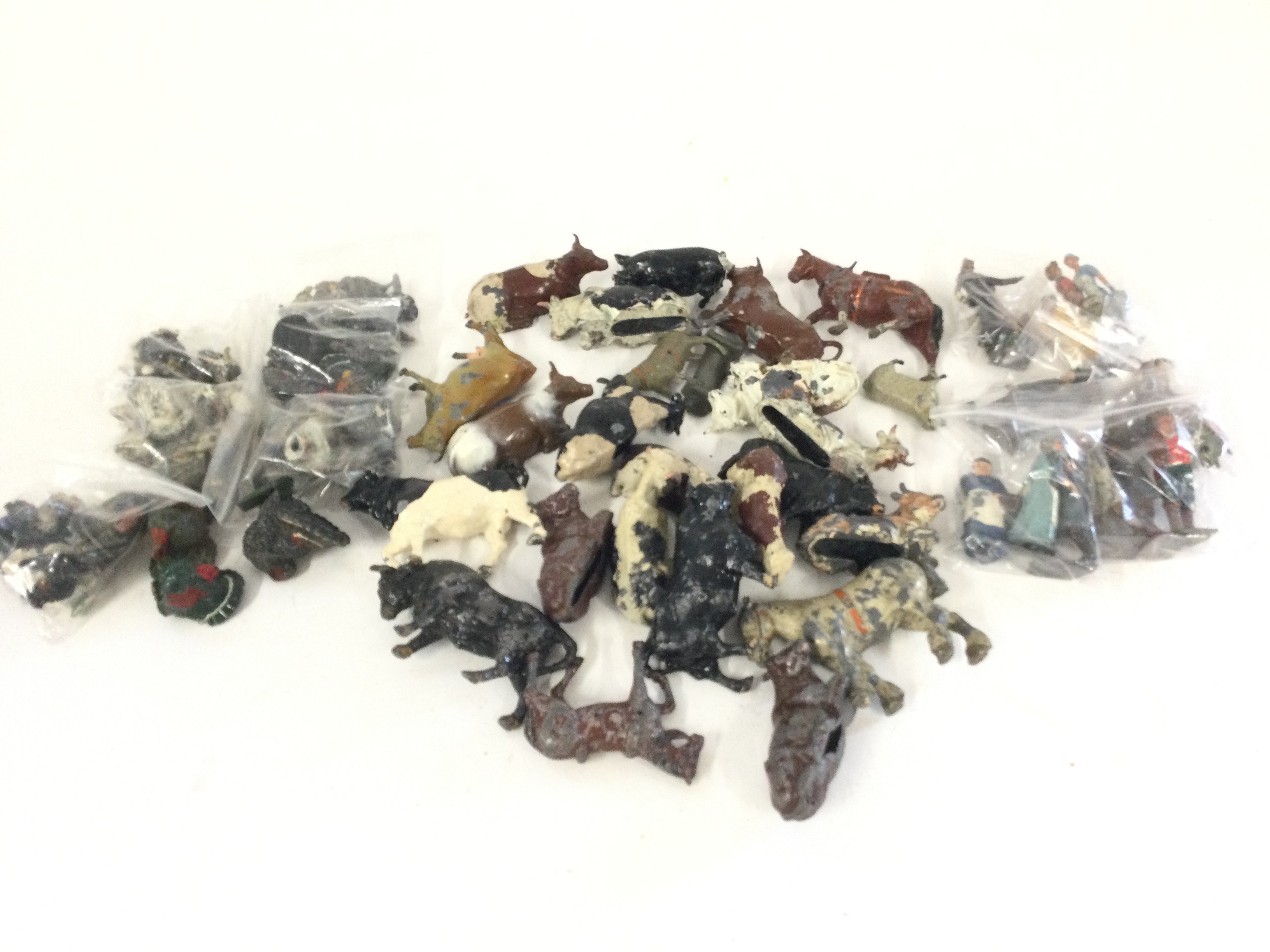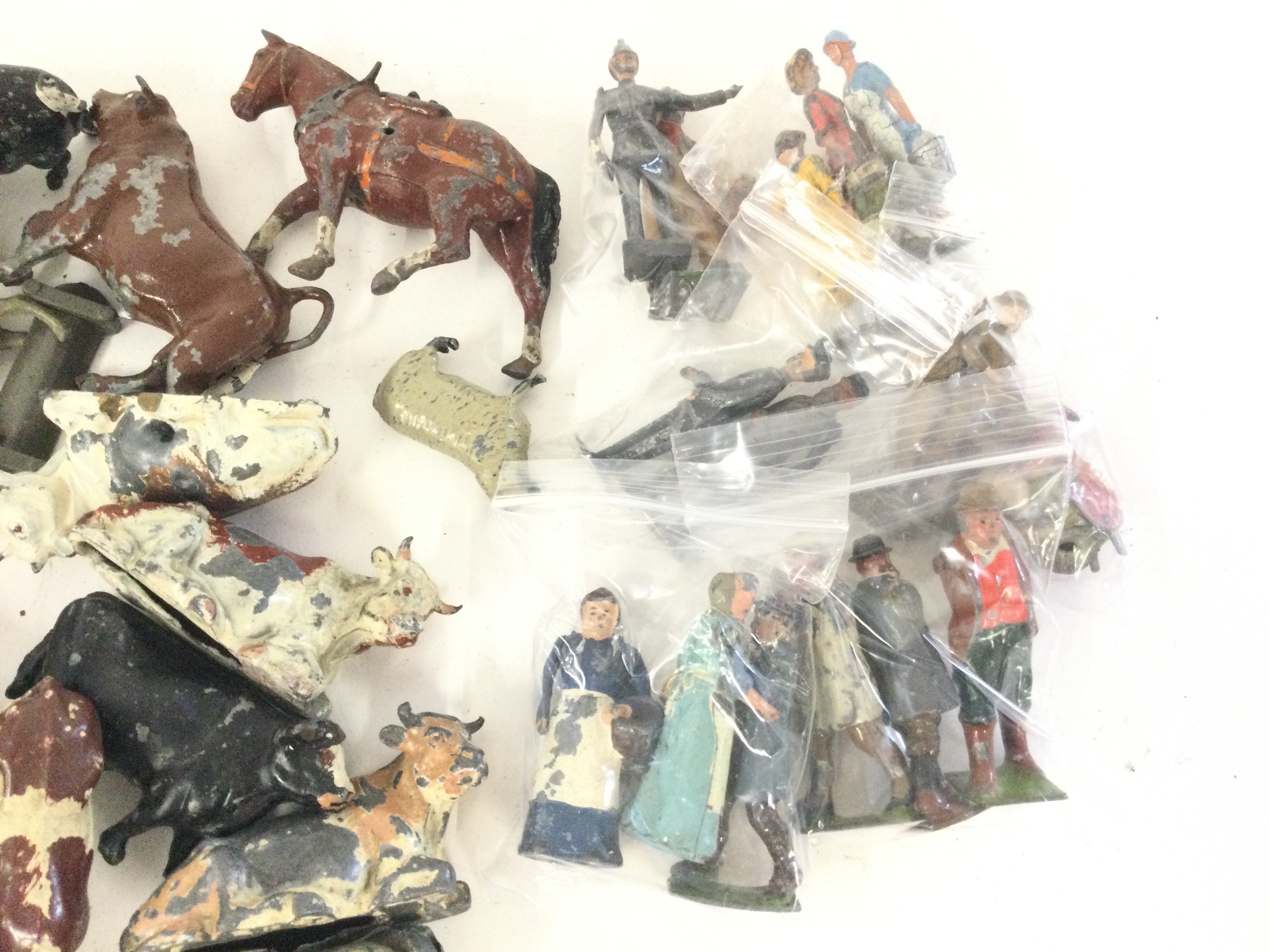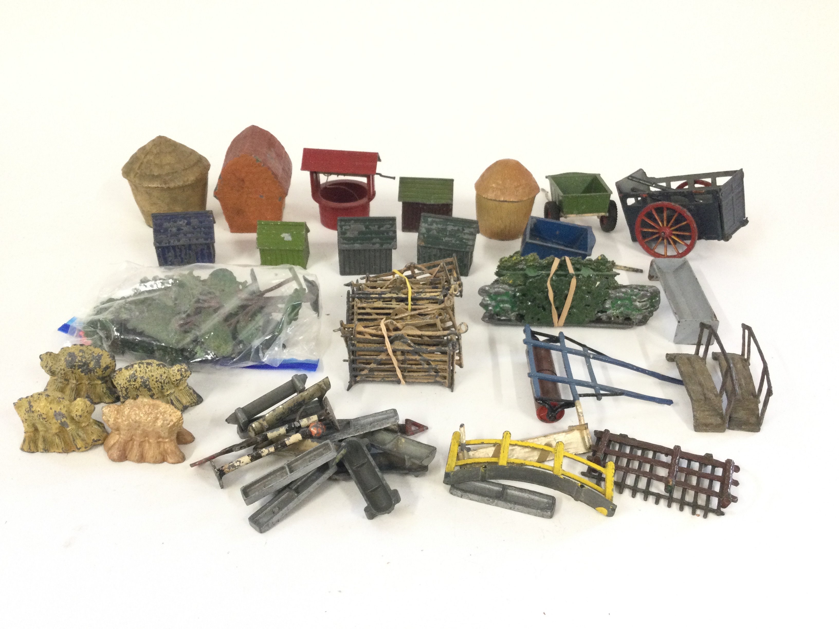 A box containing a quantity of Britains lead farm figures and Hagar. Plus other make pre war buildings.