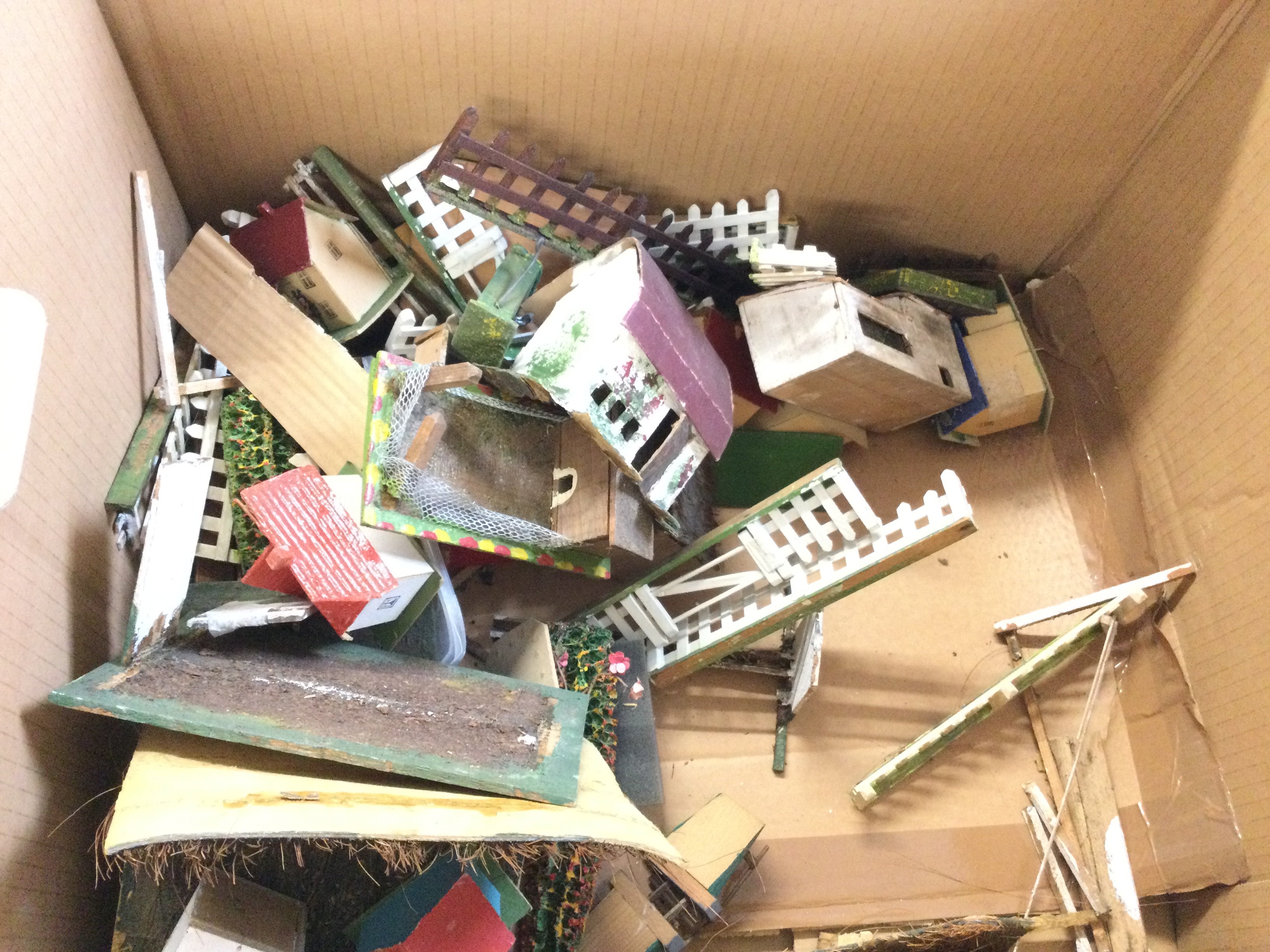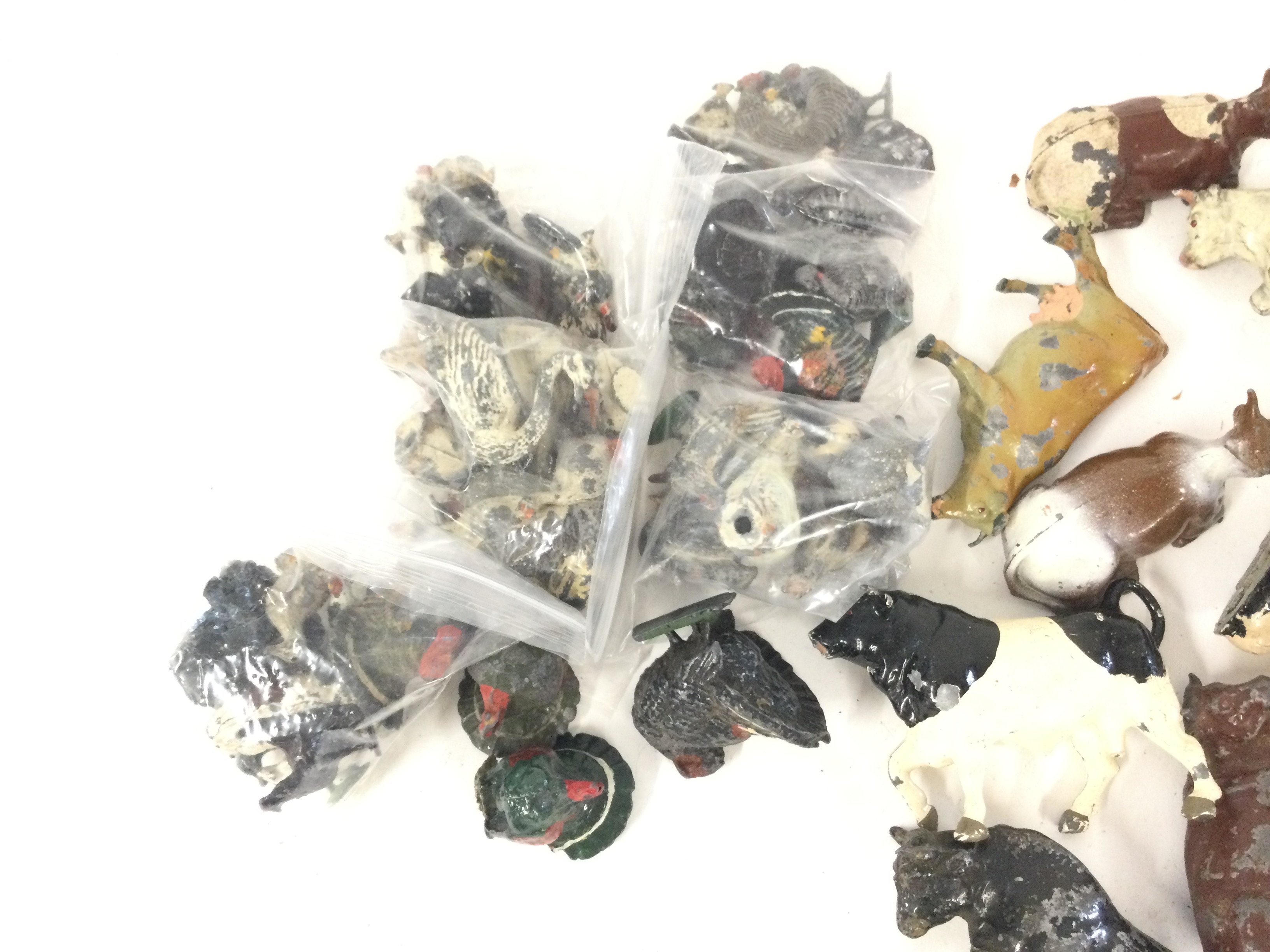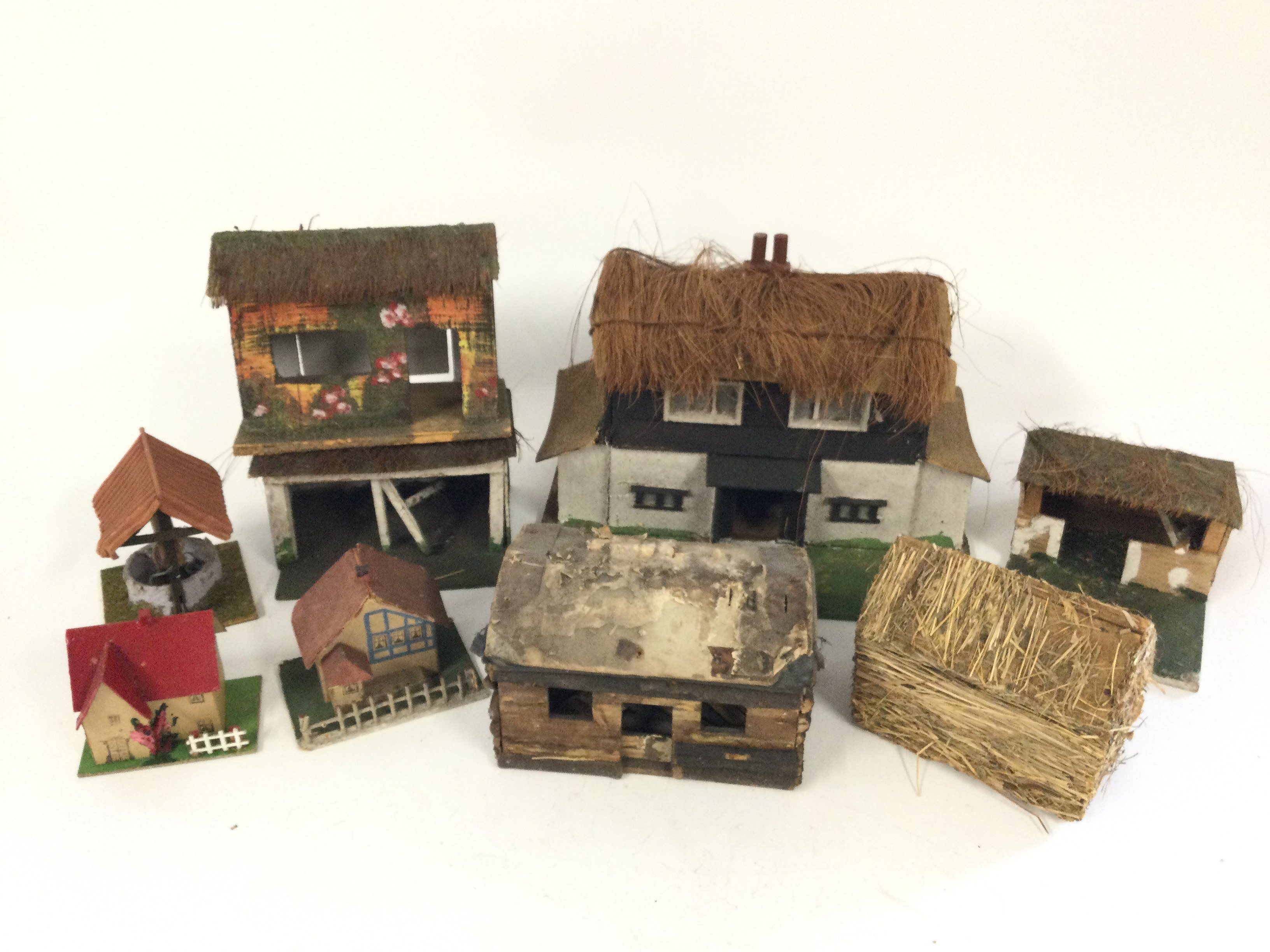 A box containing a quantity of Britains lead farm figures and Hagar. Plus other make pre war buildings.