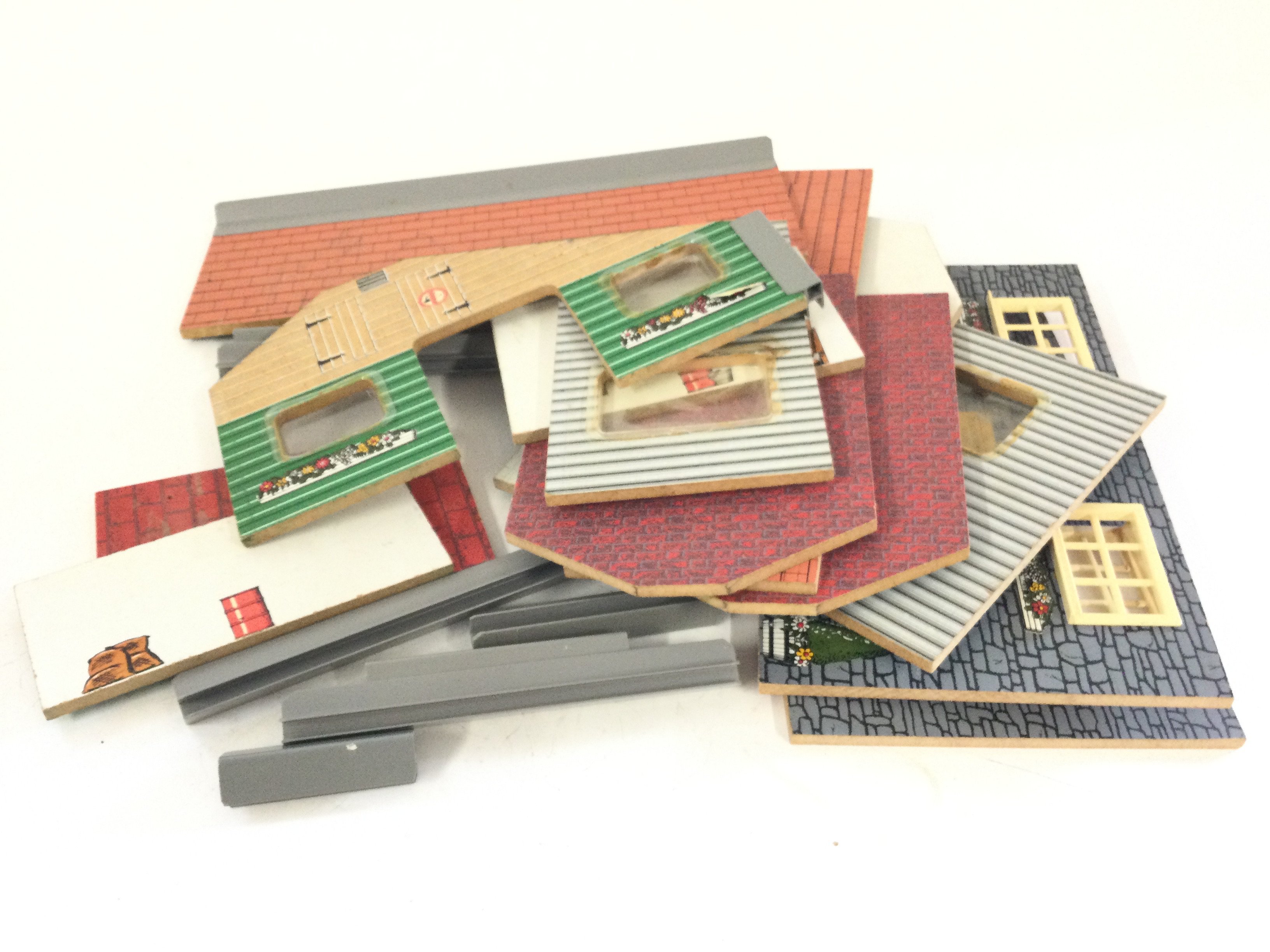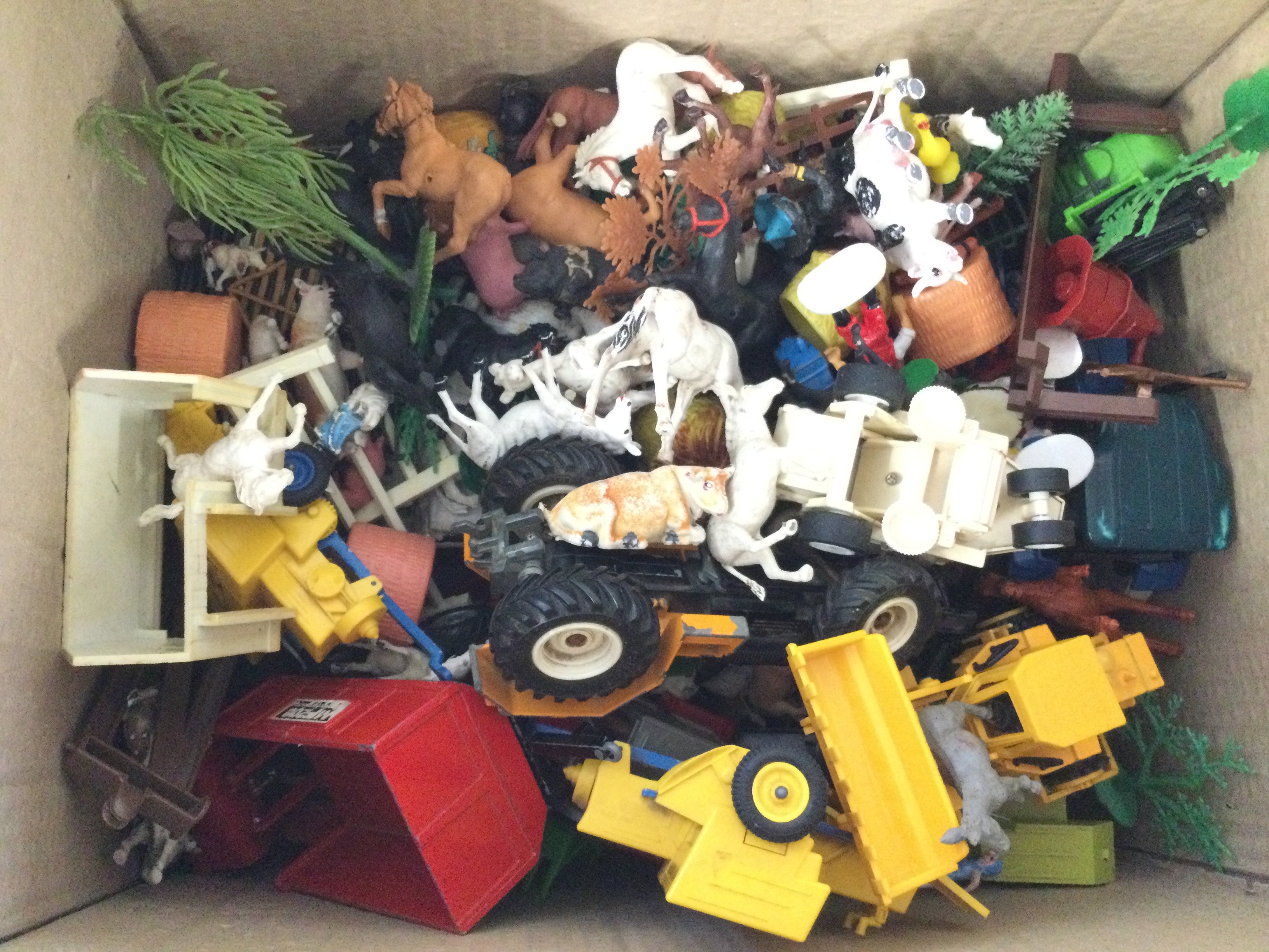 A box containing Britains and other Diecast animals. Figures and animals. Also a bag containing a dismantled farm building.