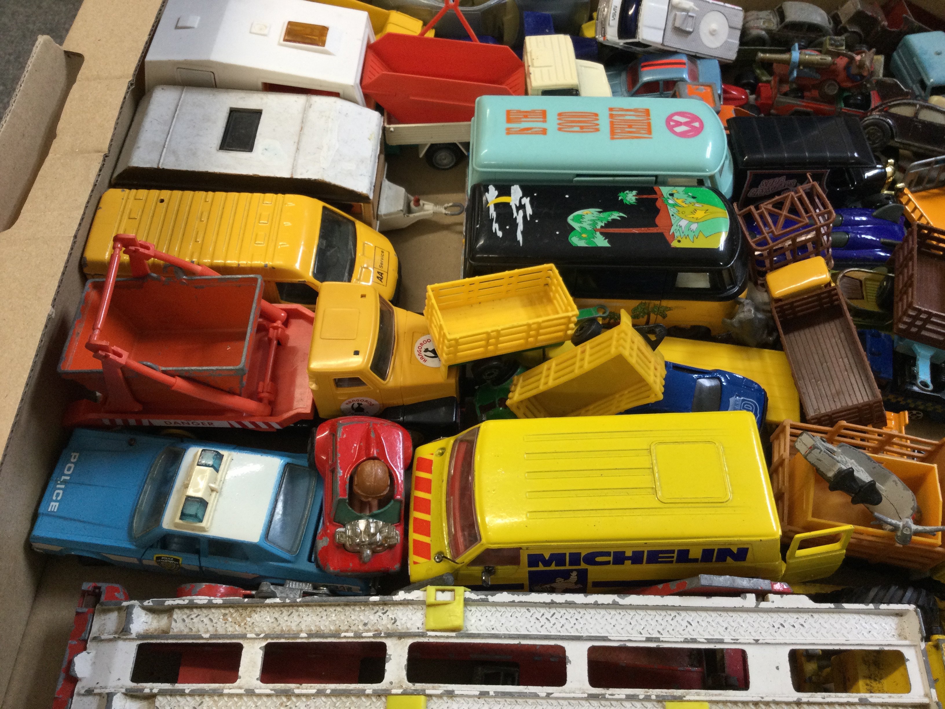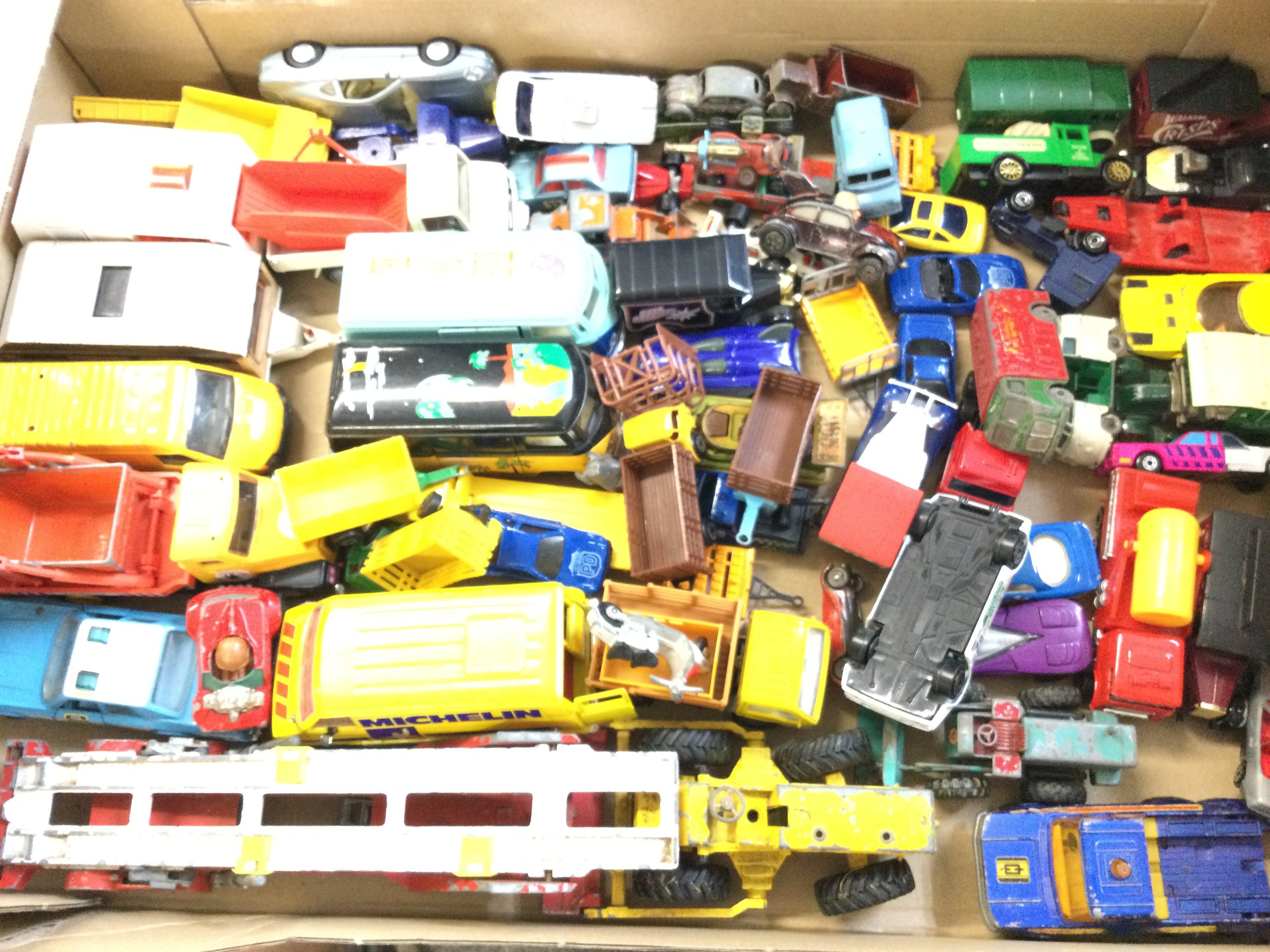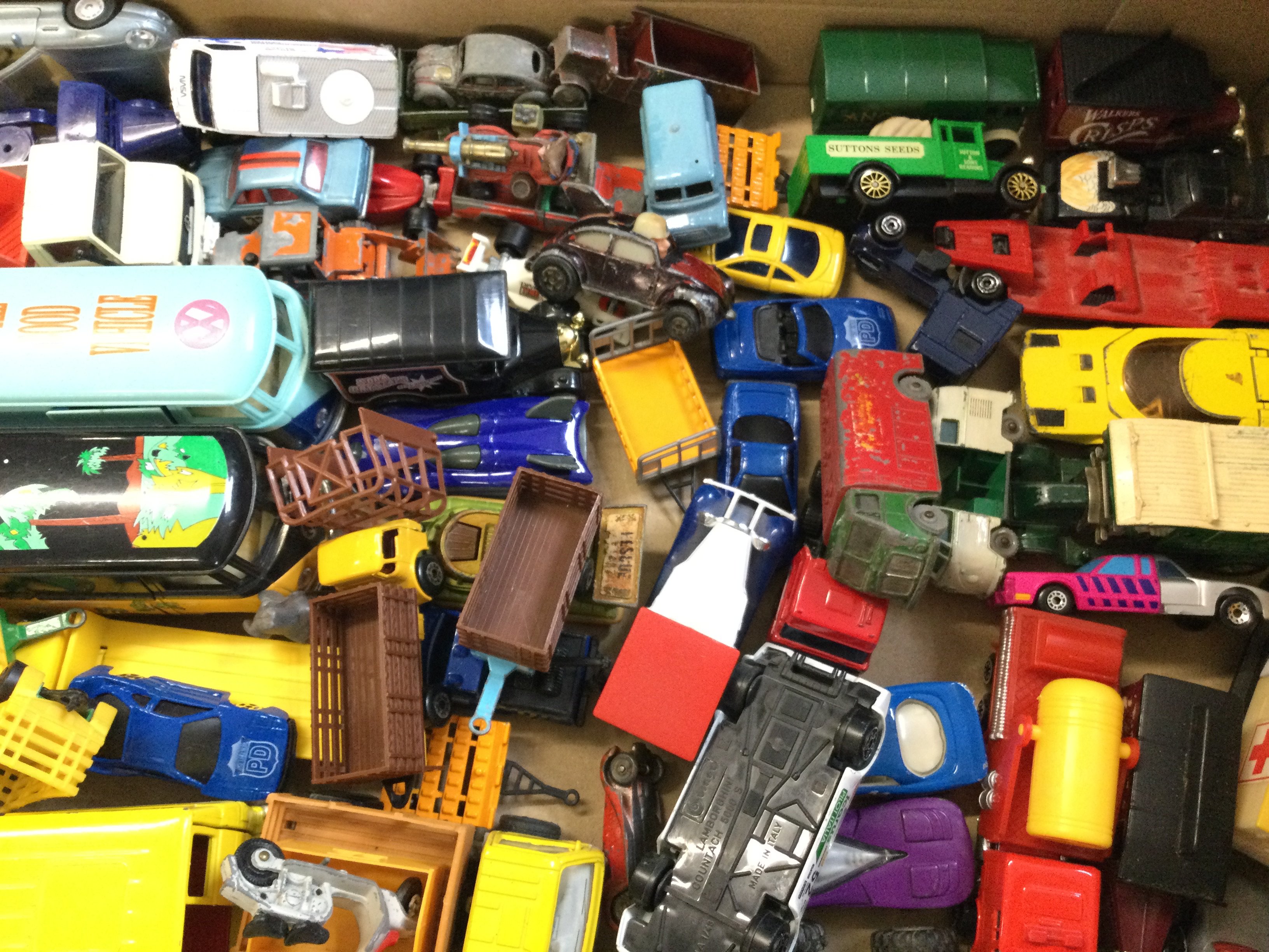 A box containing a quantity of Playworn Diecast toys to include Matchbox Corgi and Burago. Plus some boxed.