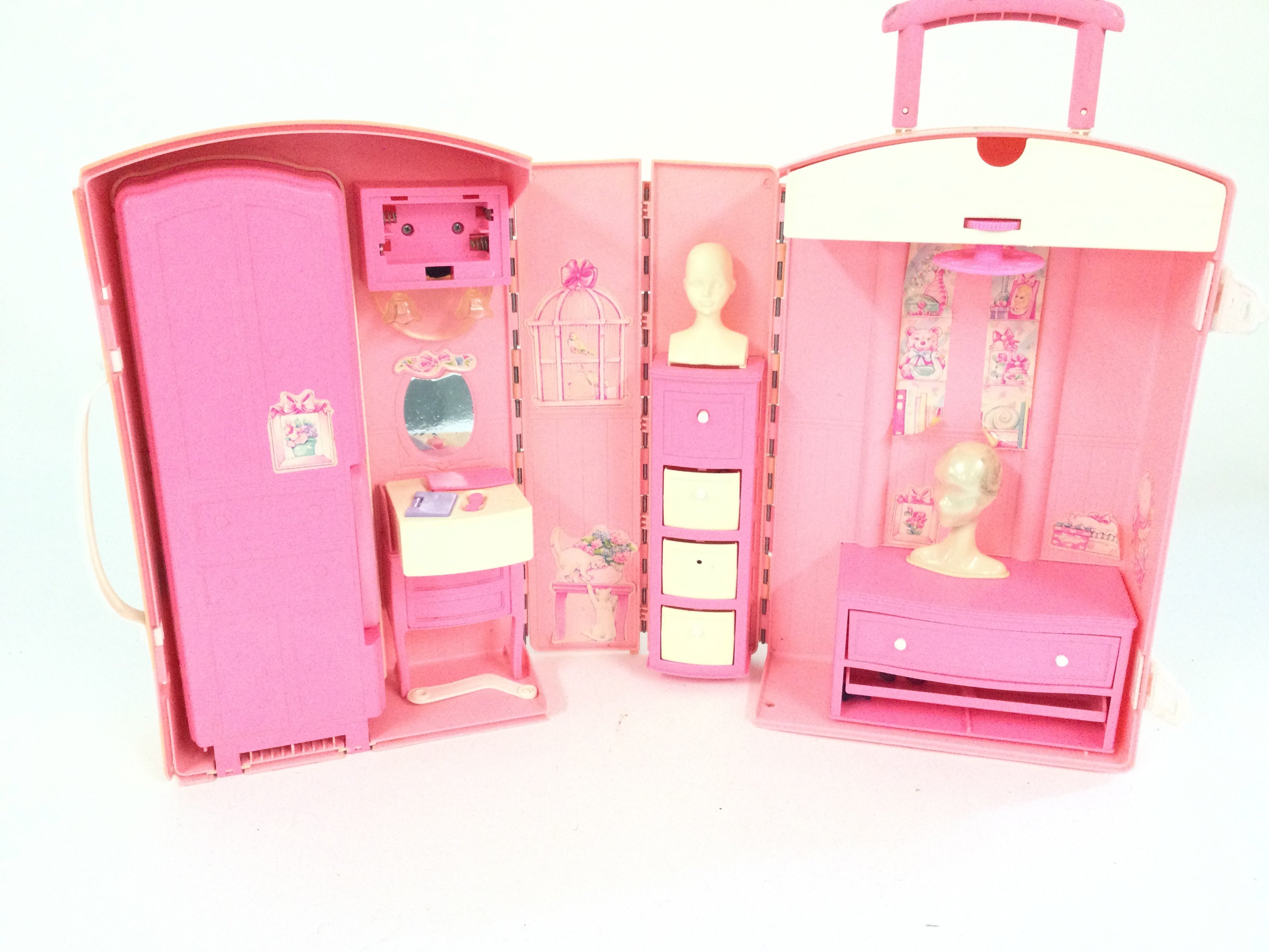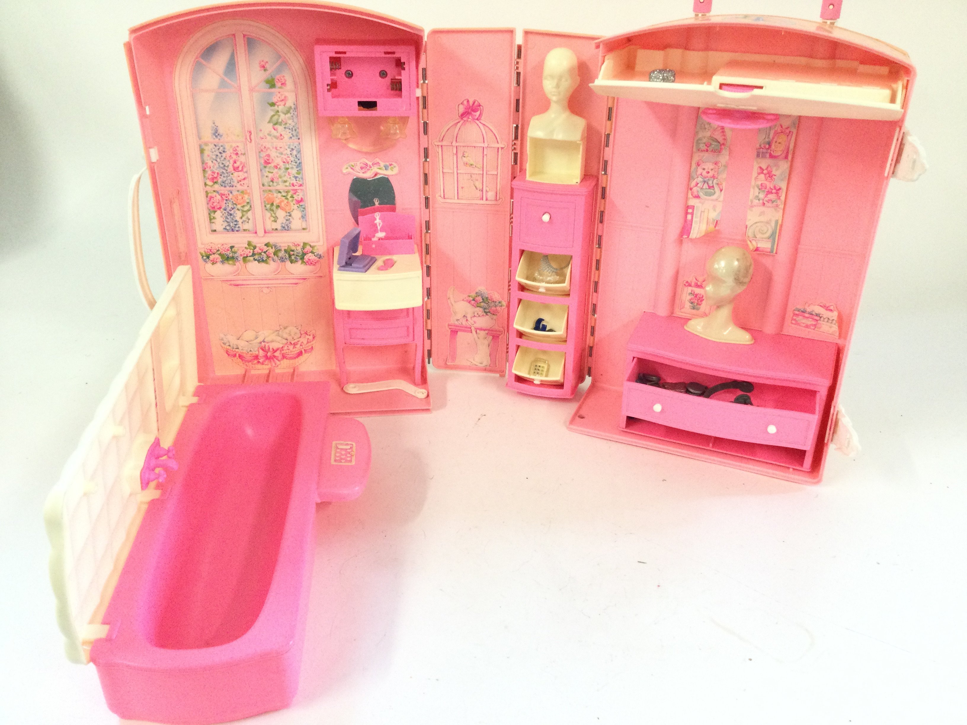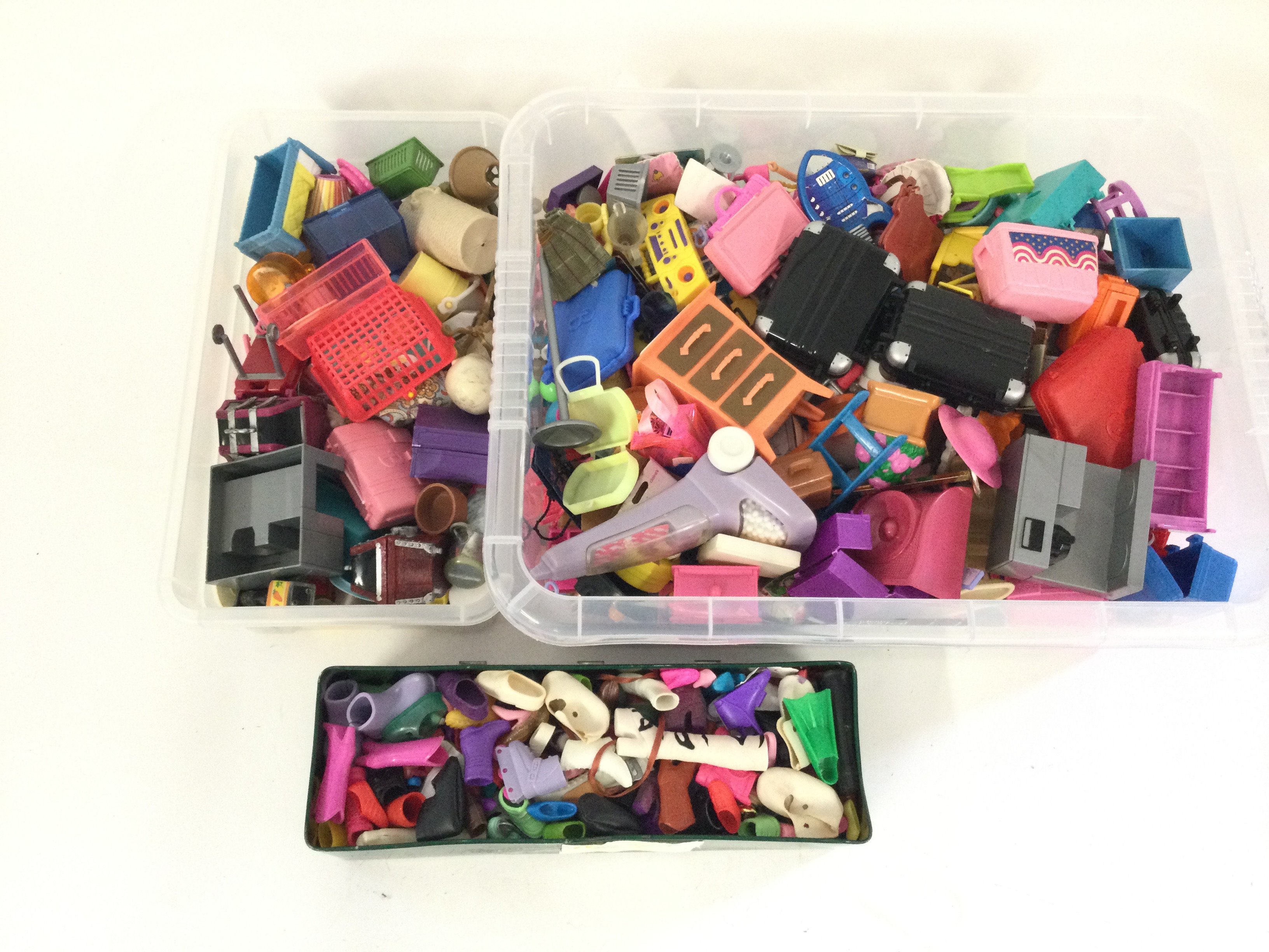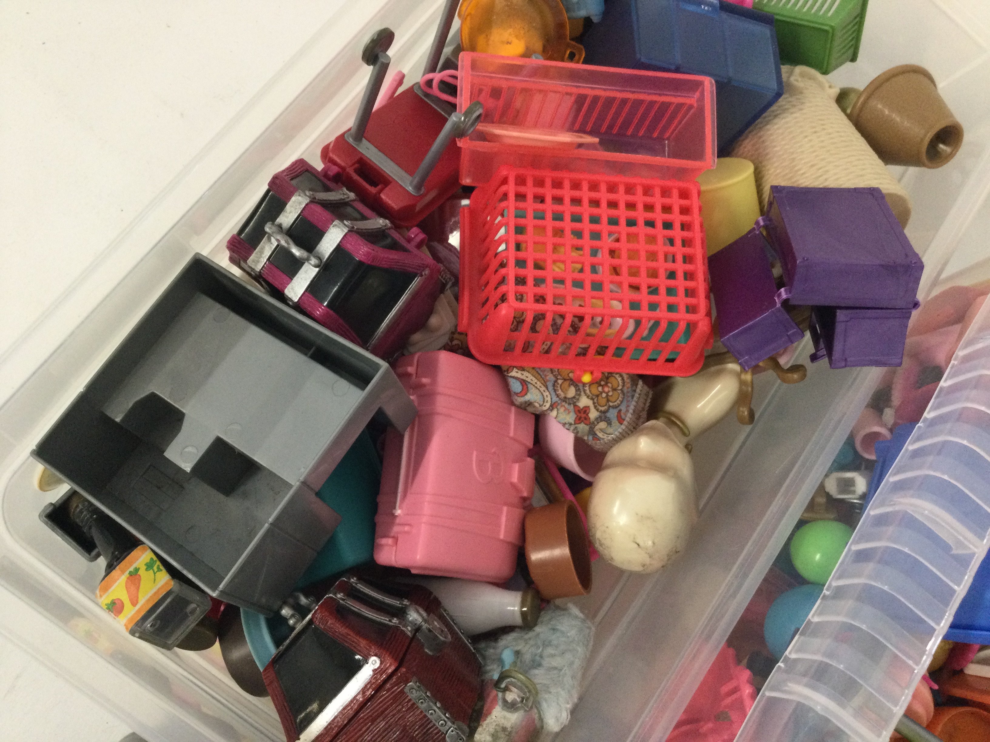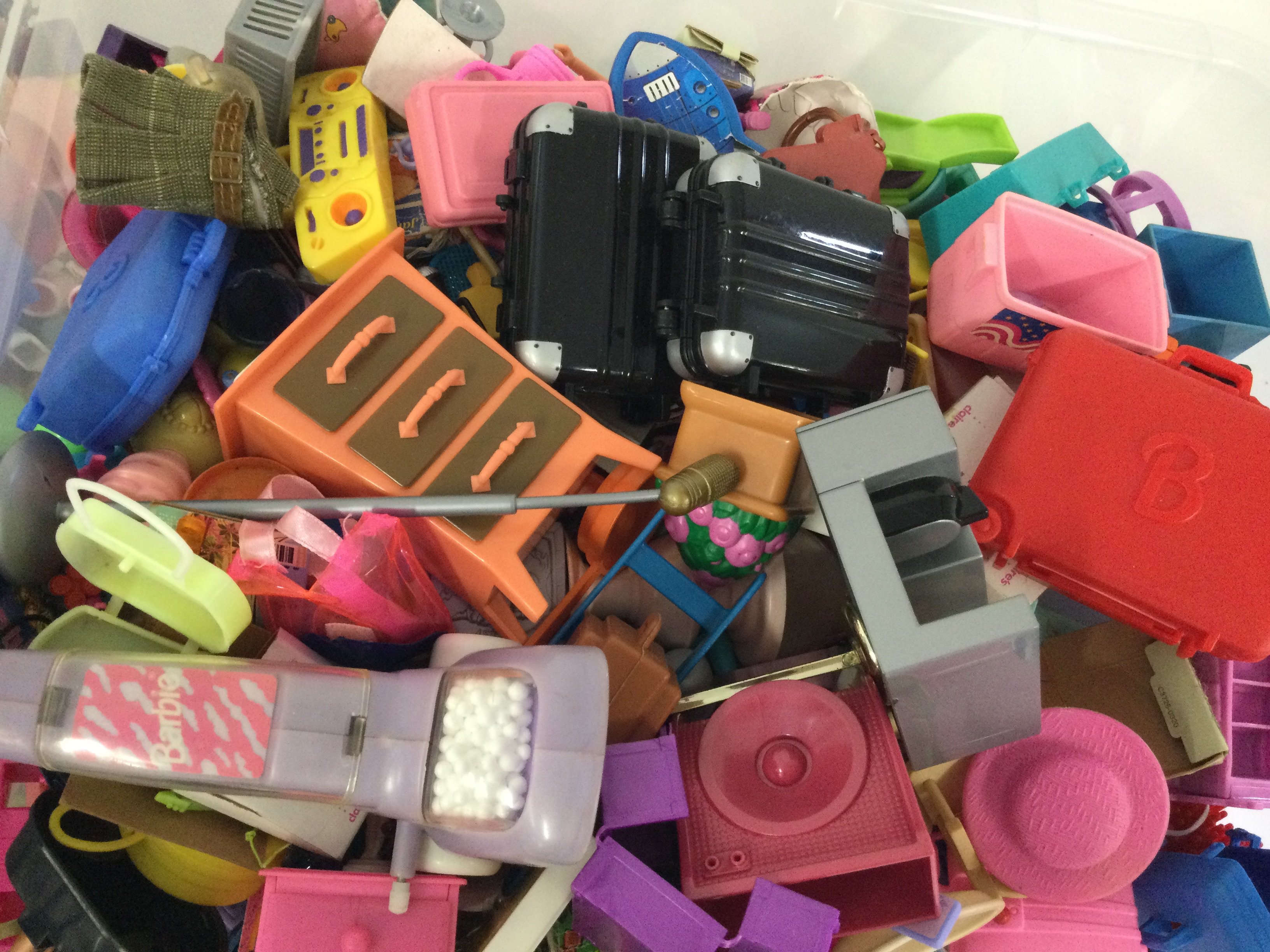 A box containing a vintage Barbie house take along suitcase. Also 3 boxes of various accessories.