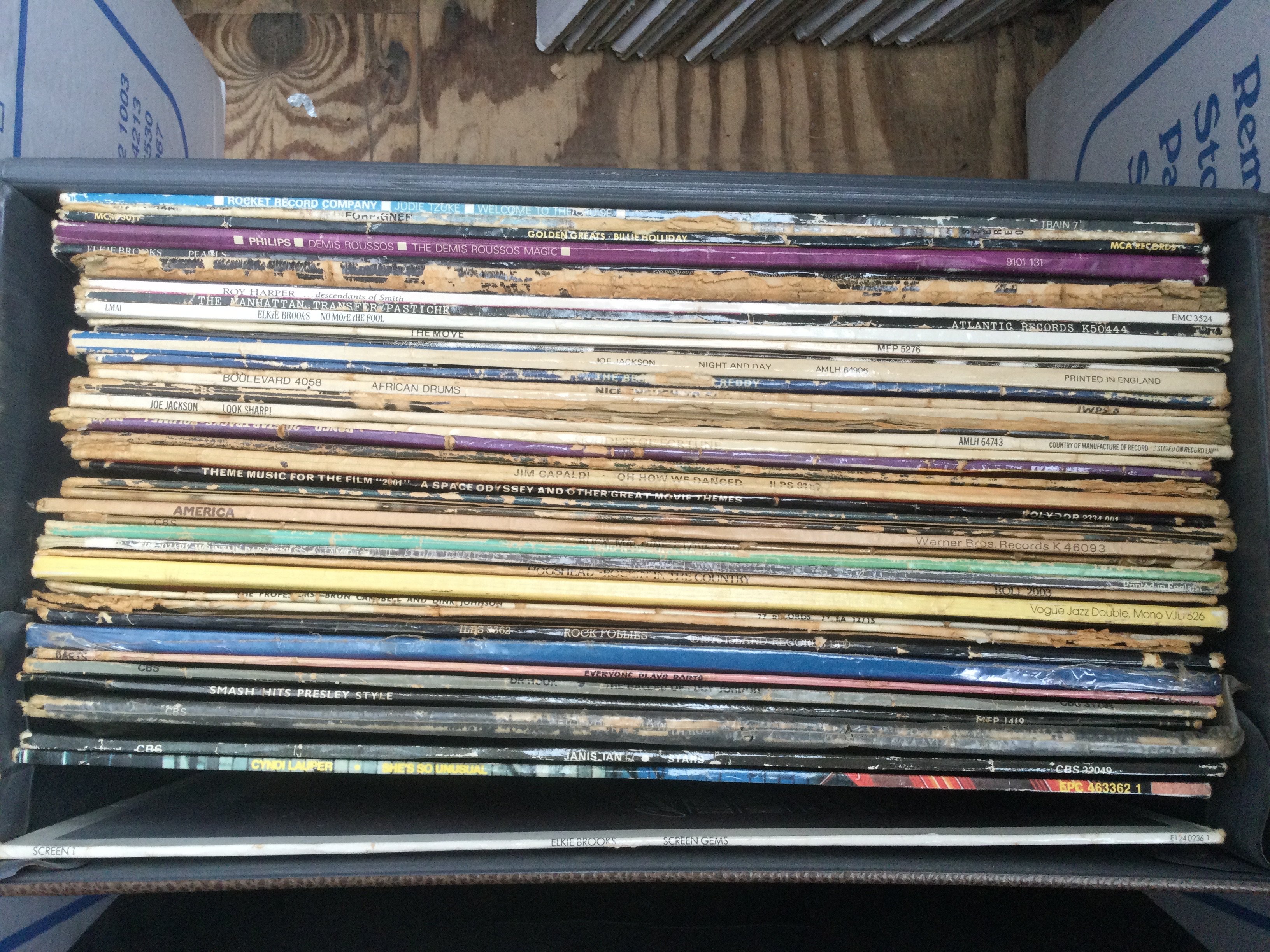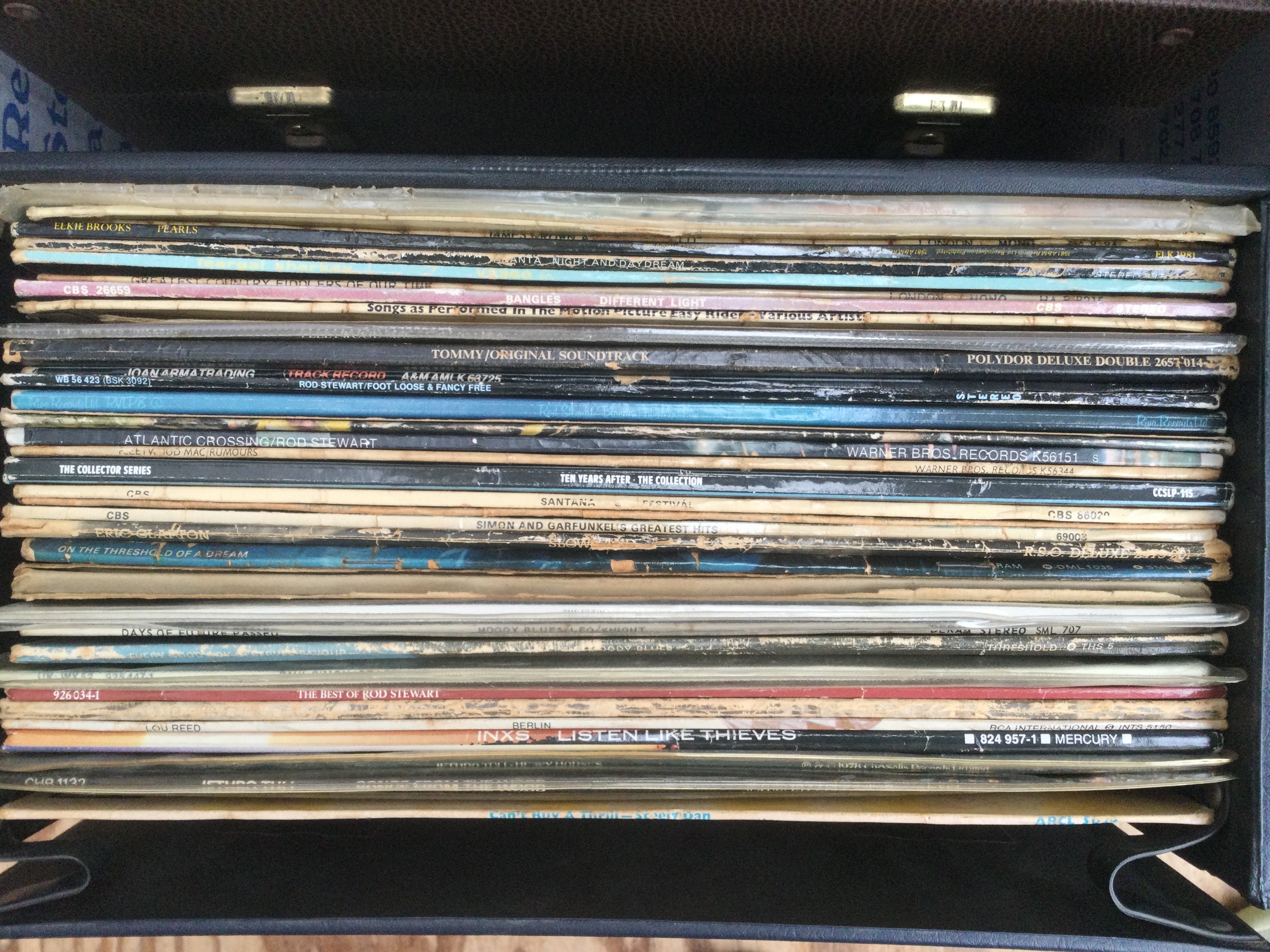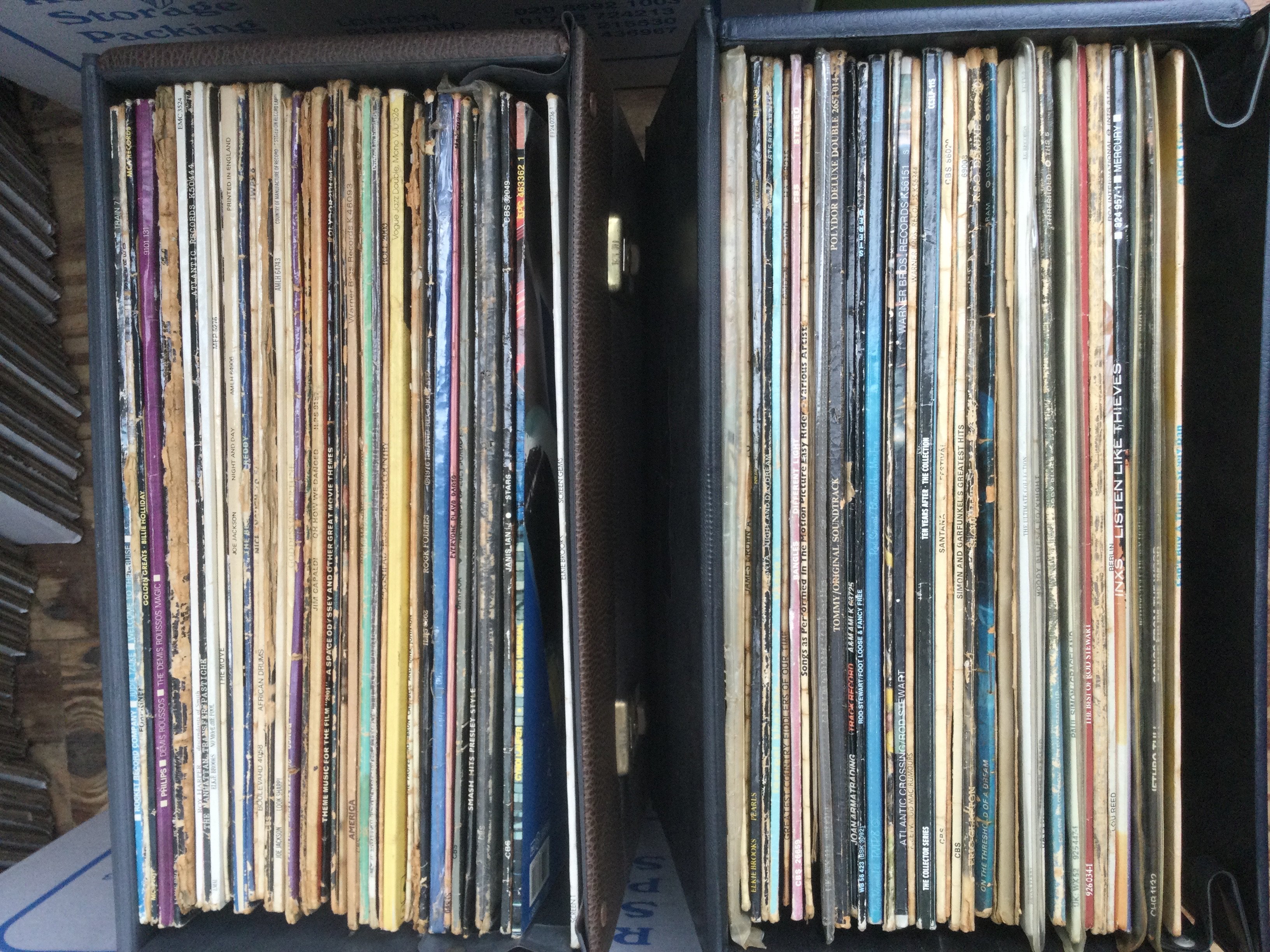 Two record cases of LPs by various artists including INXS, Ten Years After, Roy Harper, James Brown and many more.
