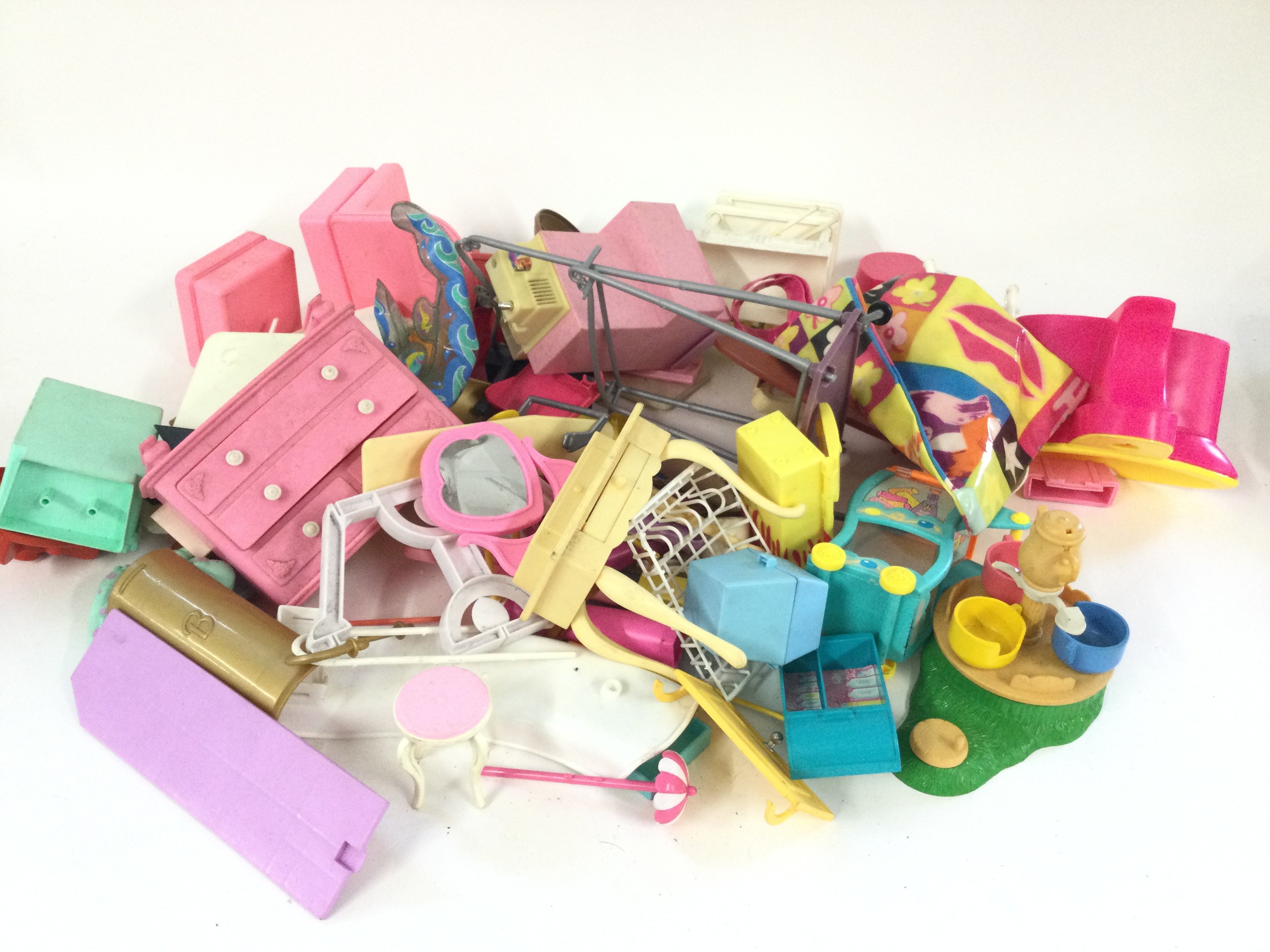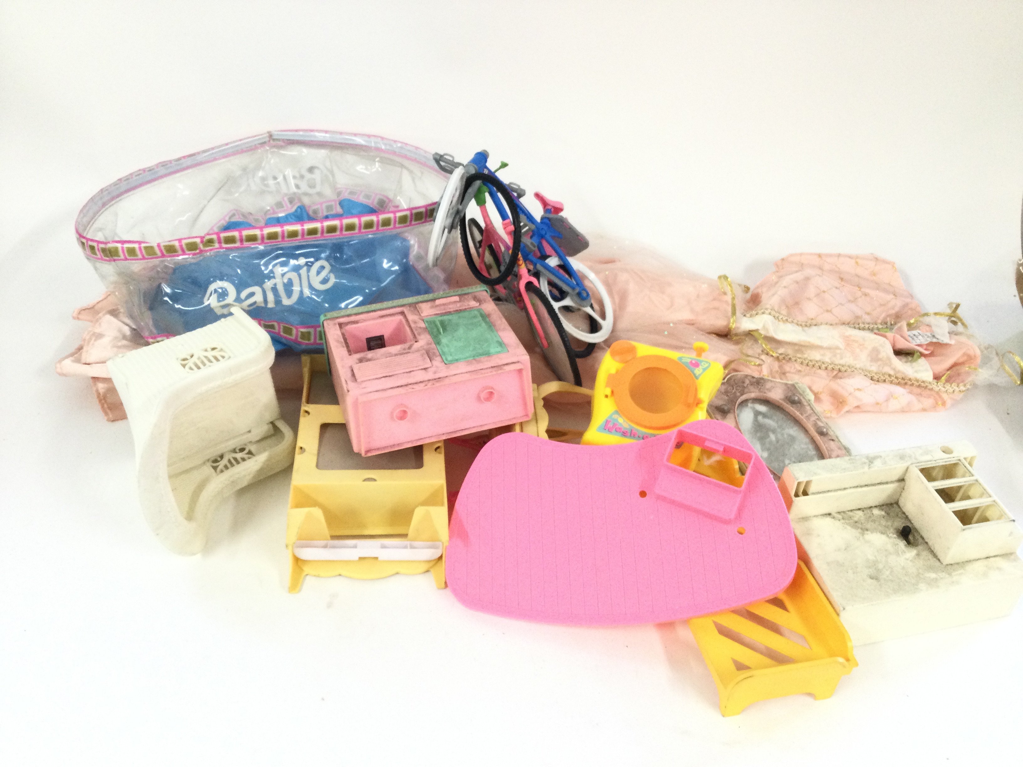 A box containing various larger Barrie accessories including a Barrie pool etc. Also a Barrie dress aged 5 to 7.