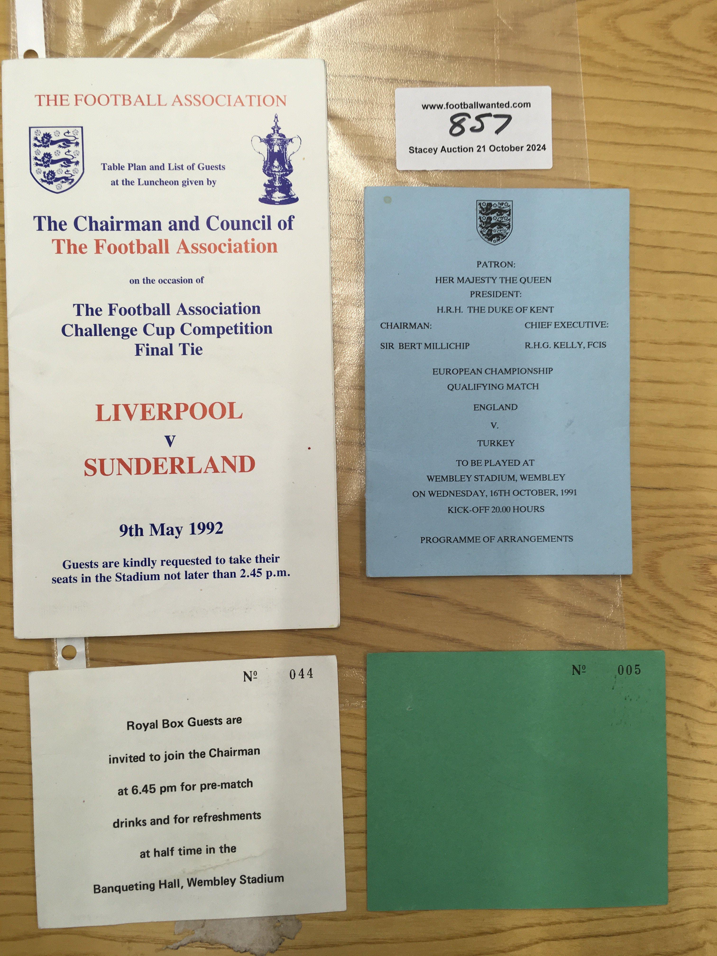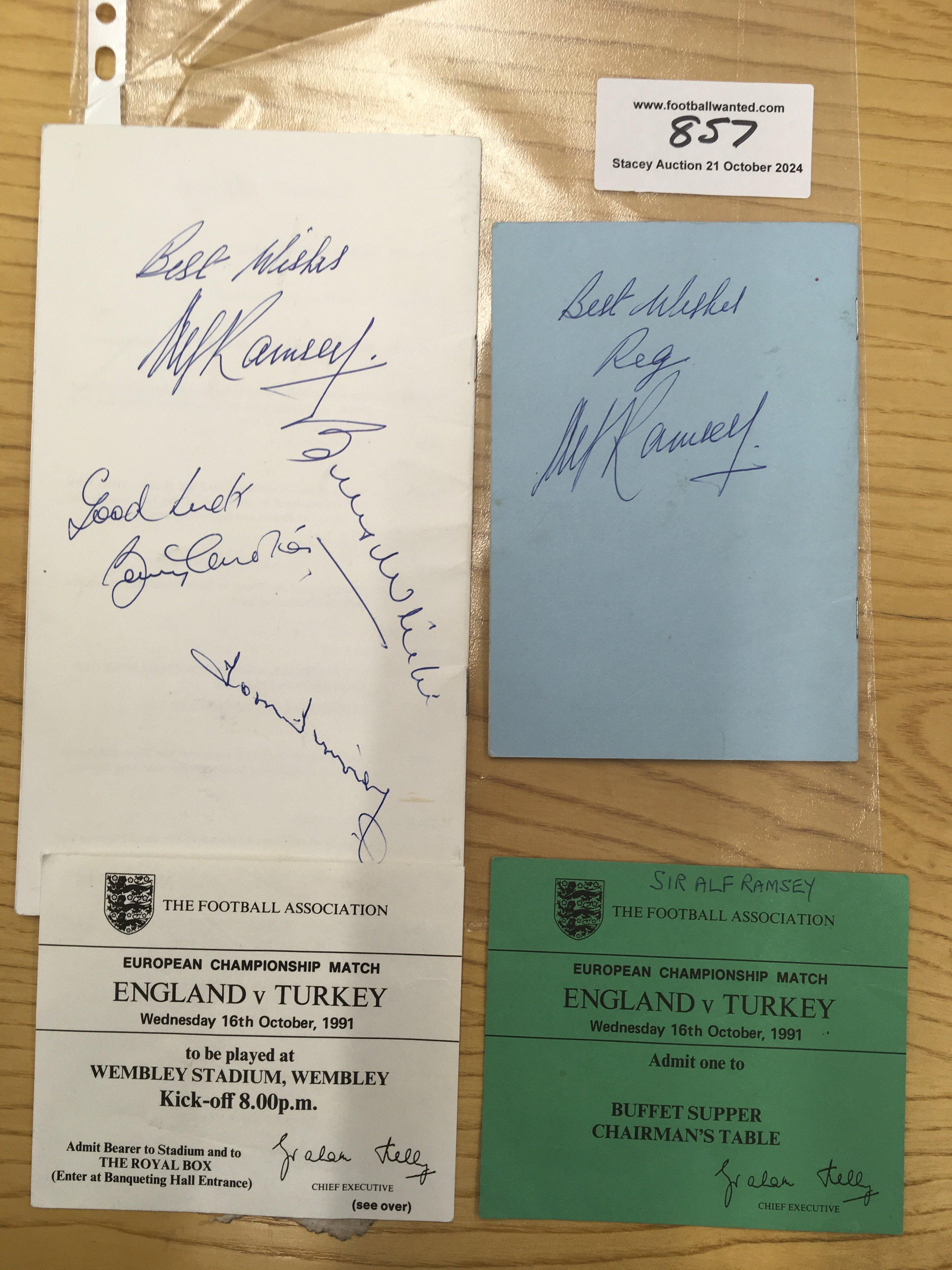 Alf Ramsey Signed Personal Football Items: 1992 FA Cup Final menu/lists of guests (Liverpool v Sunderland) signed clearly to blank back page by England legends Alf Ramsey Billy Wright Bobby Charlton and Tom Finney. C/W Ramseys tickets for 1991 England v Turkey for Royal Box and Buffet plus a Programme of Arrangements signed to rear by him and dedicated.