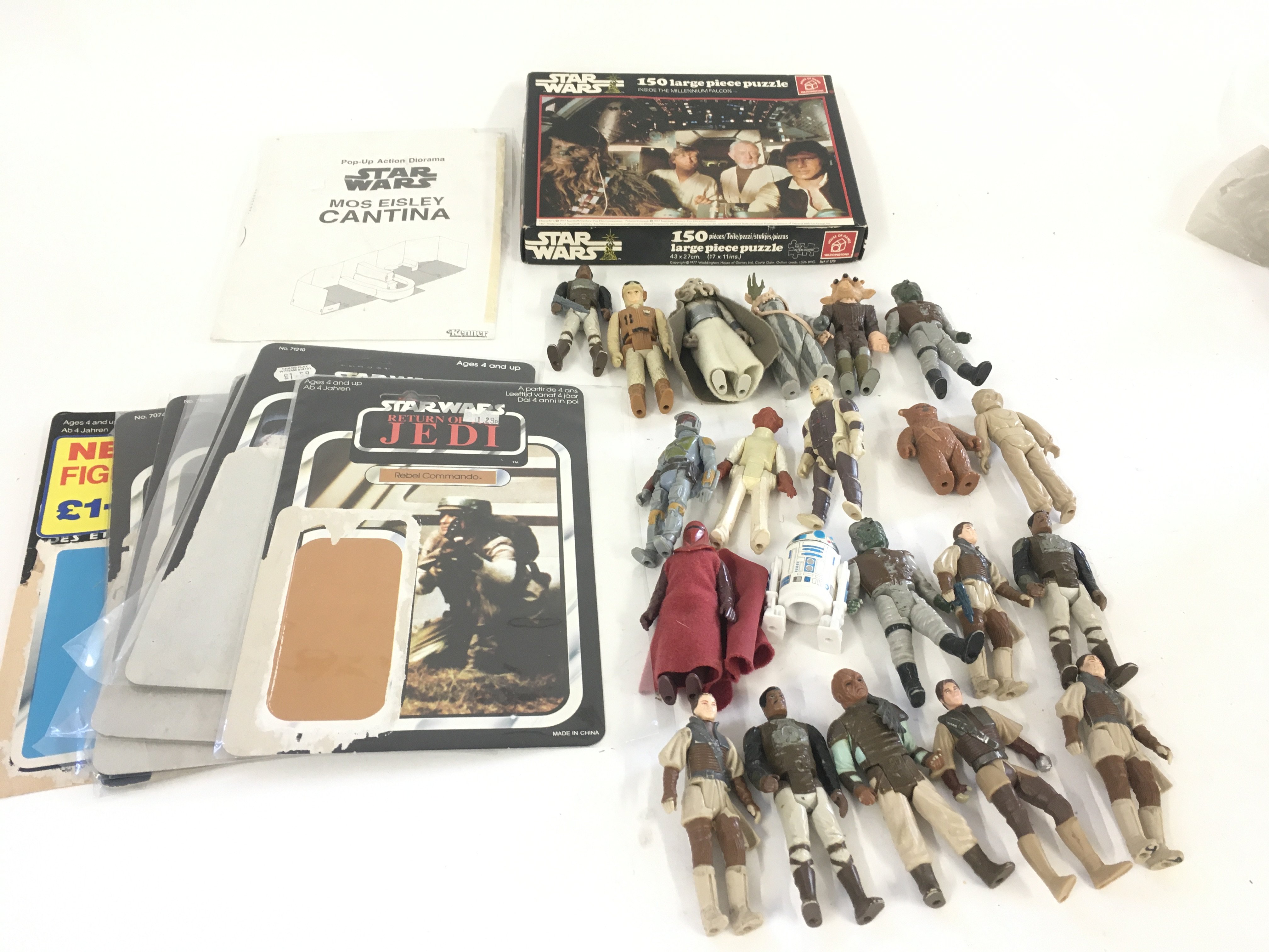 A collection of vintage Star Wars figures..card backs..jigsaw