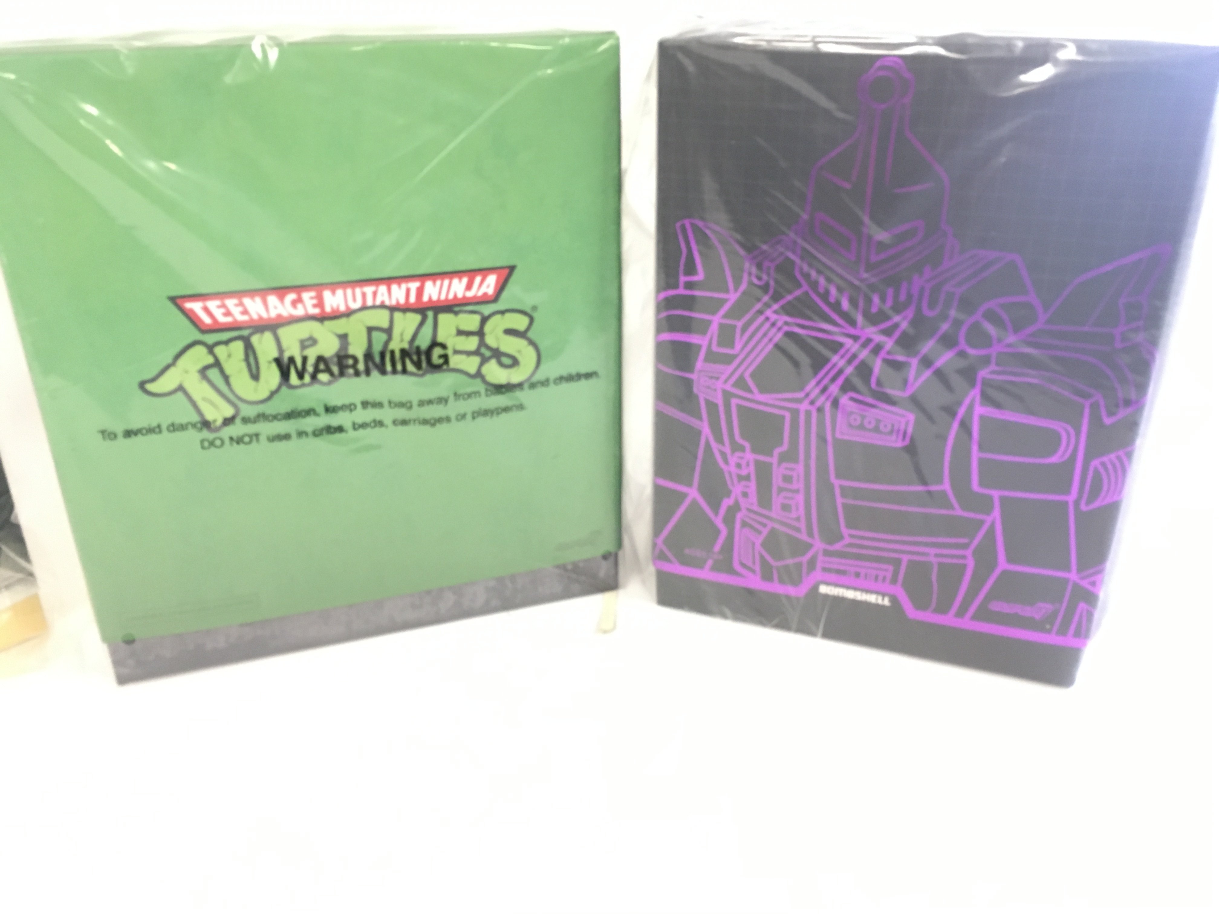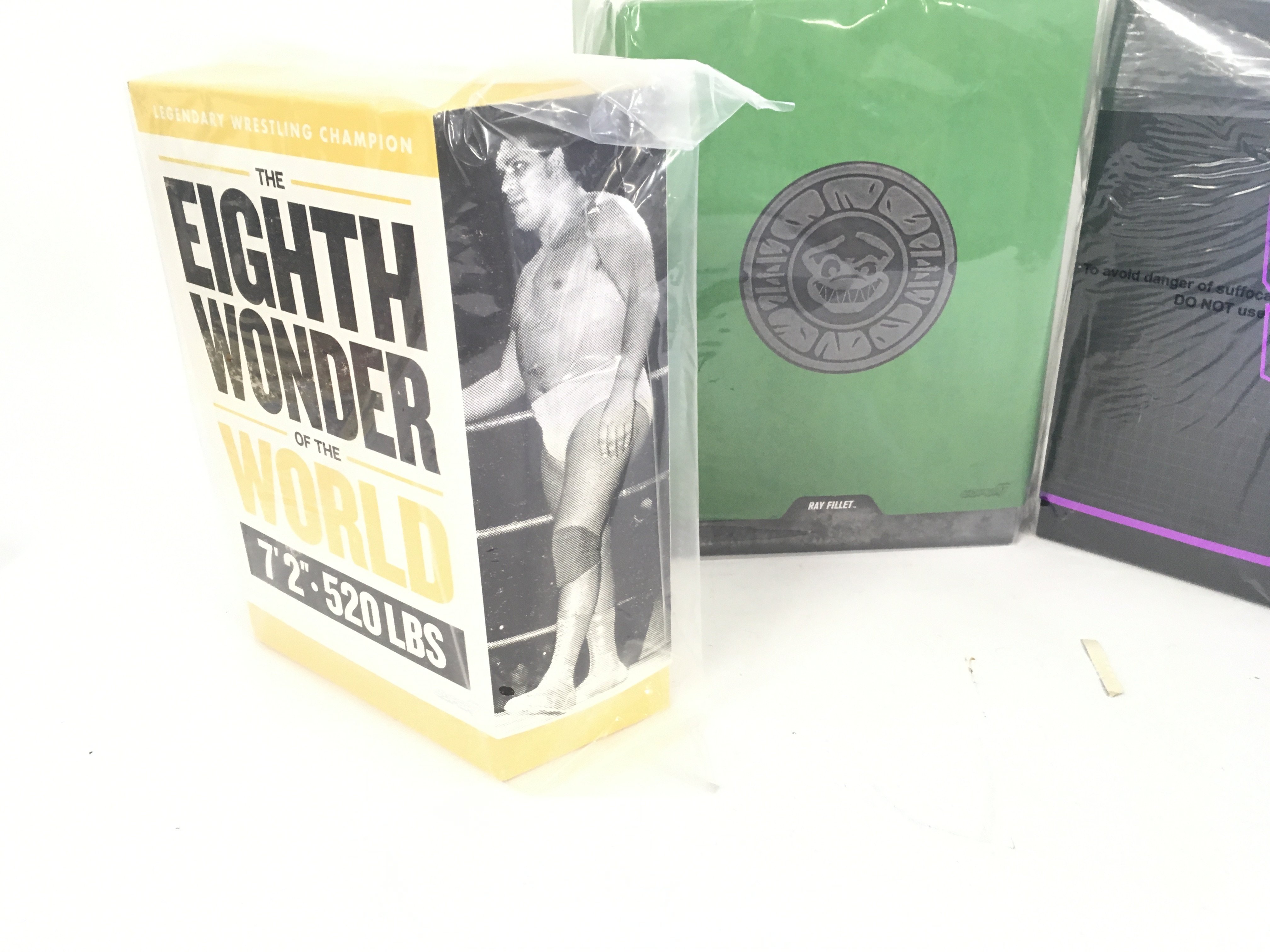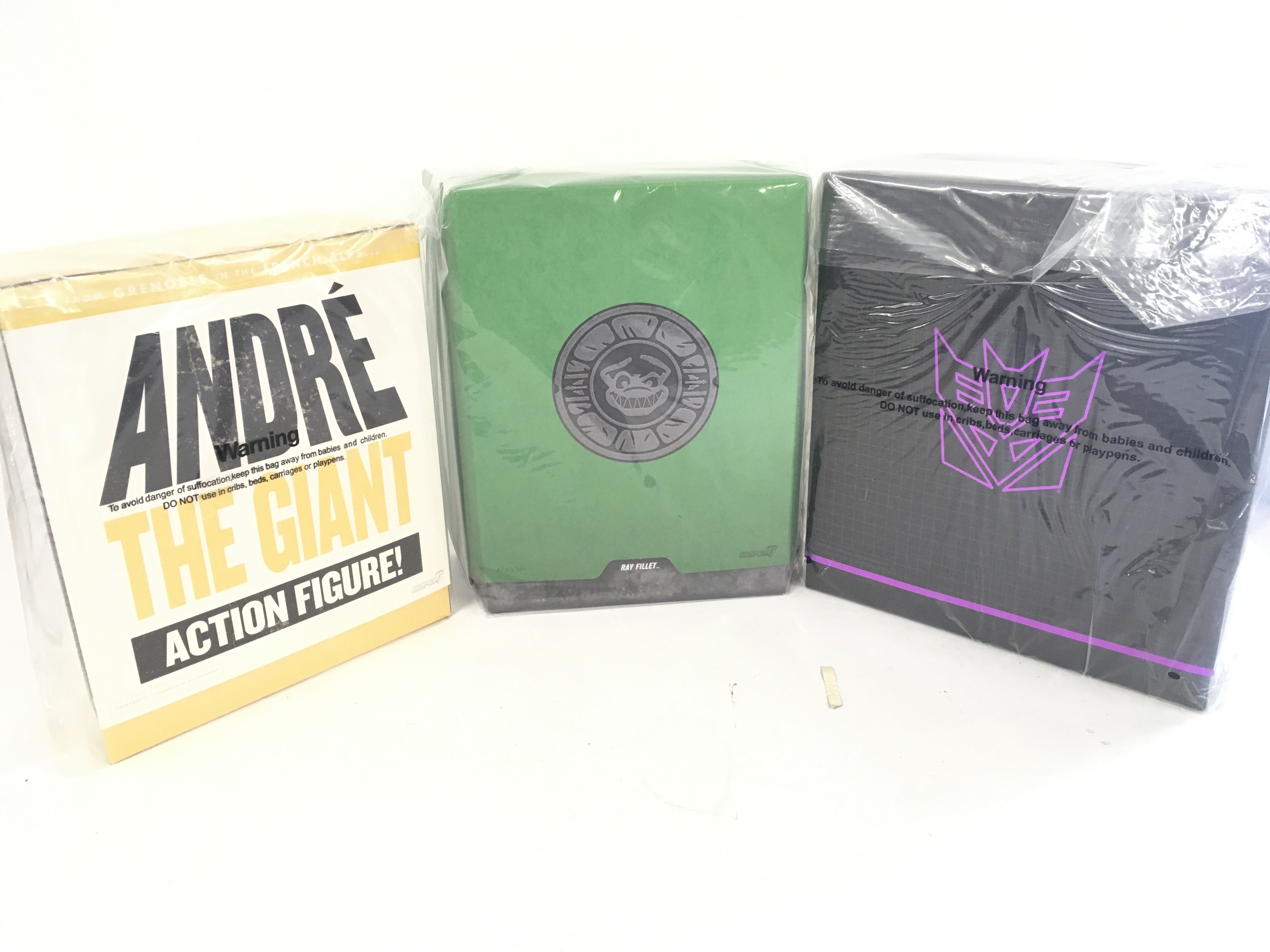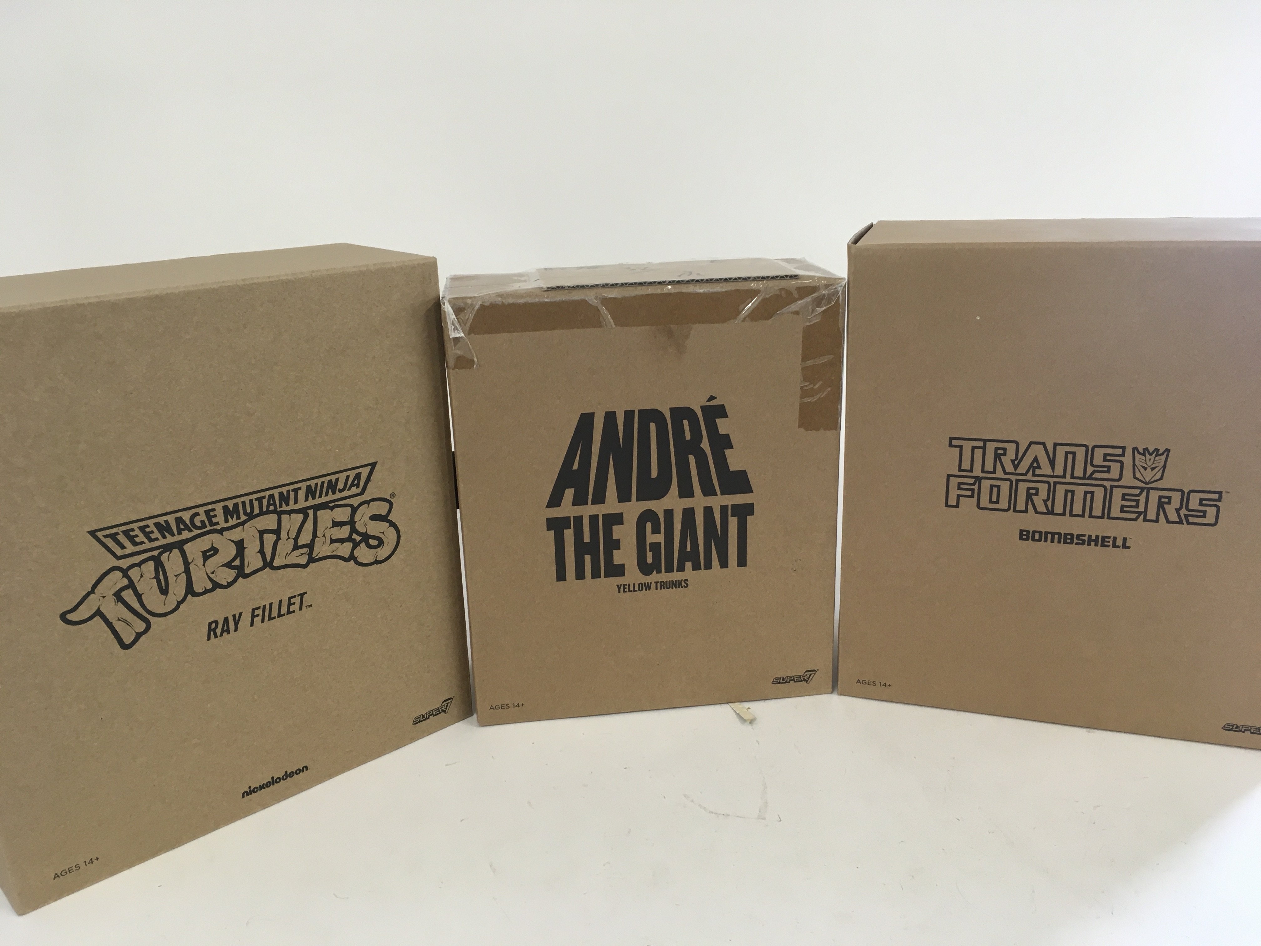 A collection of 3 new and boxed Super 7 figures..ANDRE the giant. RAY FILLET TMNT..BOMBSHELL transformer.