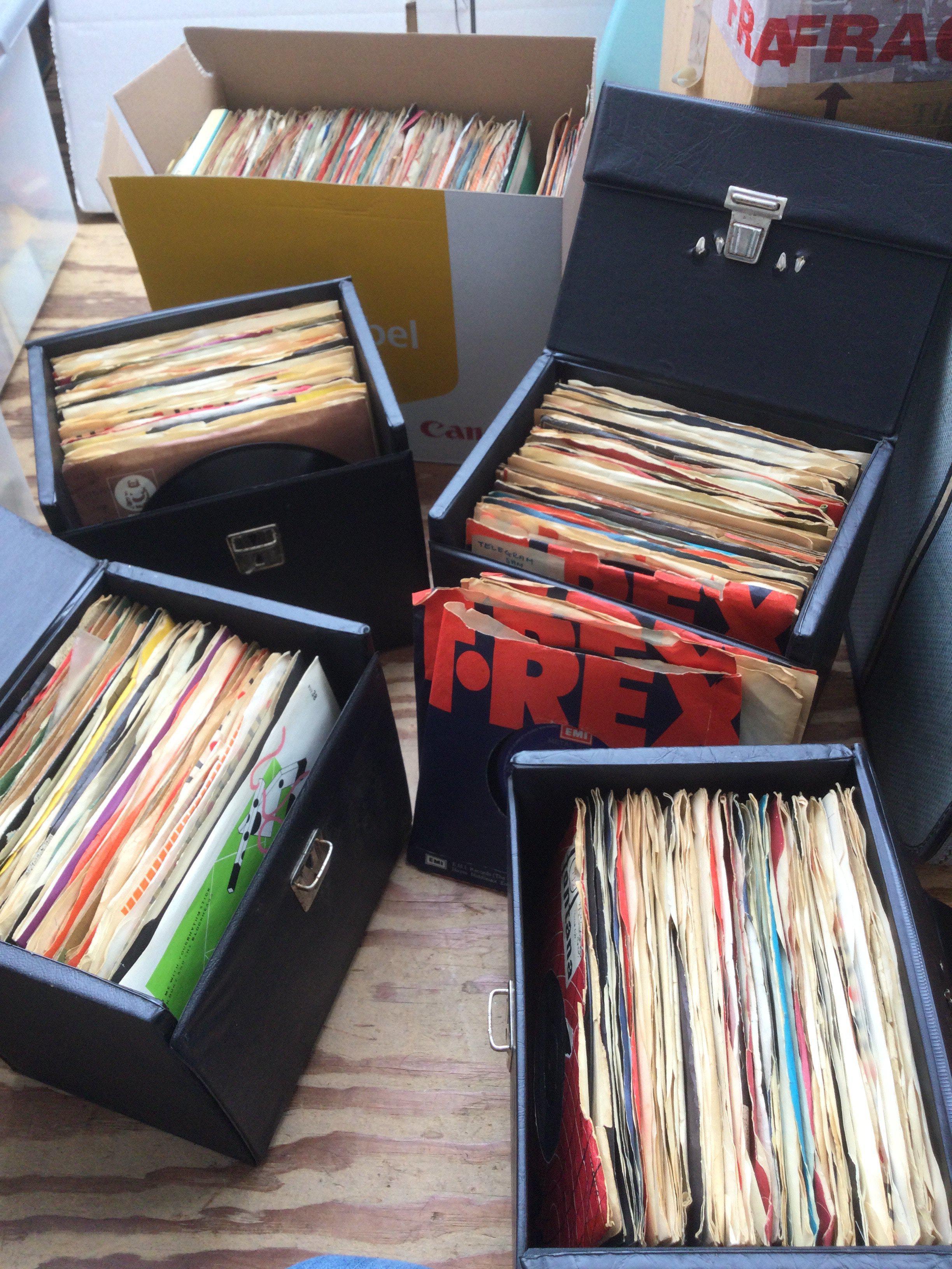Four record cases and a box of 7" singles by various artists from the 1960s onwards including The Beatles, T Rex, David Bowie, Led Zeppelin and many more (5).