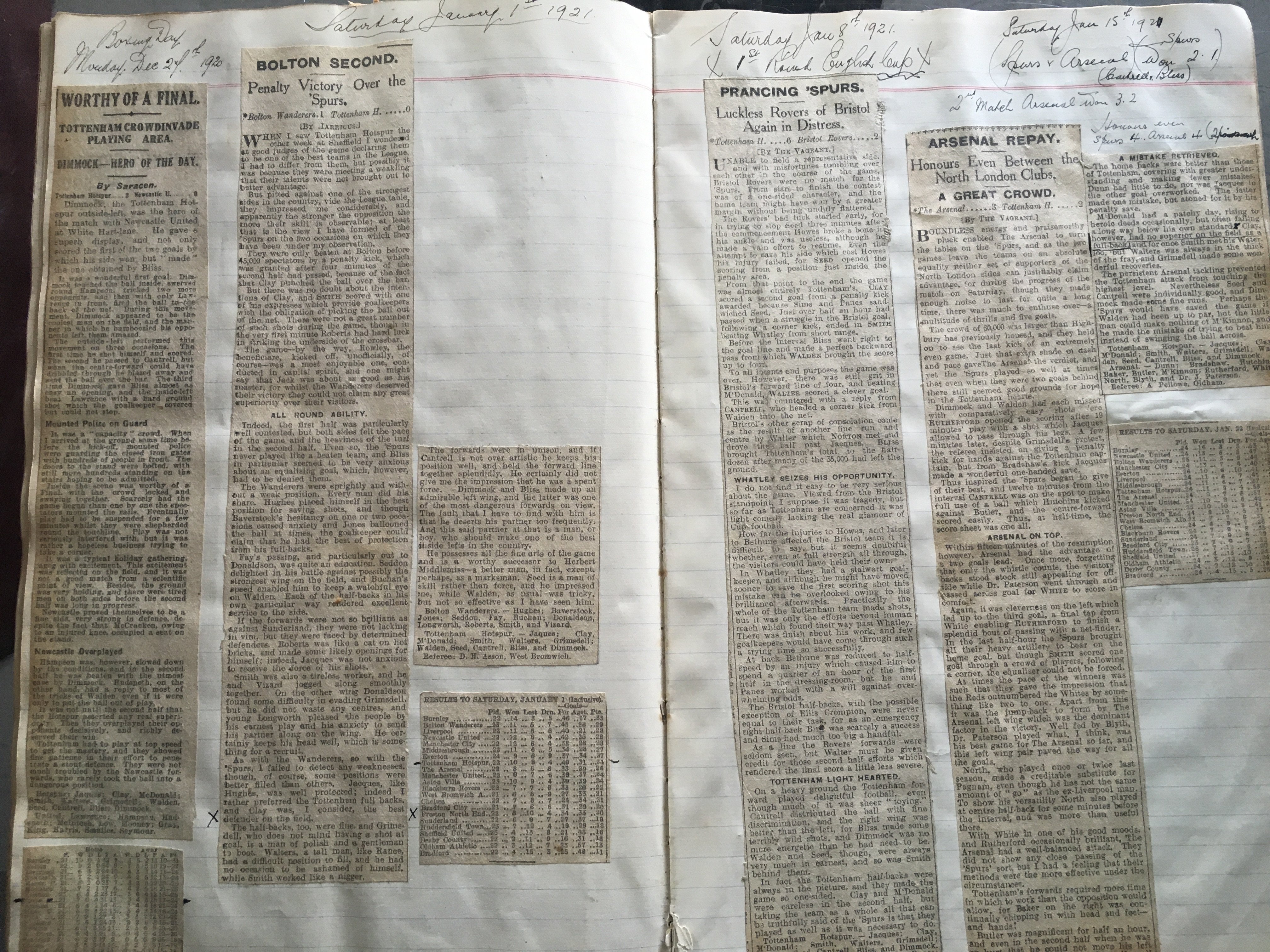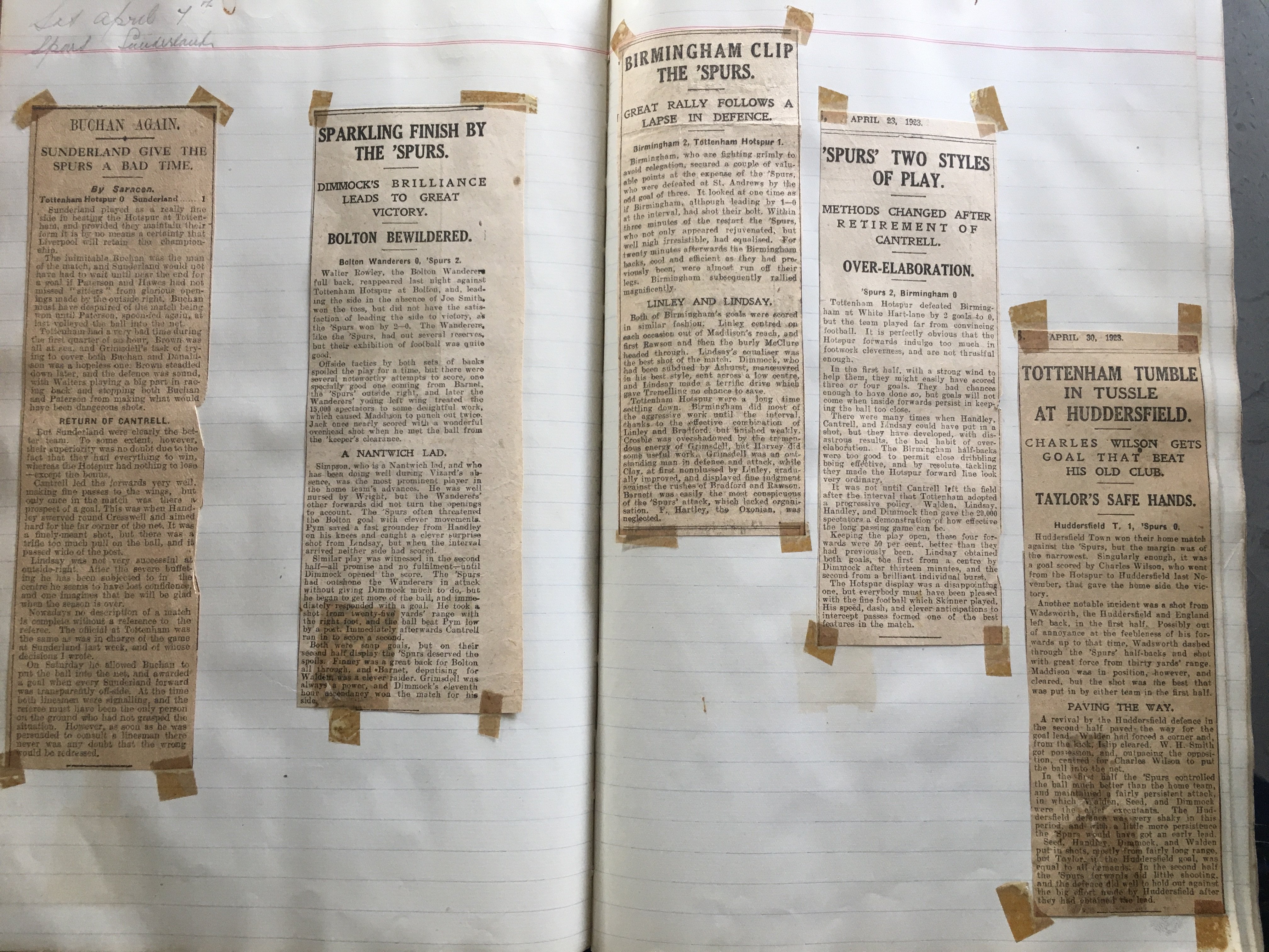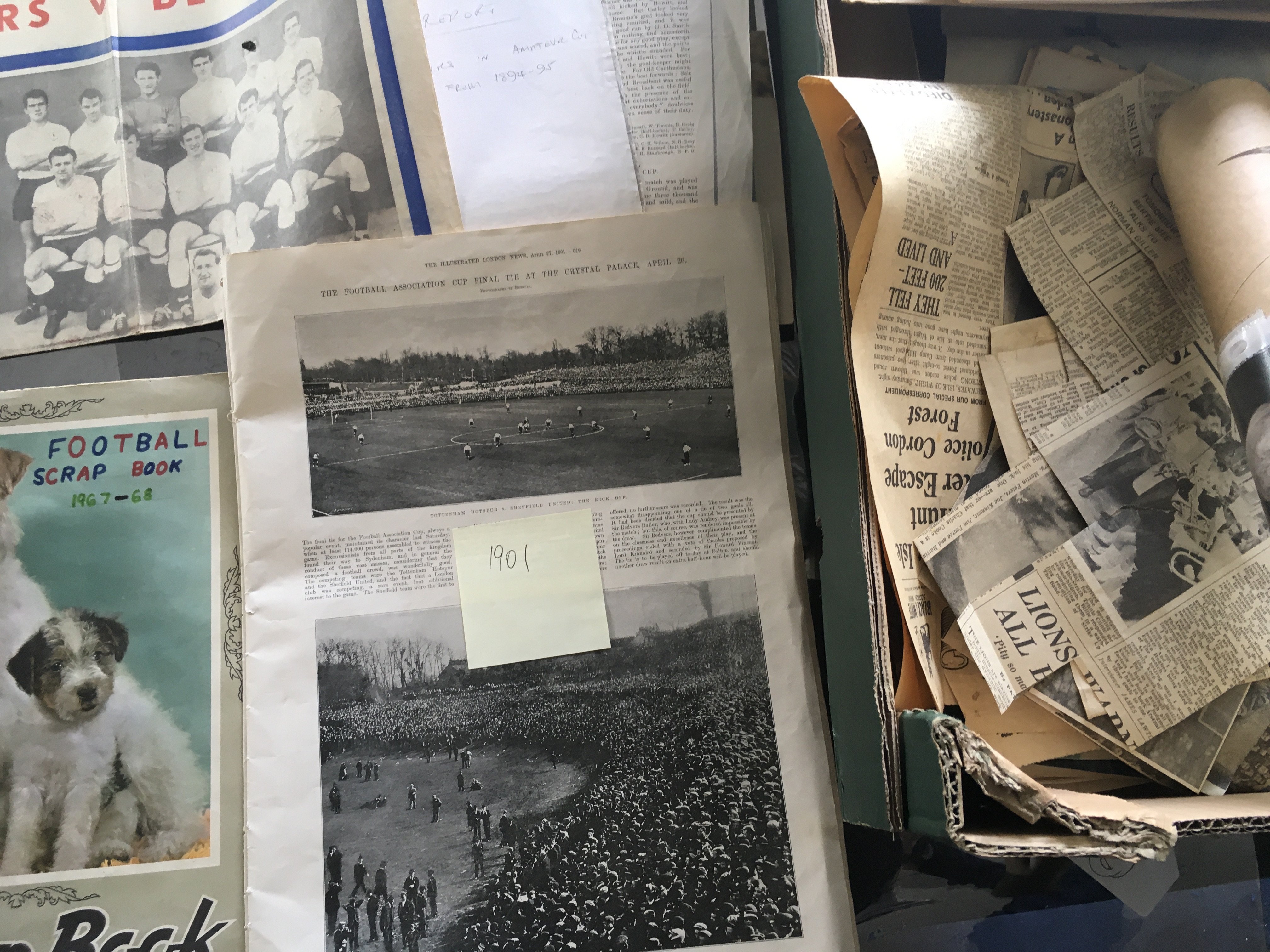 Tottenham 1920s Football Scrapbook: Early 1920s scrapbook with comprehensive match reports taken from newspapers, whole page from Illustrated London News on the 1901 FA Cup final plus newspaper cuttings including scrapbook from 67/68, Jimmy Greaves signed print and more, with instructions to sell.