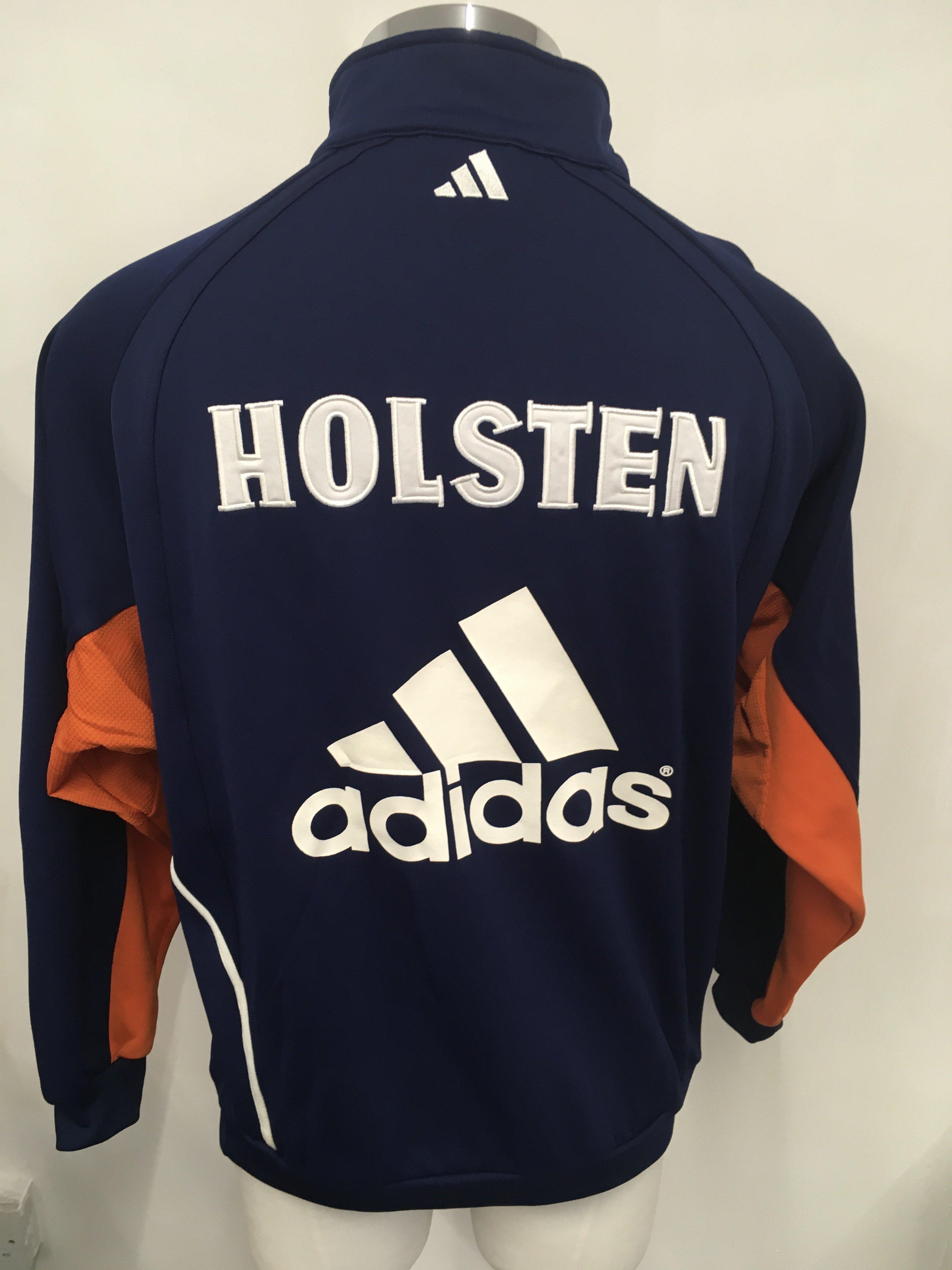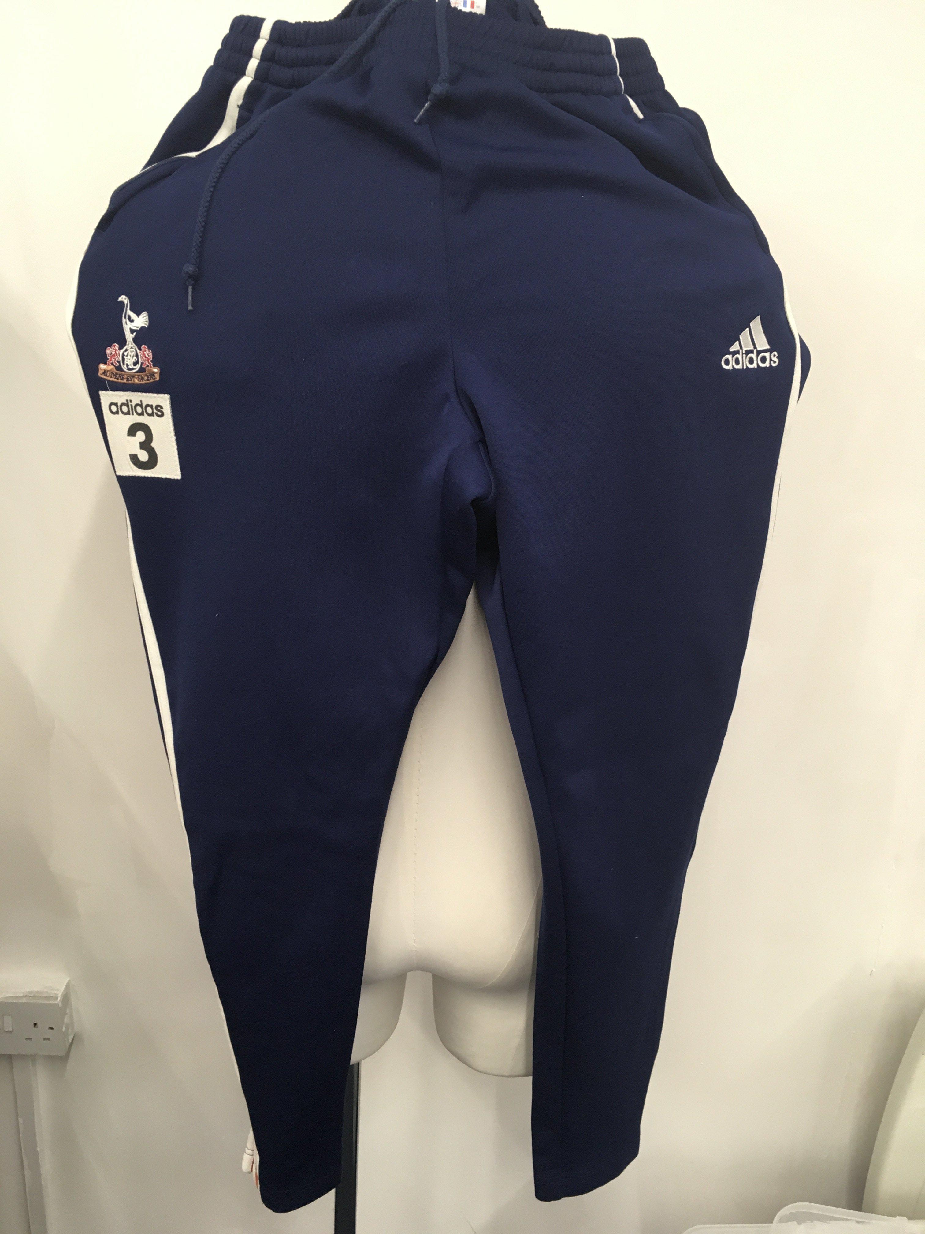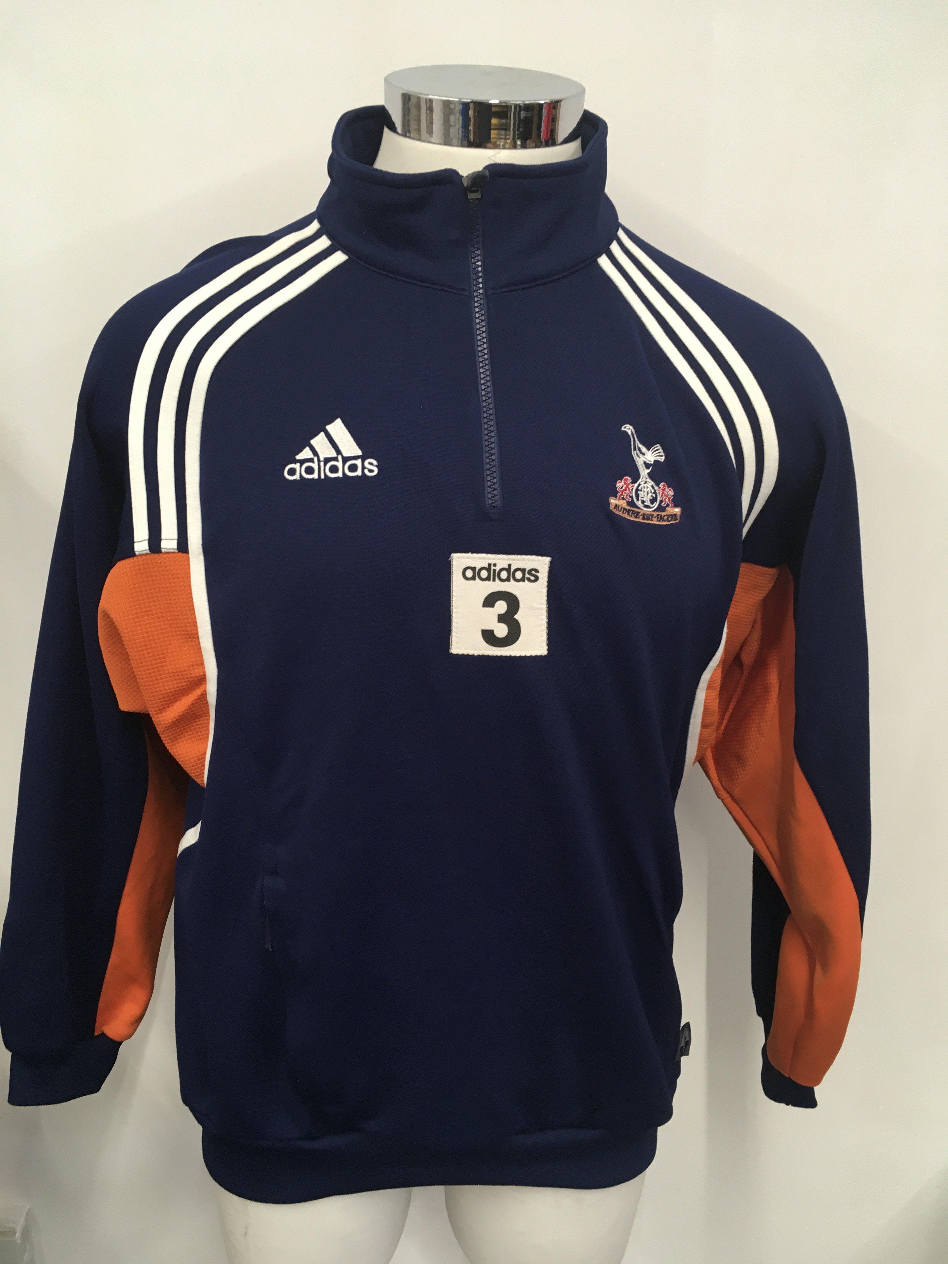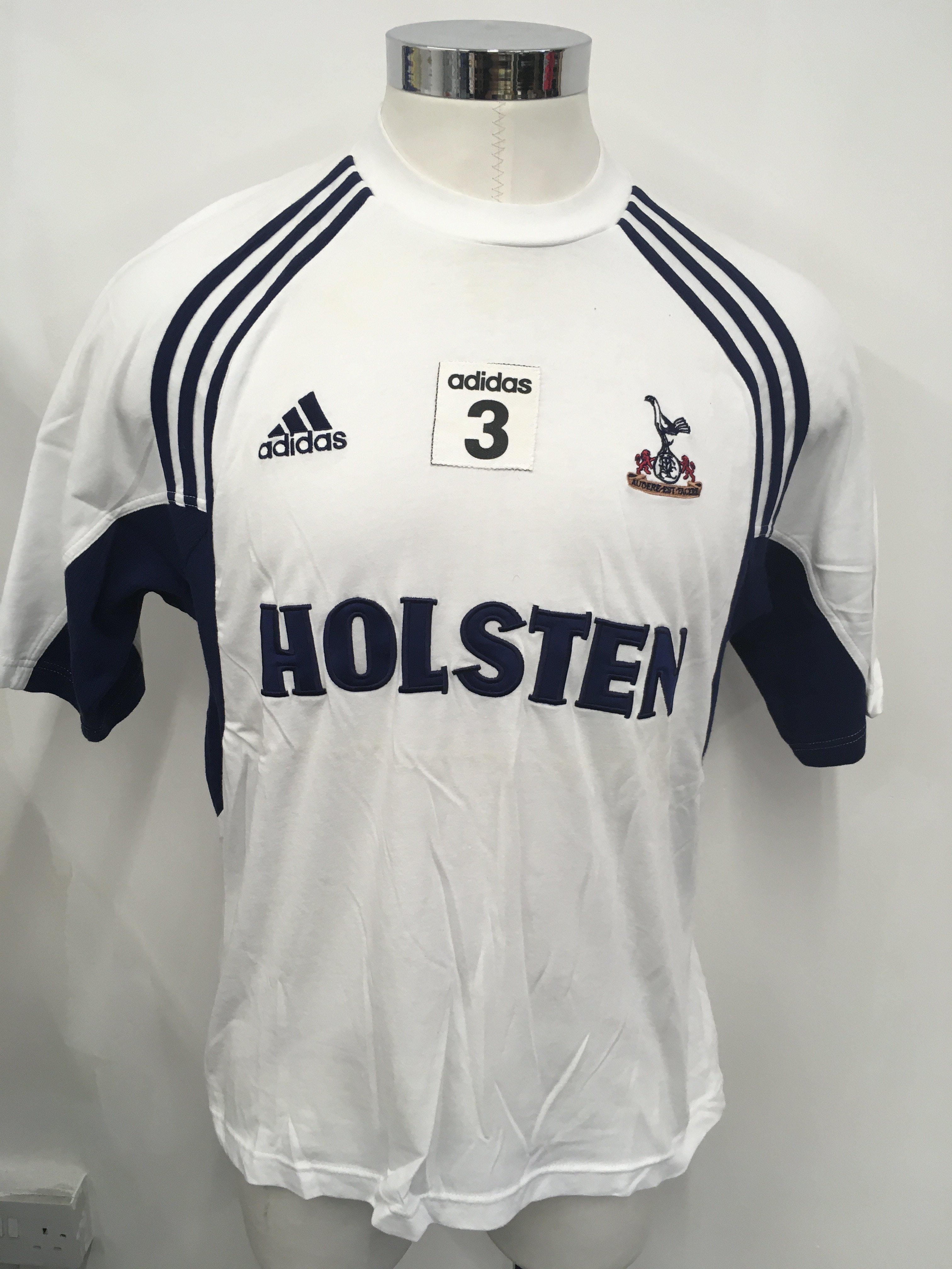 Tottenham 2000 - 2001 Player Issue Training Top + Track Suit: Worn by Mauricio Taricco consisting of a white Adidas Holsten short sleeve top with number 3 stitched to front. Tottenham Adidas tracksuit with number 3 also stitched to both bottoms and top. Both garments having orange trim.