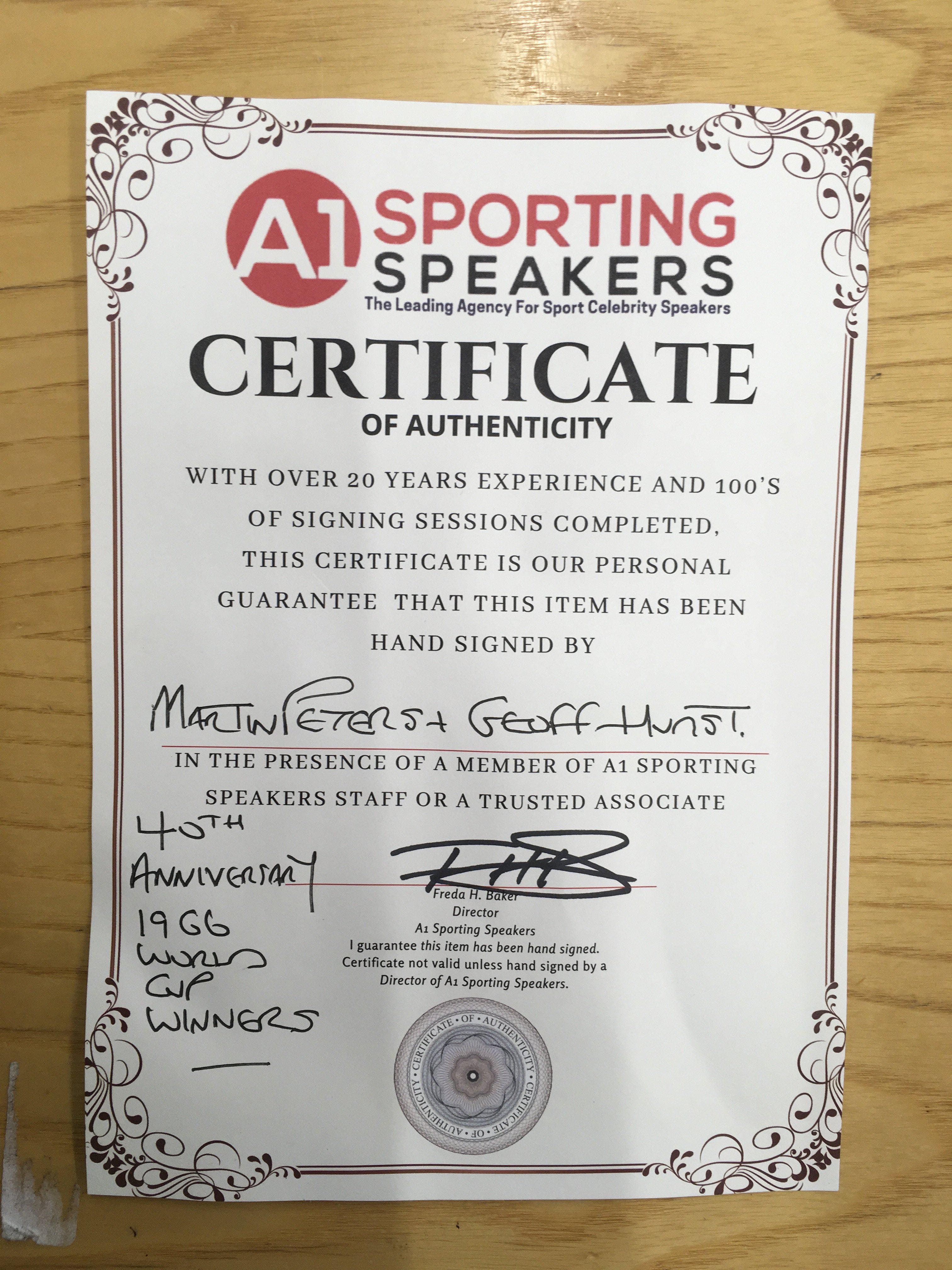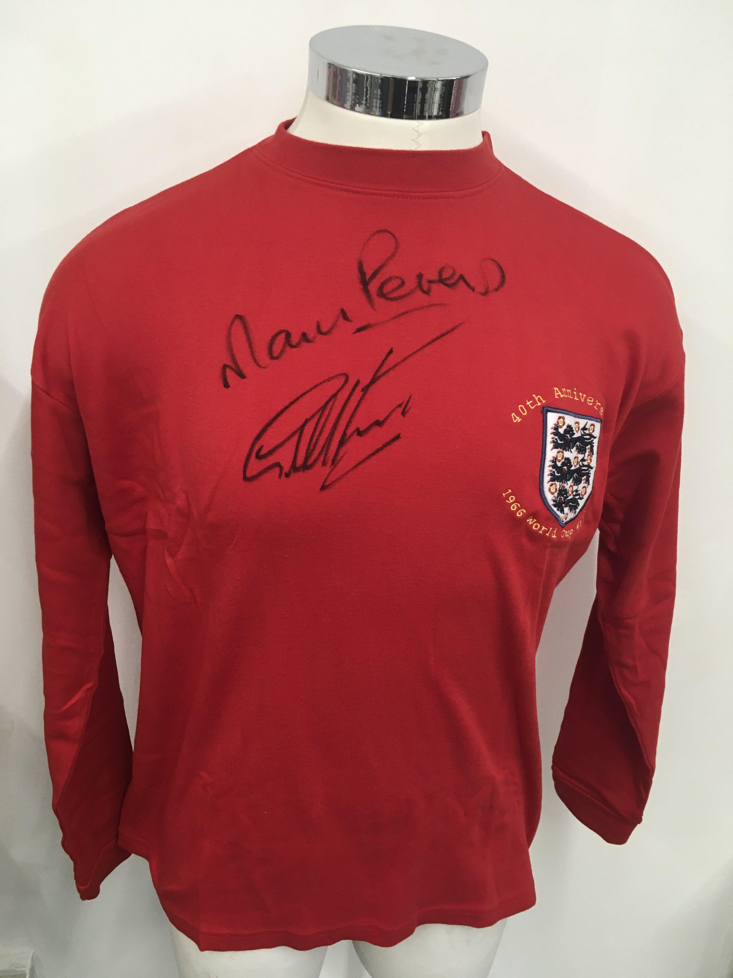 England 1966 World Cup Signed Football Shirt: Red 40th Anniversary shirt produced in 2006 signed by England winning goal scorers Peters and Hurst. Coa from reputable source.
