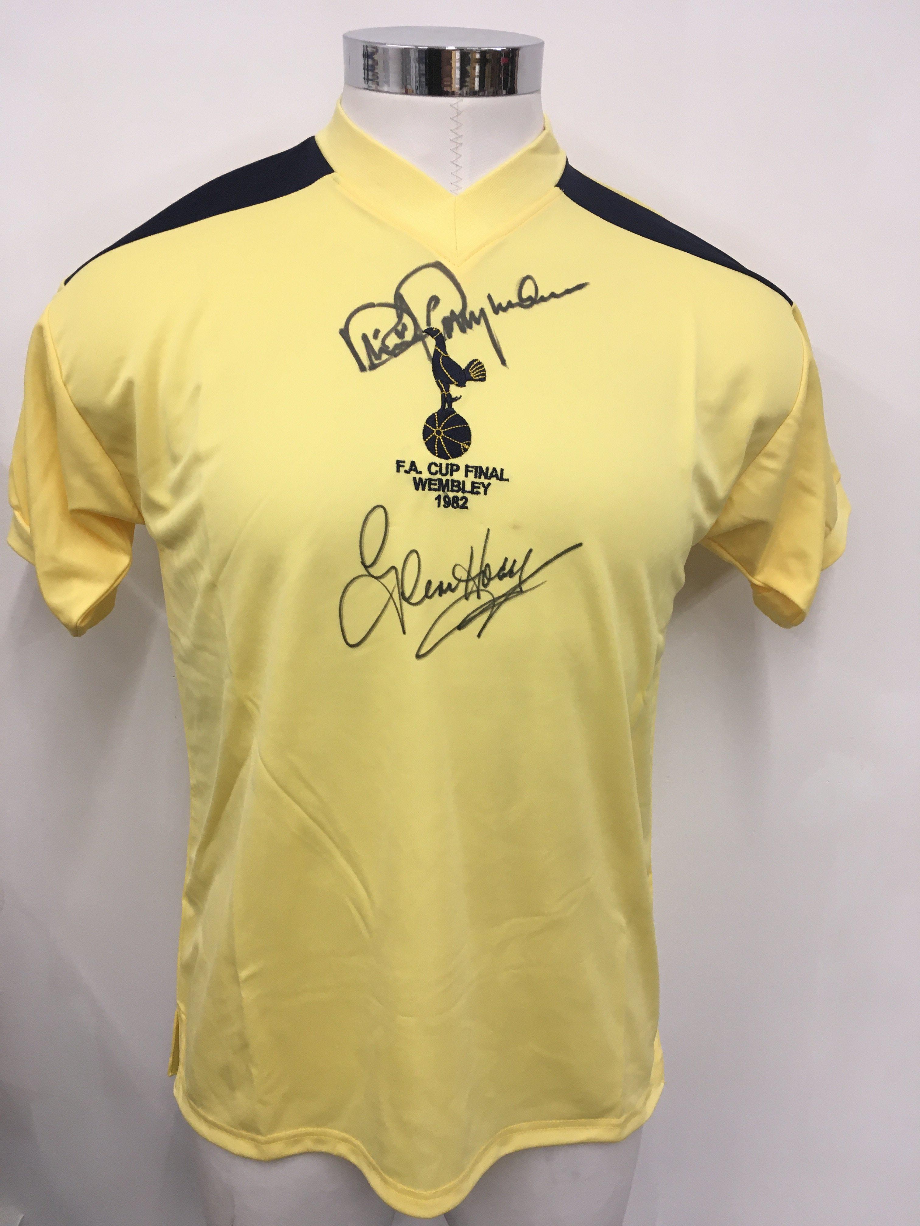 Tottenham 1982 FA Cup Final Signed Football Shirt: Yellow brand new with tags retro shirt with FA Cup Final Wembley 1982 to breast below cockerel. Signed to front by goal scorer and captain Perryman and Hoddle. Coa from reputable source.