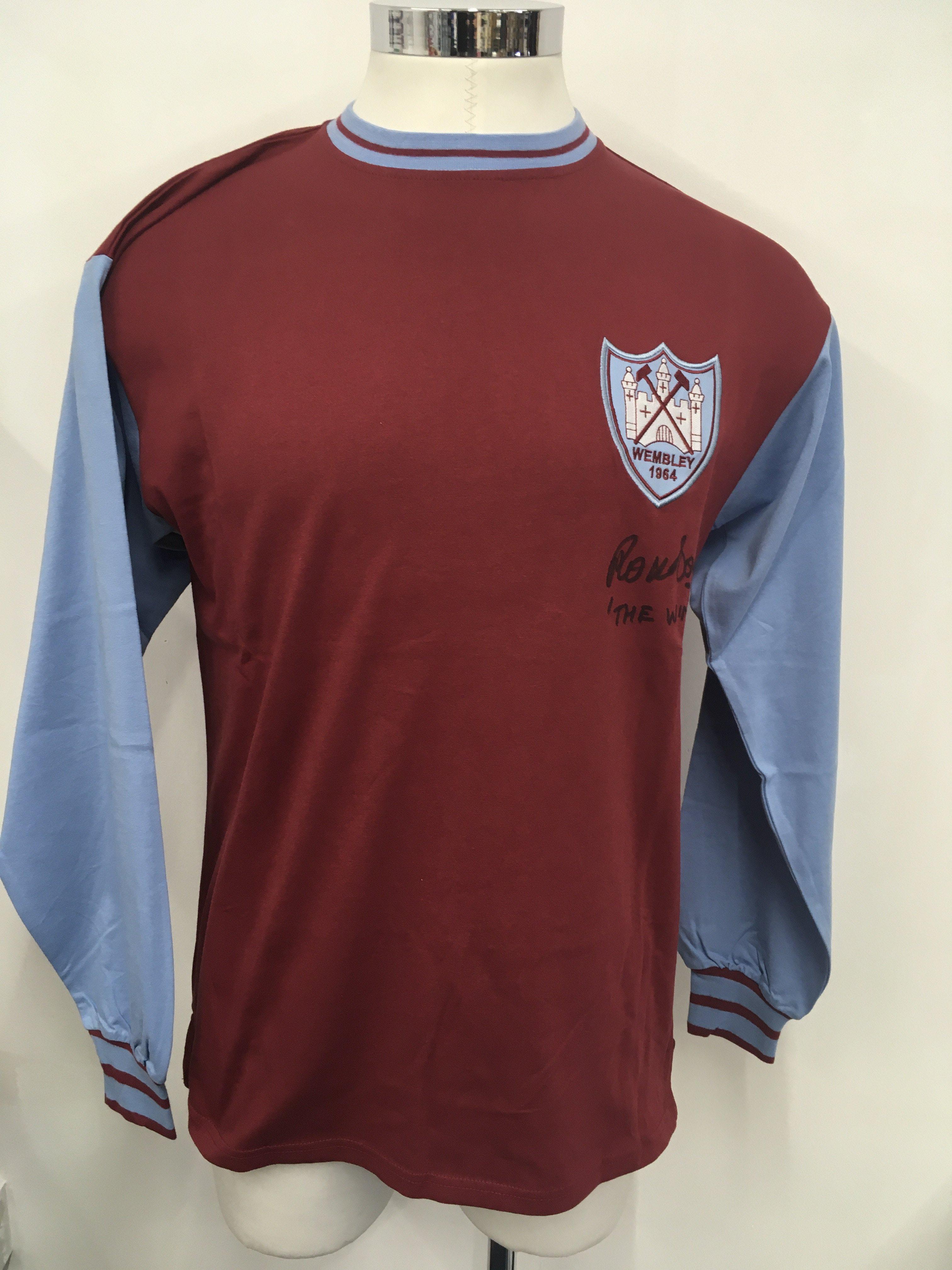 West Ham 1964 FA Cup Final Signed Football Shirt: Claret and blue brand new with tags retro shirt with Wembley 1964 to breast below West Ham badge. Signed to front by Ron Boyce who has written The Winner which is reference to his 90th minute winning goal. Coa from reputable source.