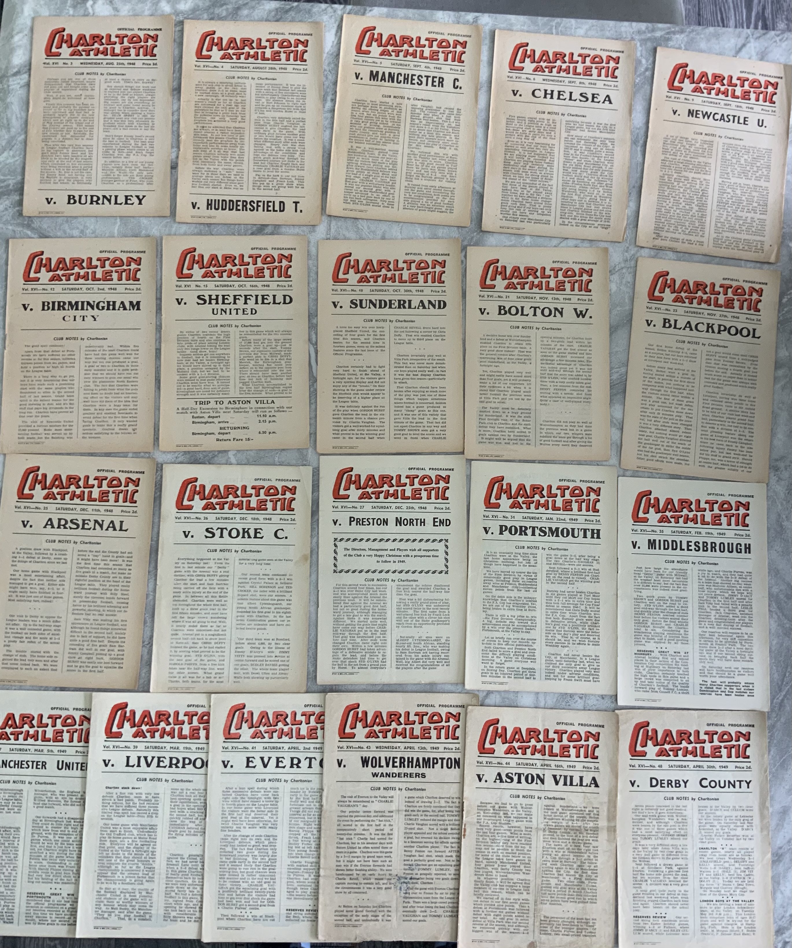 Charlton 48/49 Complete Home Football Programmes: Excellent condition full set of league homes. (21)
