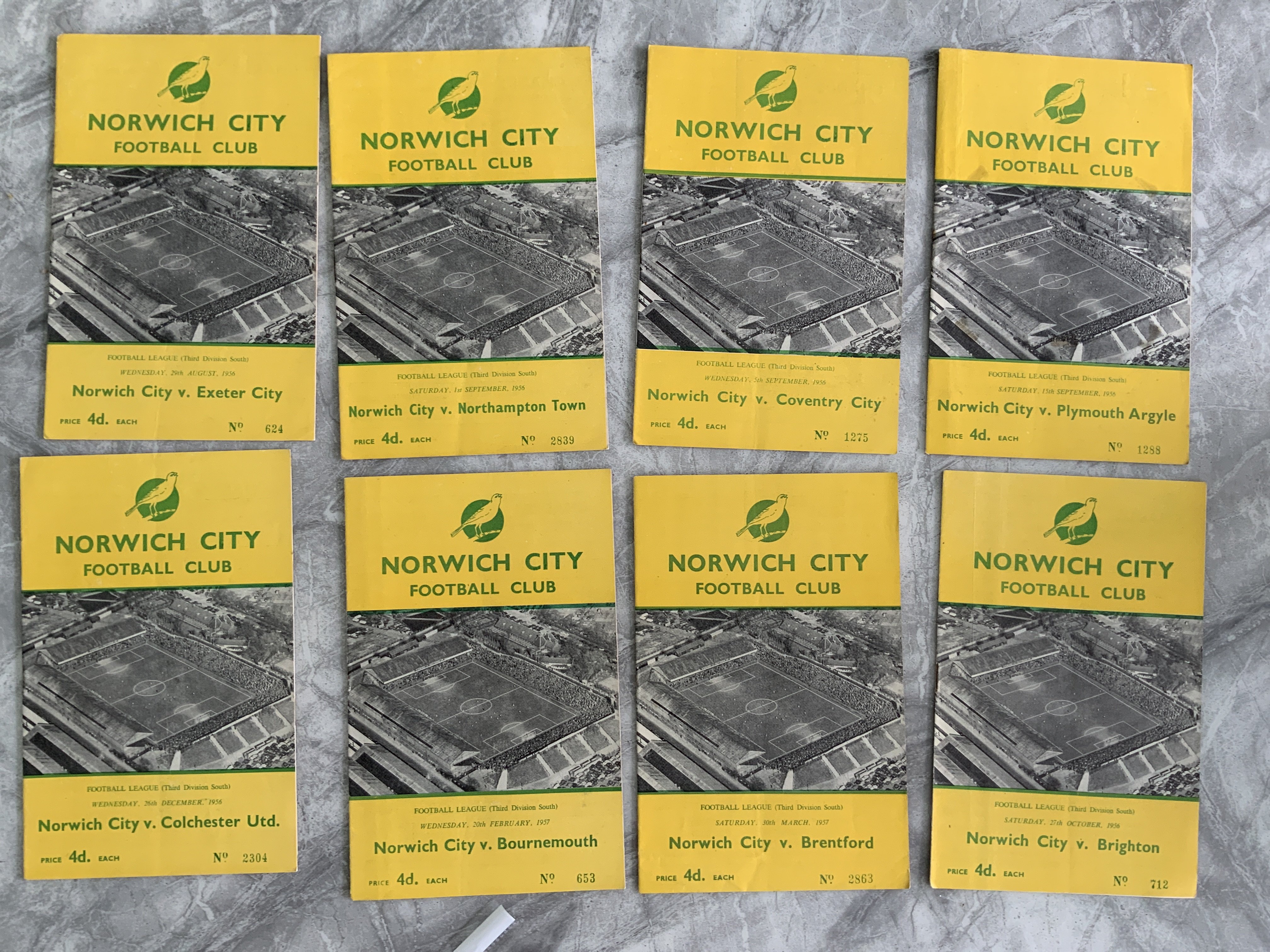 56/57 Norwich City Home Football Programmes: Excellent condition division 3 south matches to include Brighton Bournemouth Colchester Exeter Coventry and Plymouth. (8)