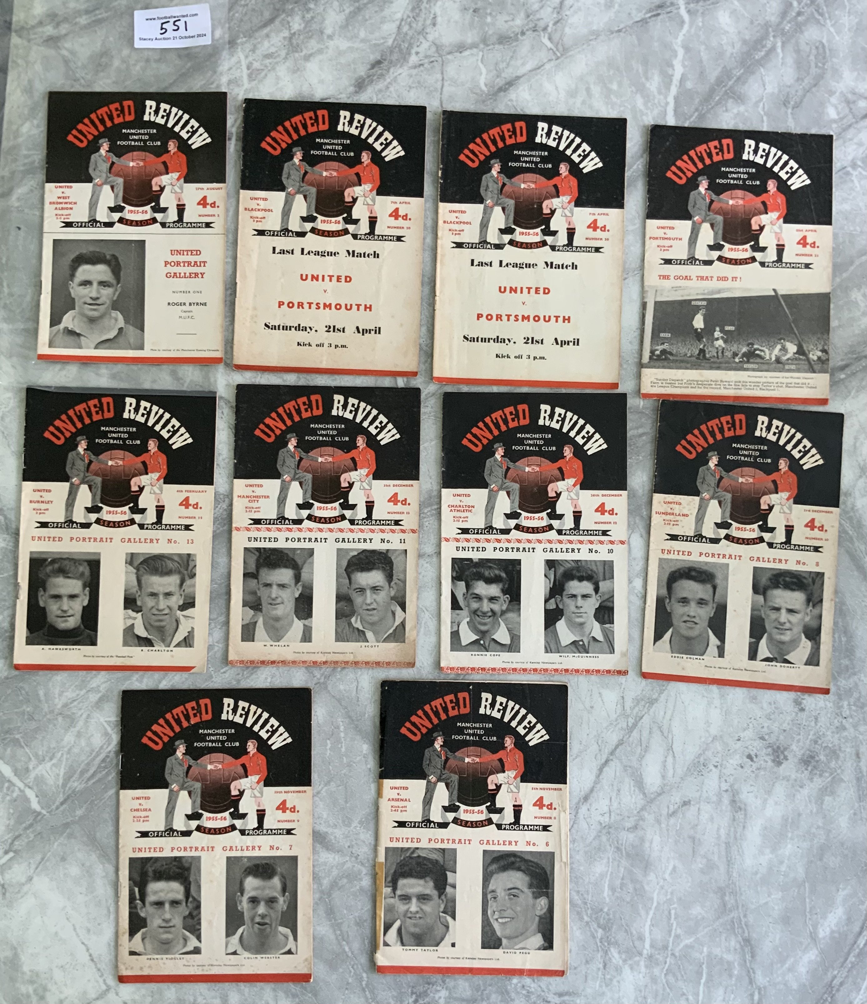 Manchester United 55/56 Champions Home Football Programmes: Charlton Sunderland Man City Burnley Portsmouth West Brom Chelsea and two v Blackpool all good with Arsenal having taped spine. (10)