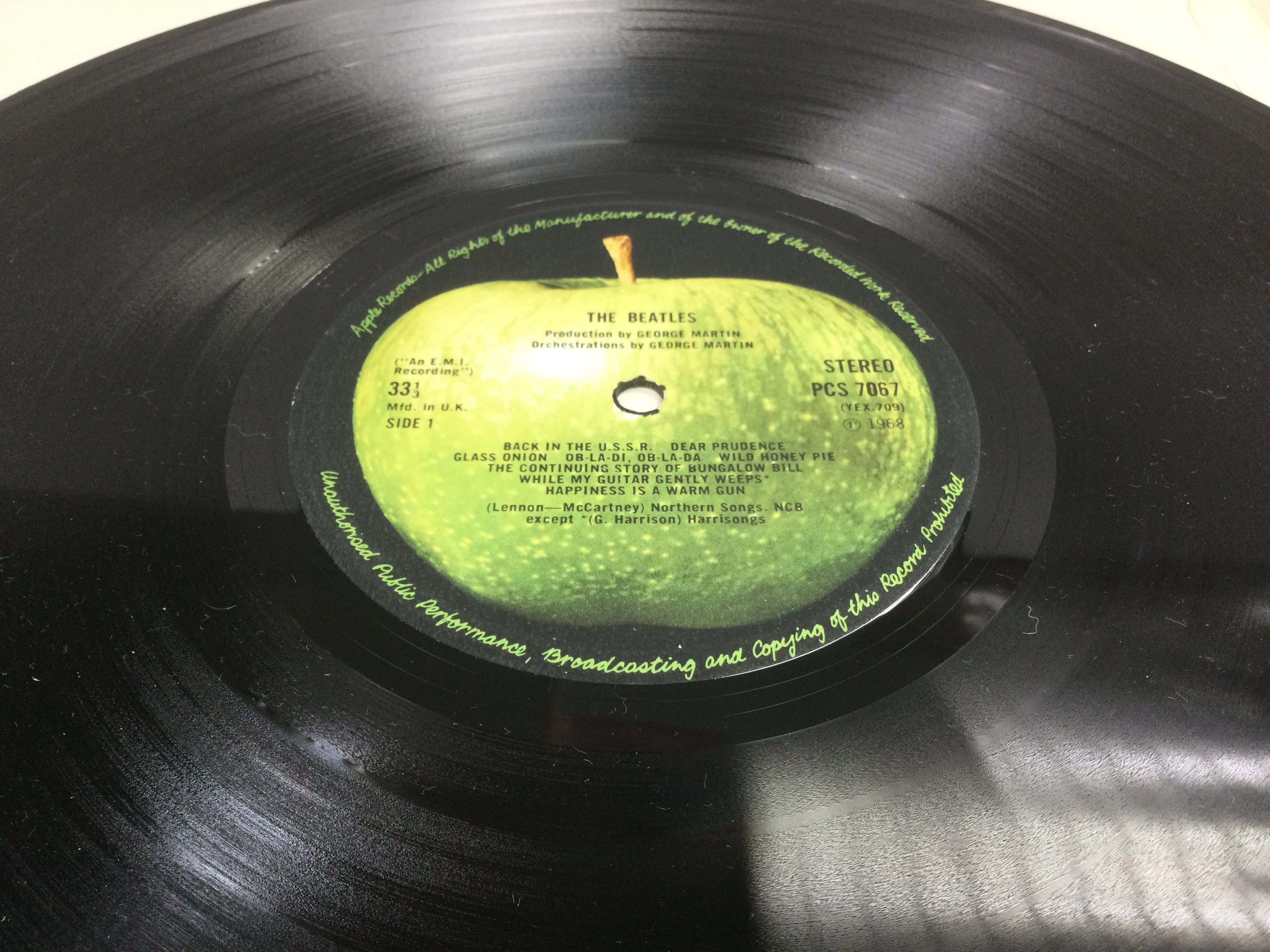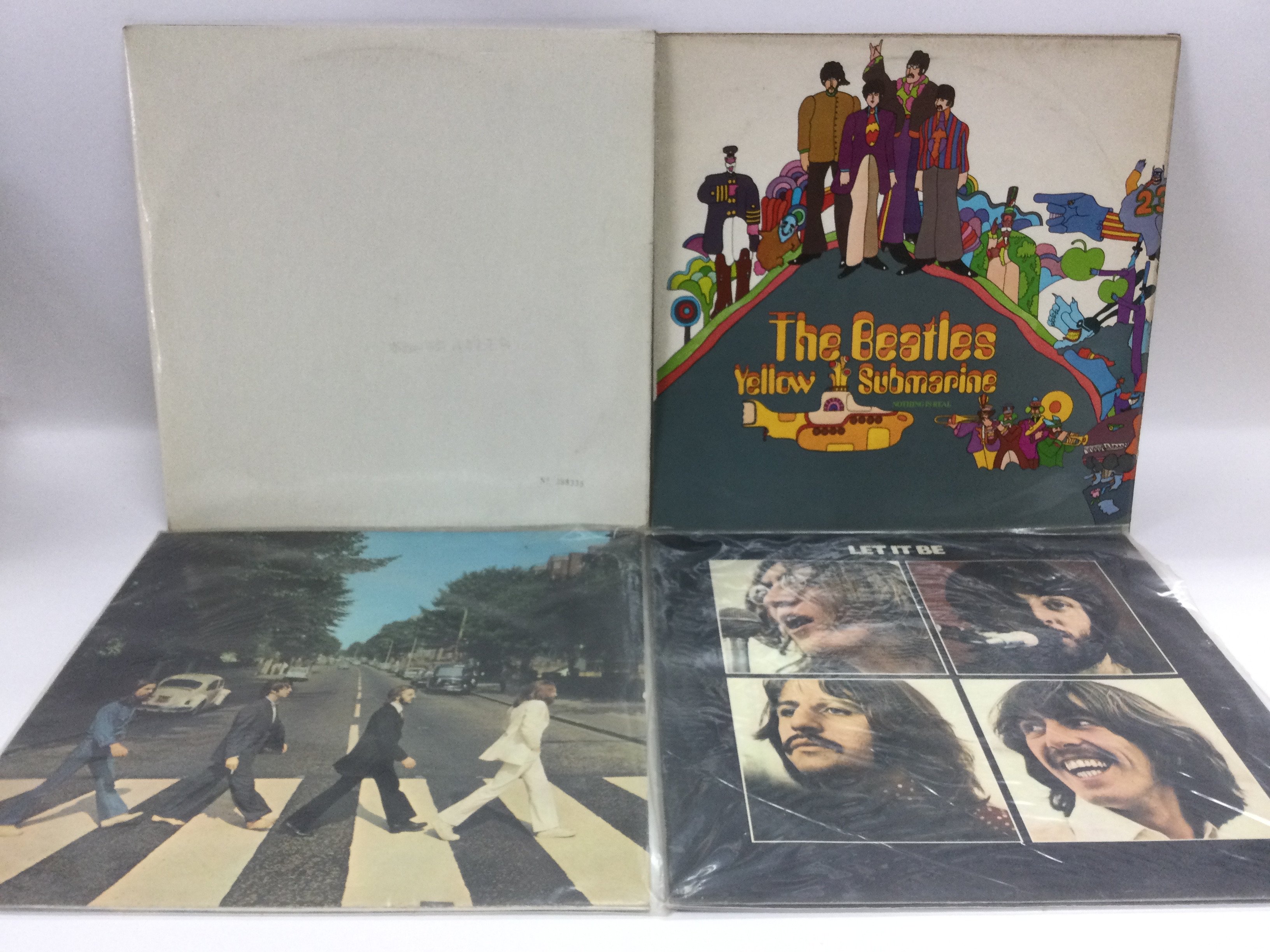Four Beatles LPs comprising a side opening and numbered 'White Album' stereo pressing, 'Yellow Submarine', 'Abbey Road' and 'Let It Be'.