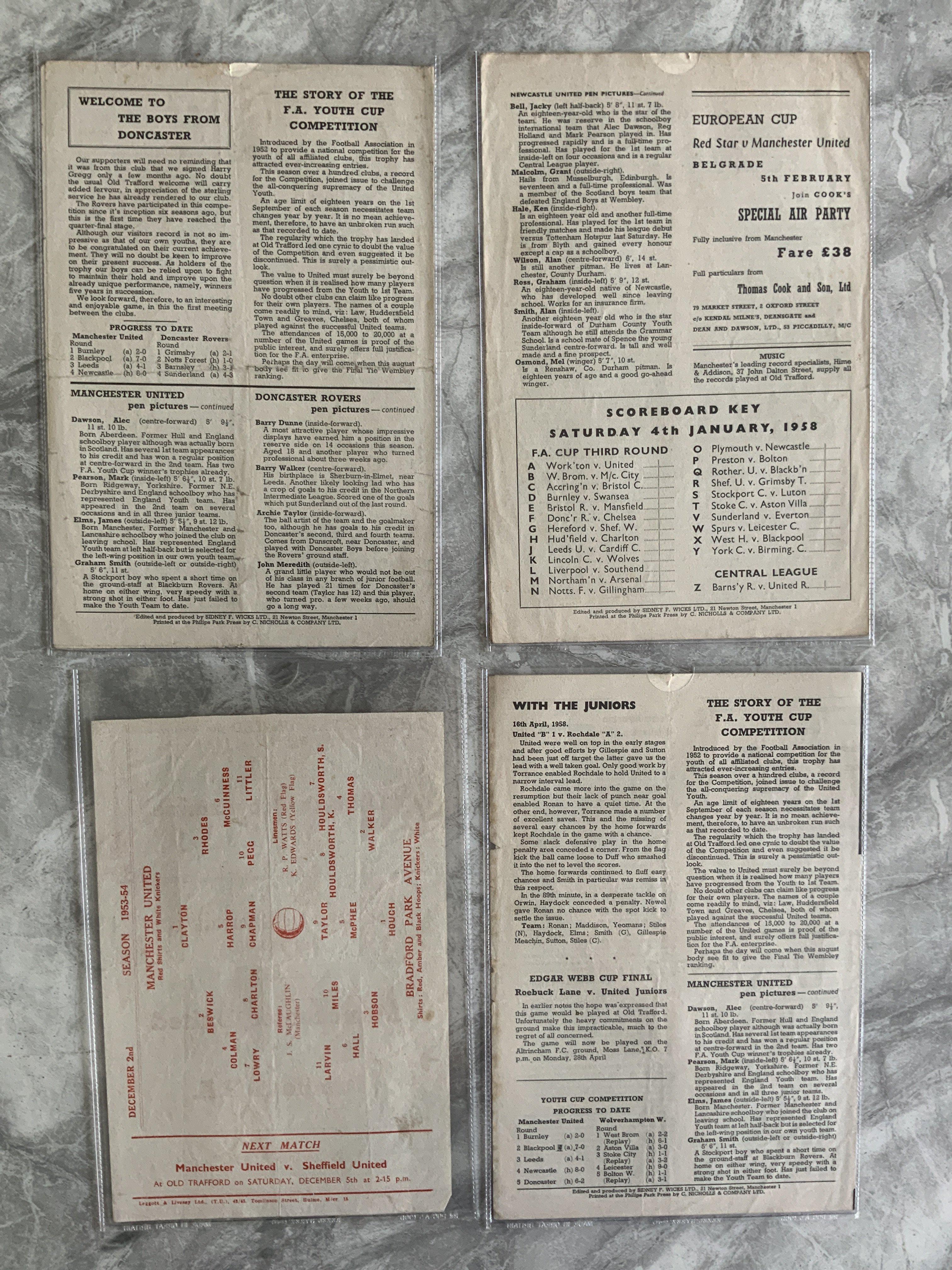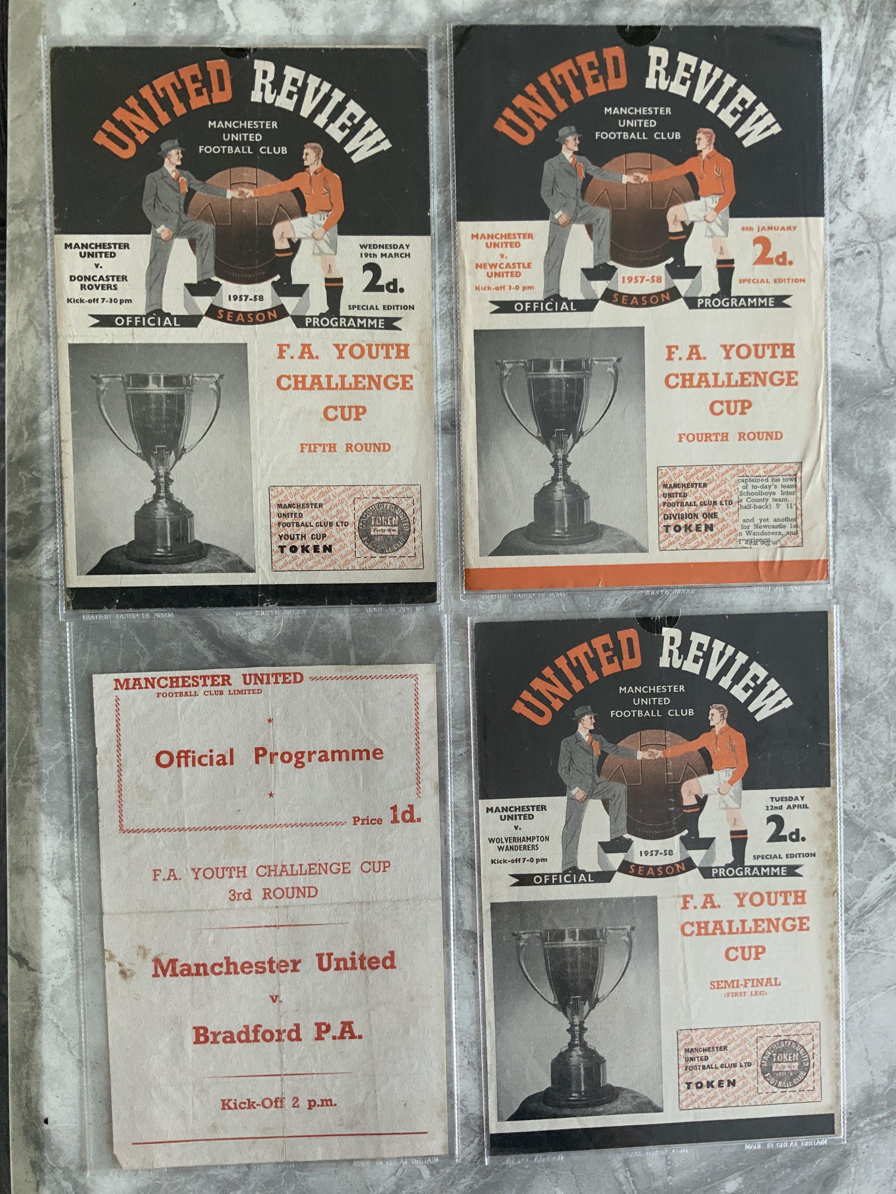 Manchester United 1950s Youth Cup Football Programmes: Home programmes v 53/54 Bradford Park Avenue, 57/58 Newcastle tm, Doncaster, Wolves semi final. Good. (4)