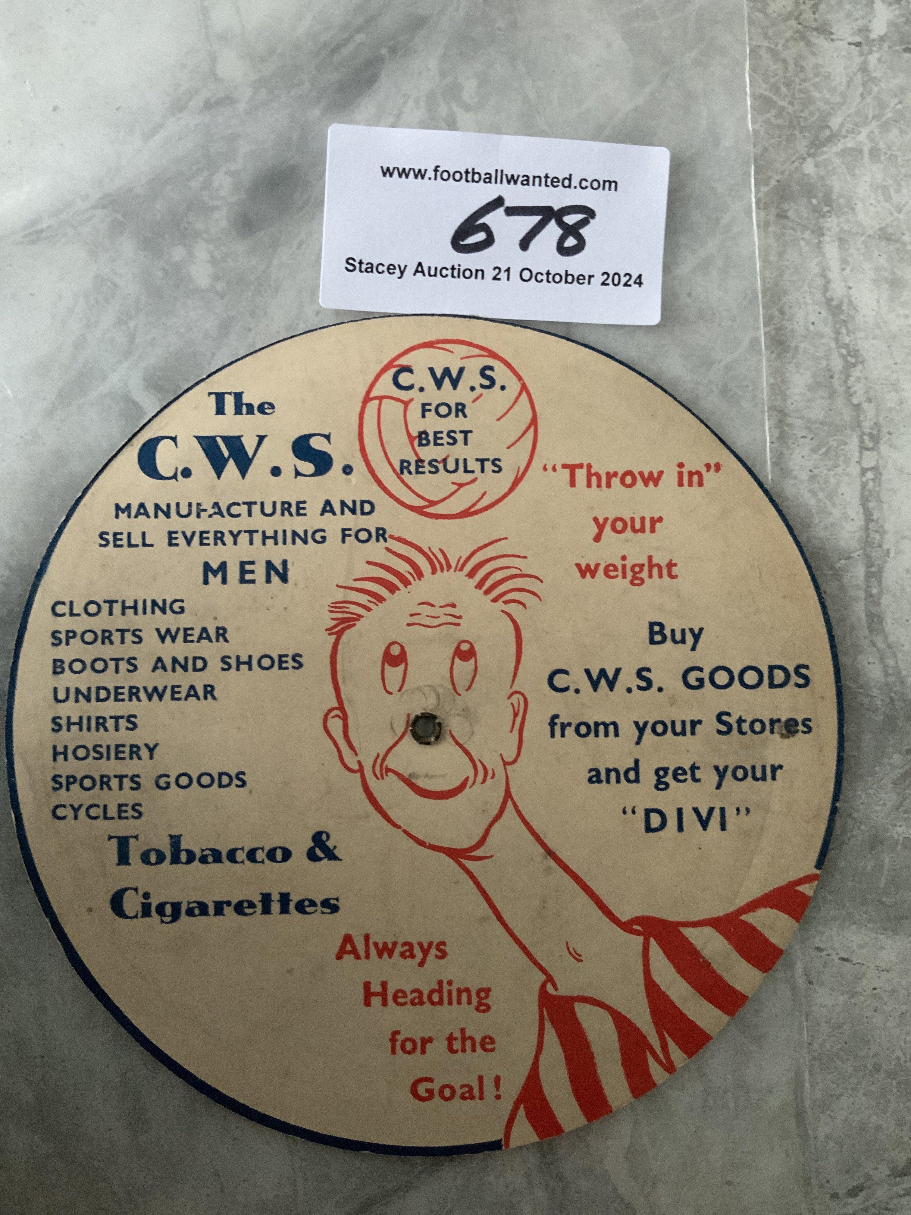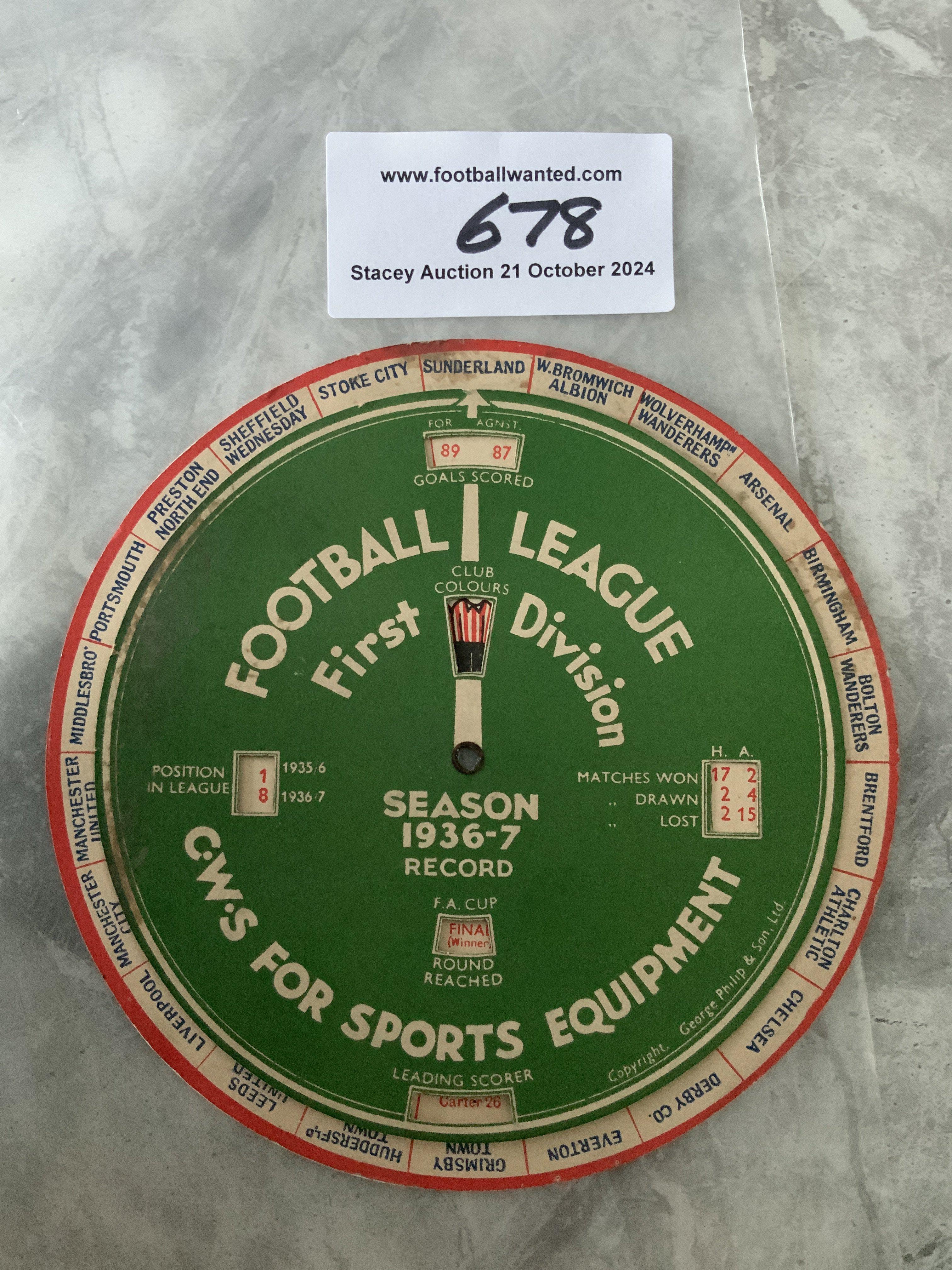 36/37 League Statistics First Division Football Disc: Co-op stores advert one side and incredible twistable information on the other covering all first division teams. If you twist it around to your team it states where you finished in the league, highest scorer, how many points, matches won drawn and lost, goal difference and even what round you got knocked out of the FA Cup. Particularly suit Manchester City (Champions) or Sunderland (FA Cup Winners) collector.