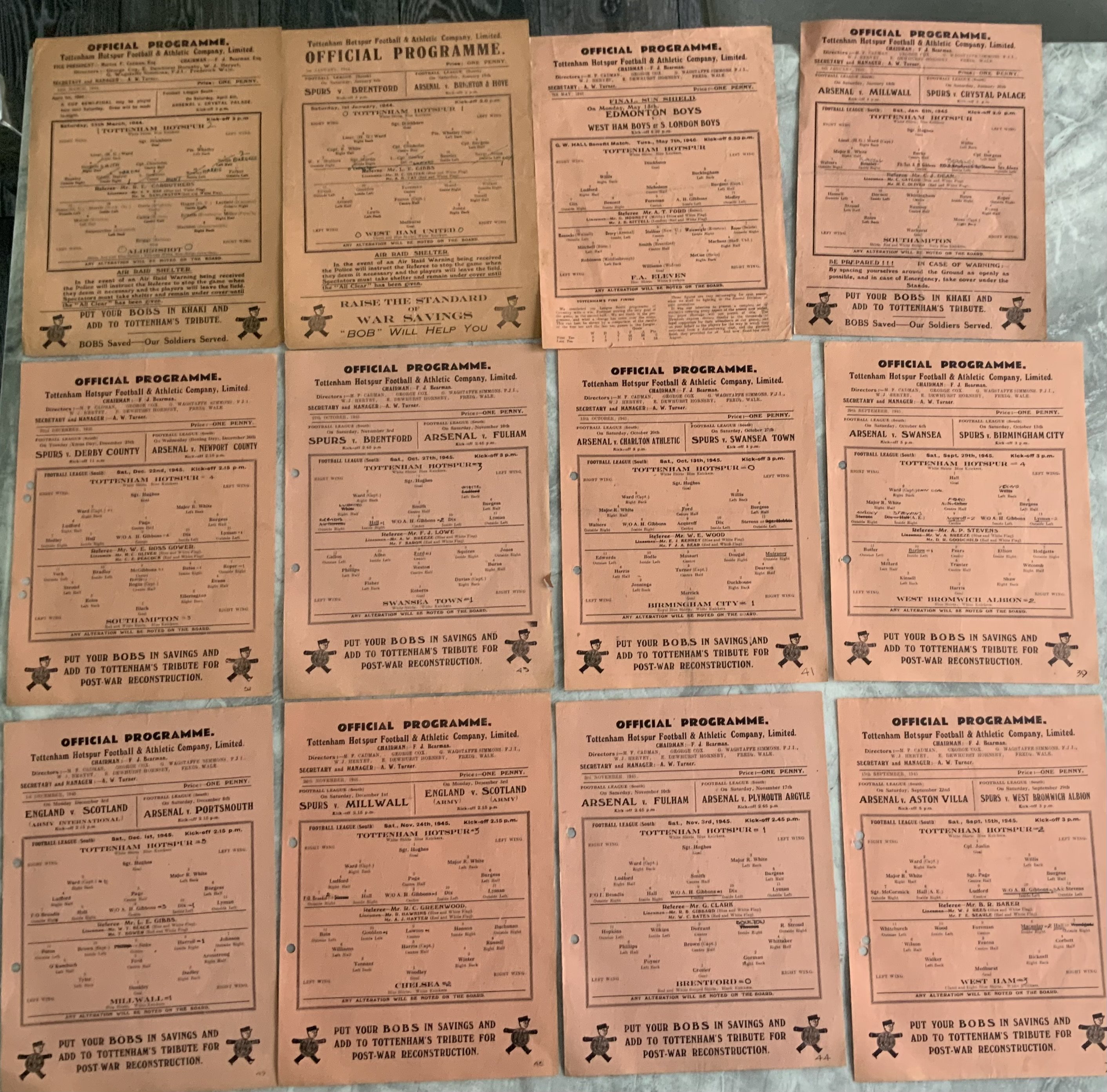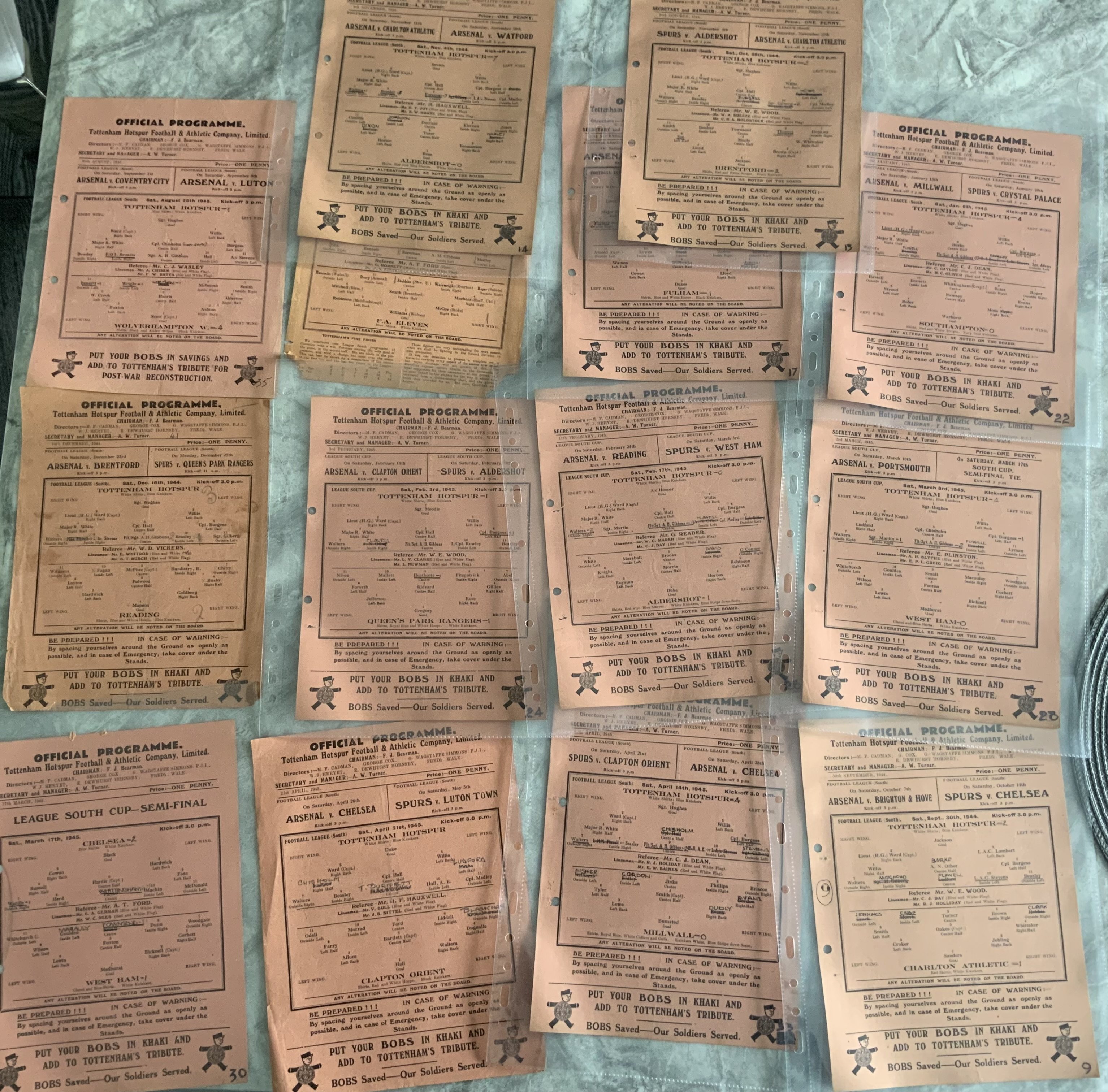 Tottenham War Time Home Football Programmes: 43/44 x 2, 44/45 x 12, 45/46 x 12. 19 of the 26 are hole punched. Includes a semi final and a benefit match. (26)