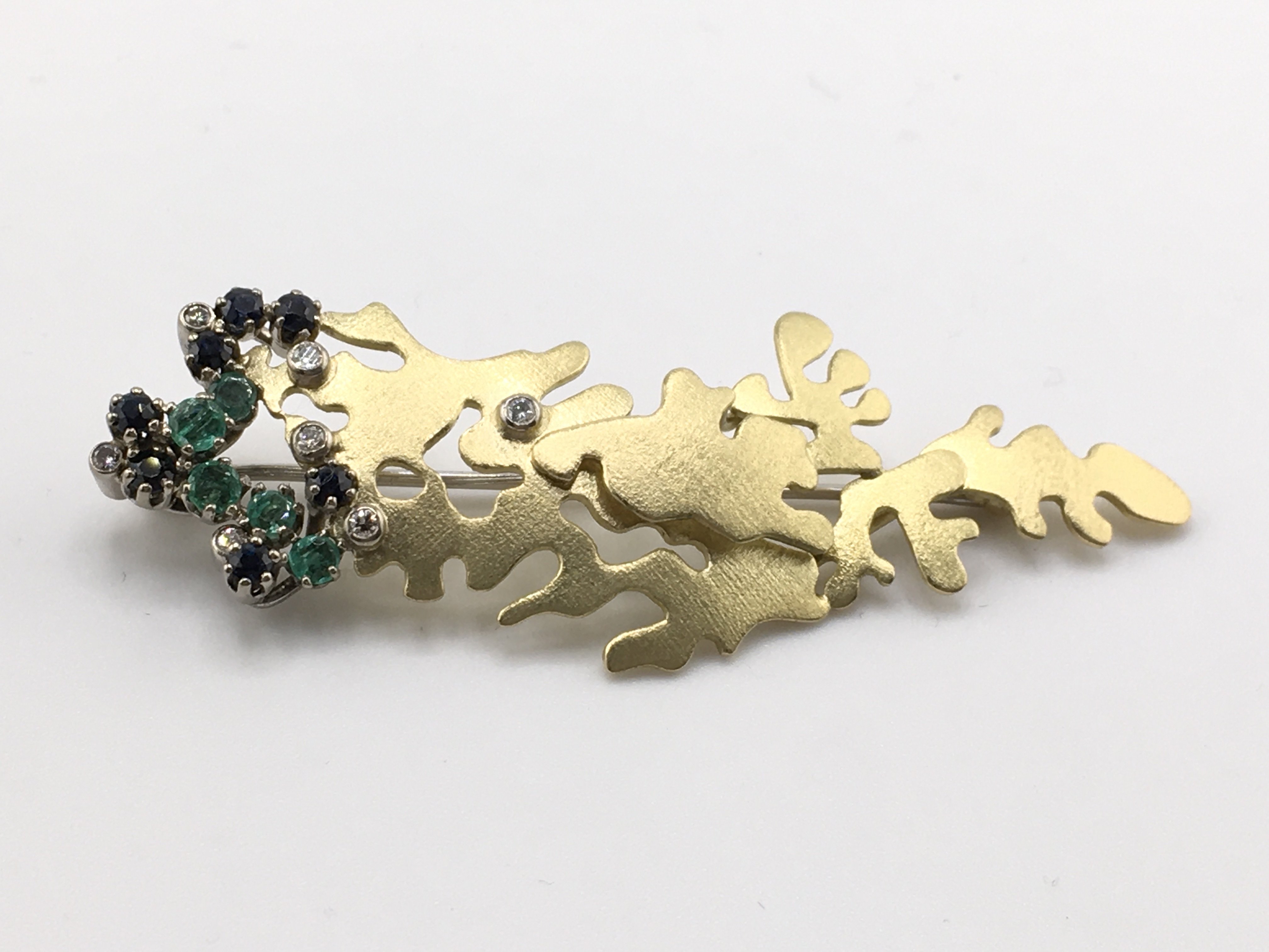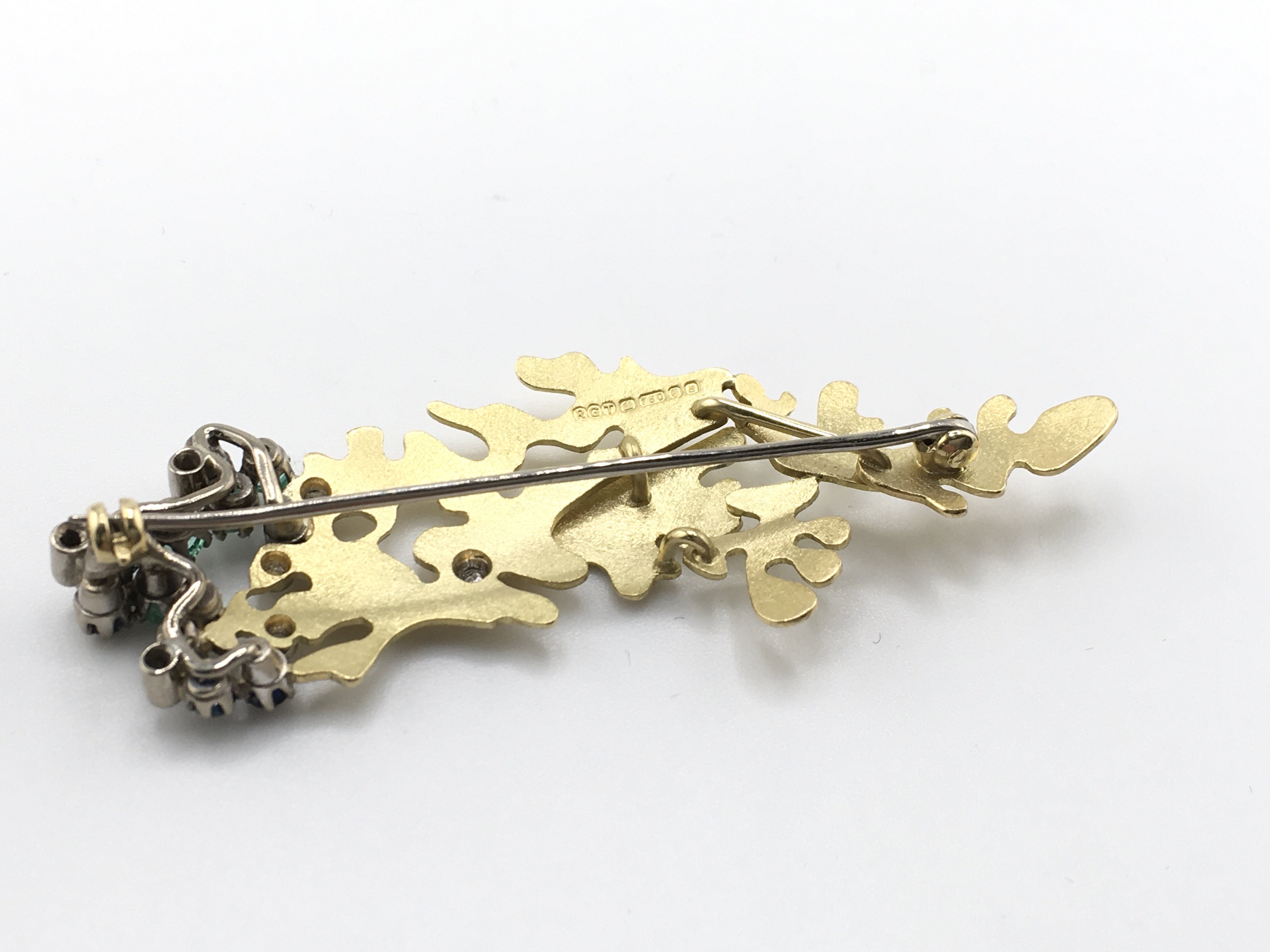An 18ct gold brooch inset with diamonds sapphires and emeralds. 11.60g and approximately 65mm wide by 20mm. Postage A