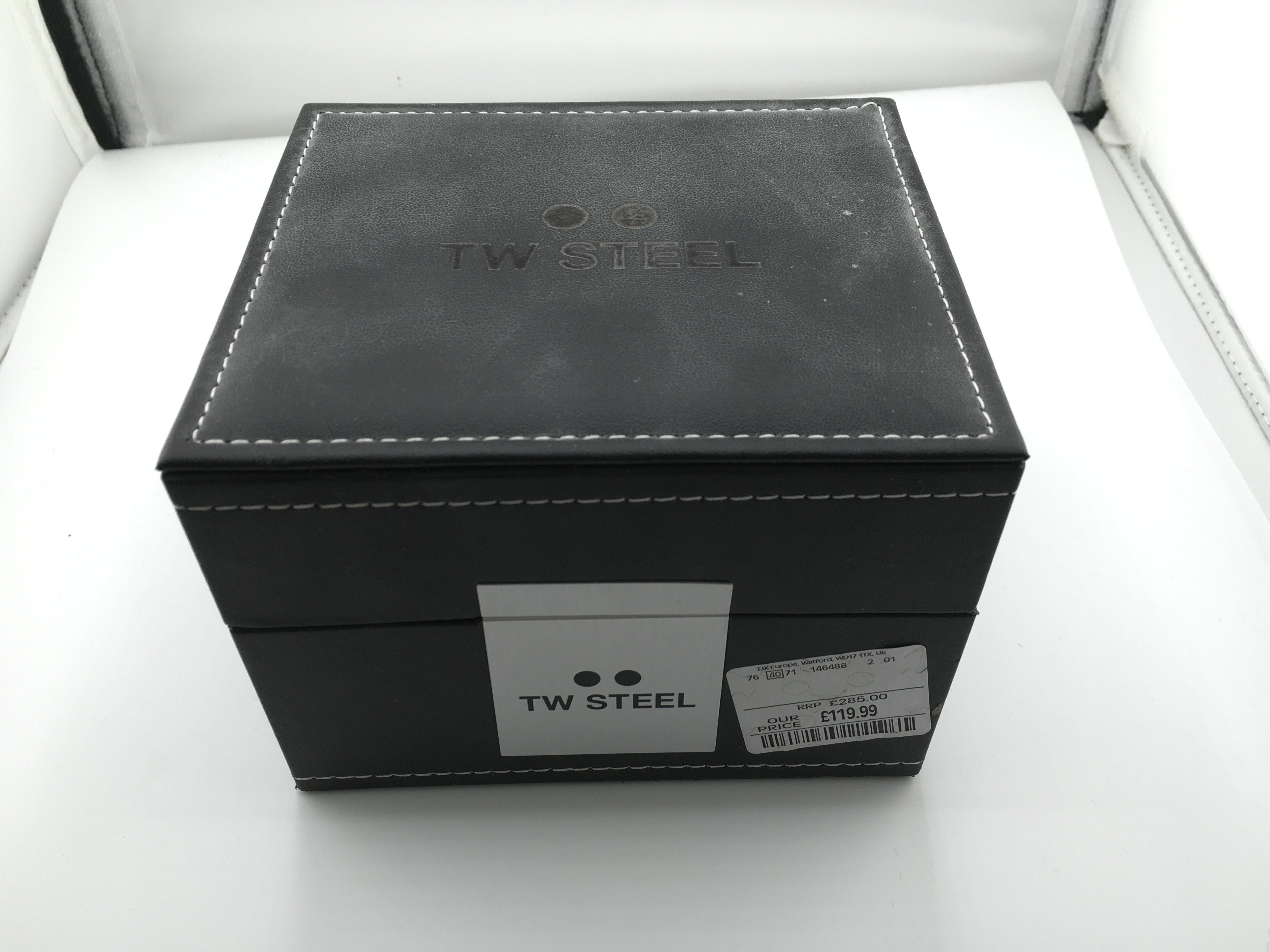 A TW Steel gents watch with box and papers. Seen working. Approximately 50mm case including crown.