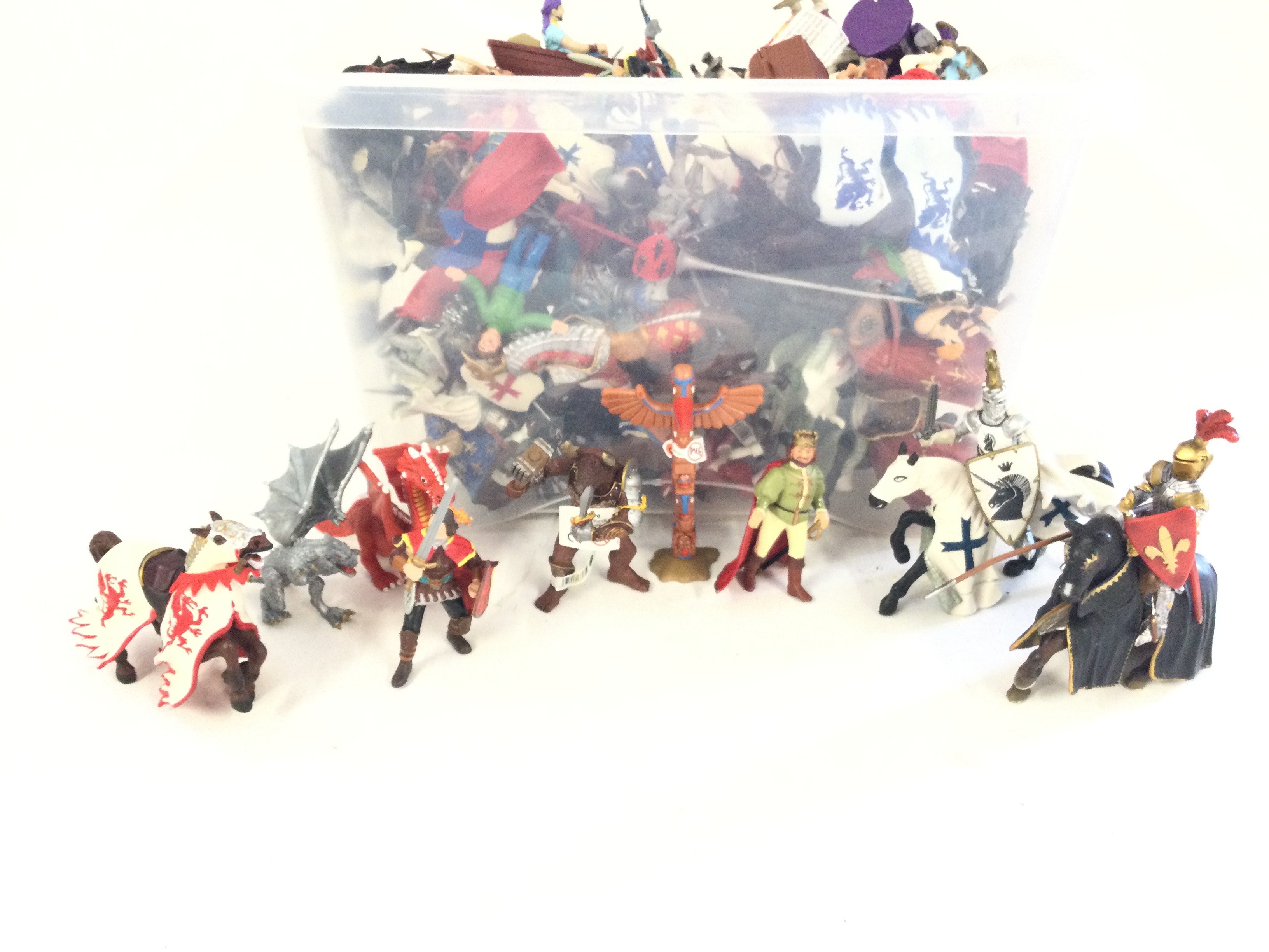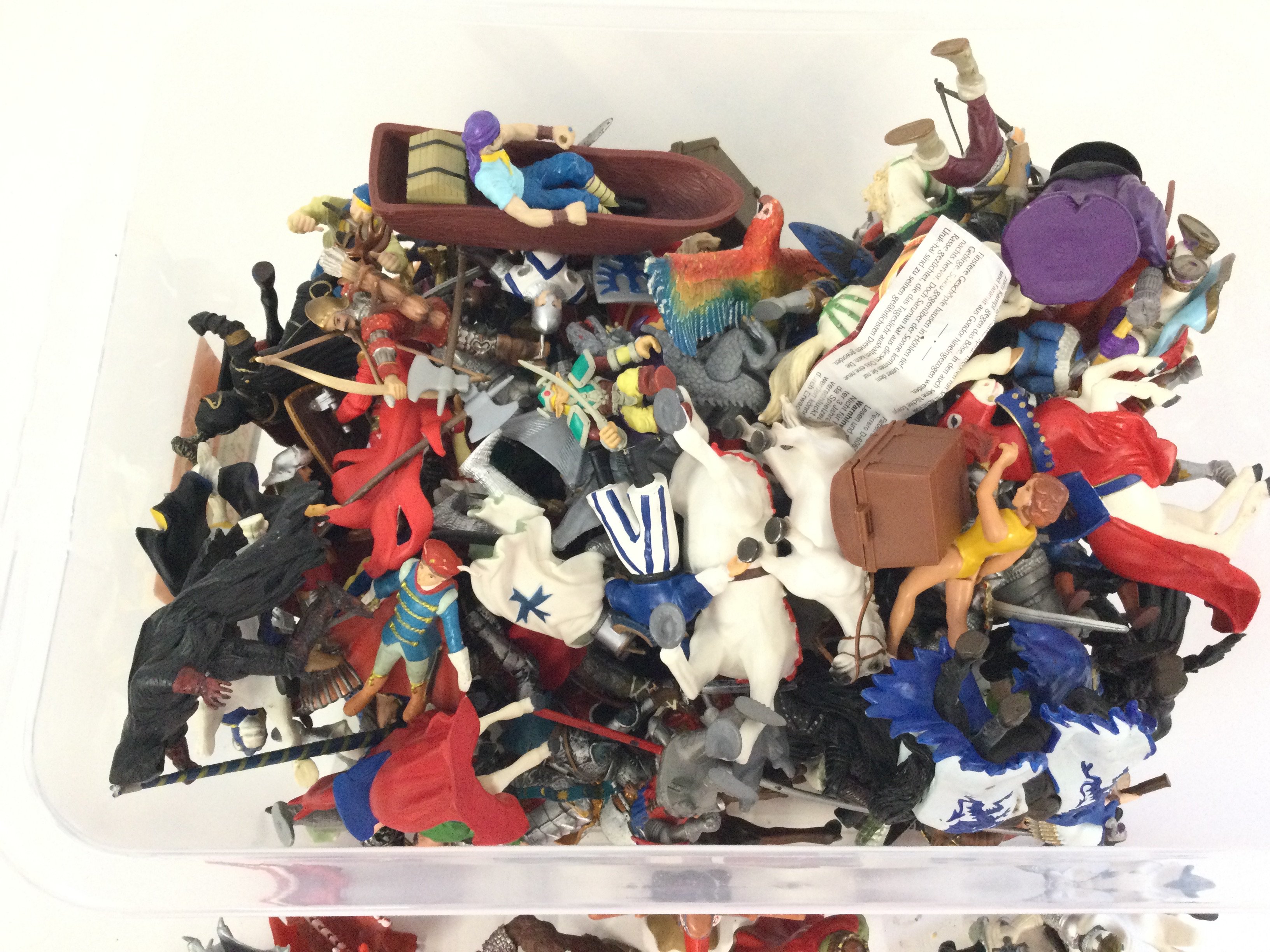 A box containing a quantity of toy figures. Mostly of knights. Horses and associated.