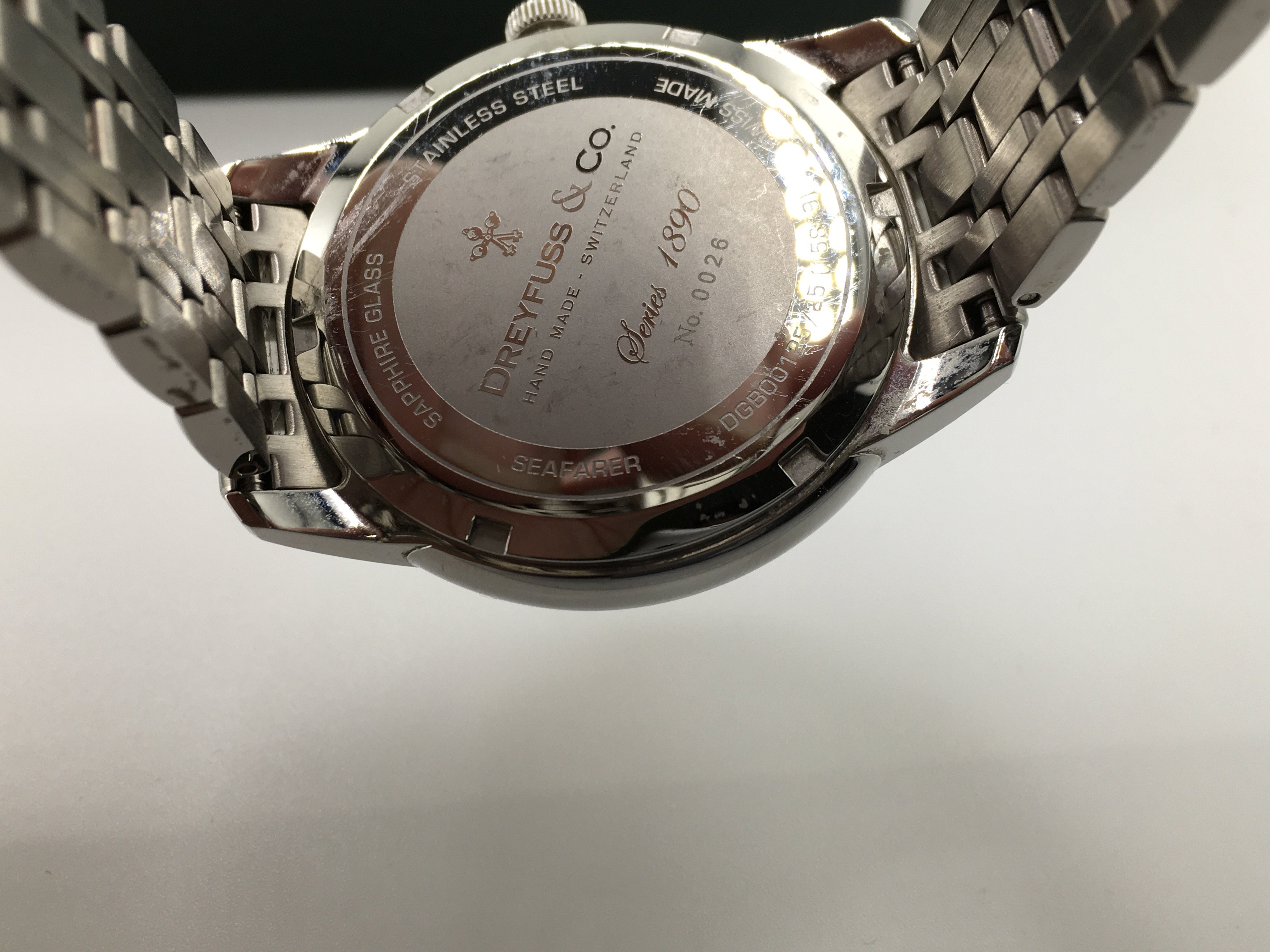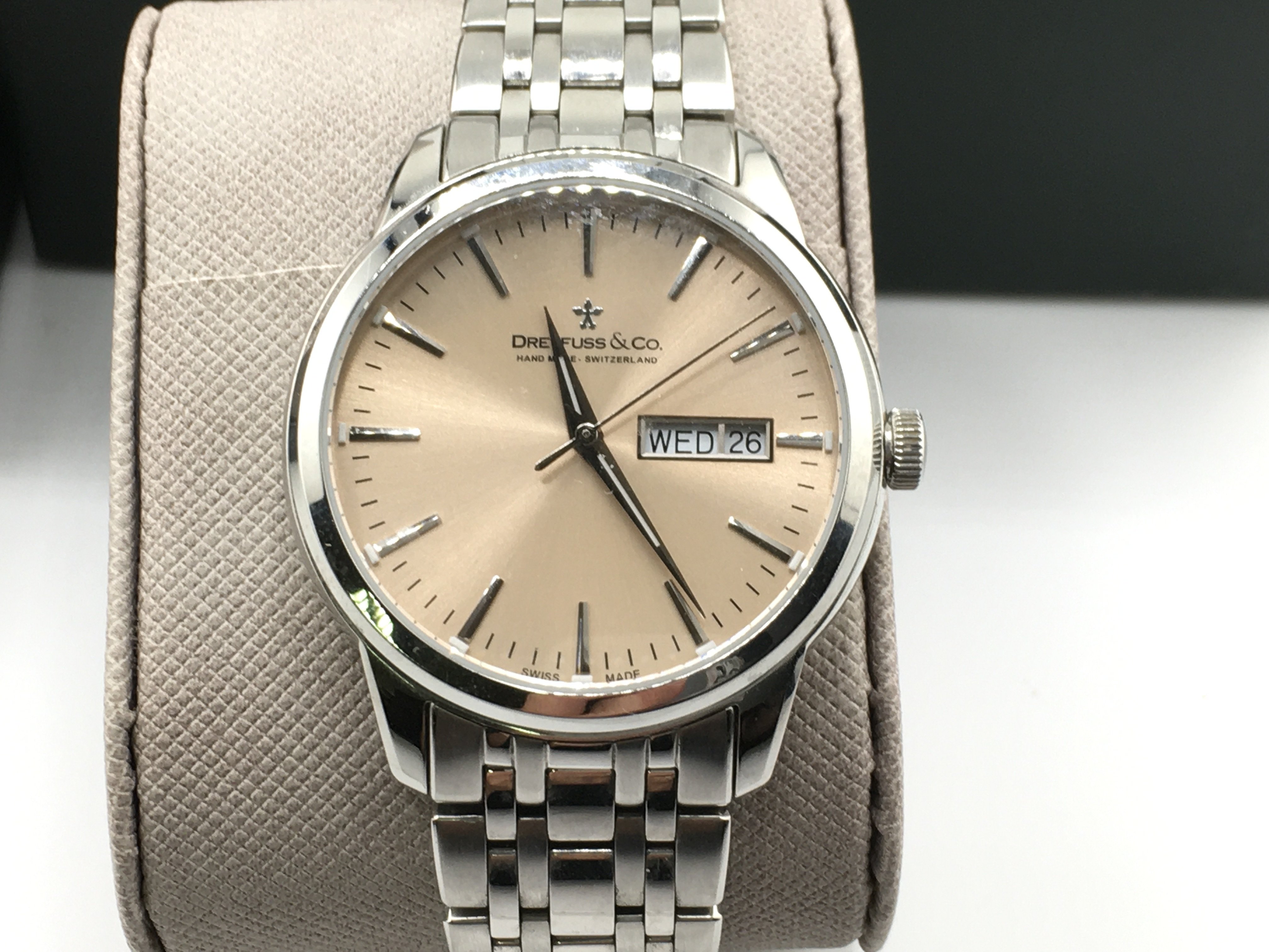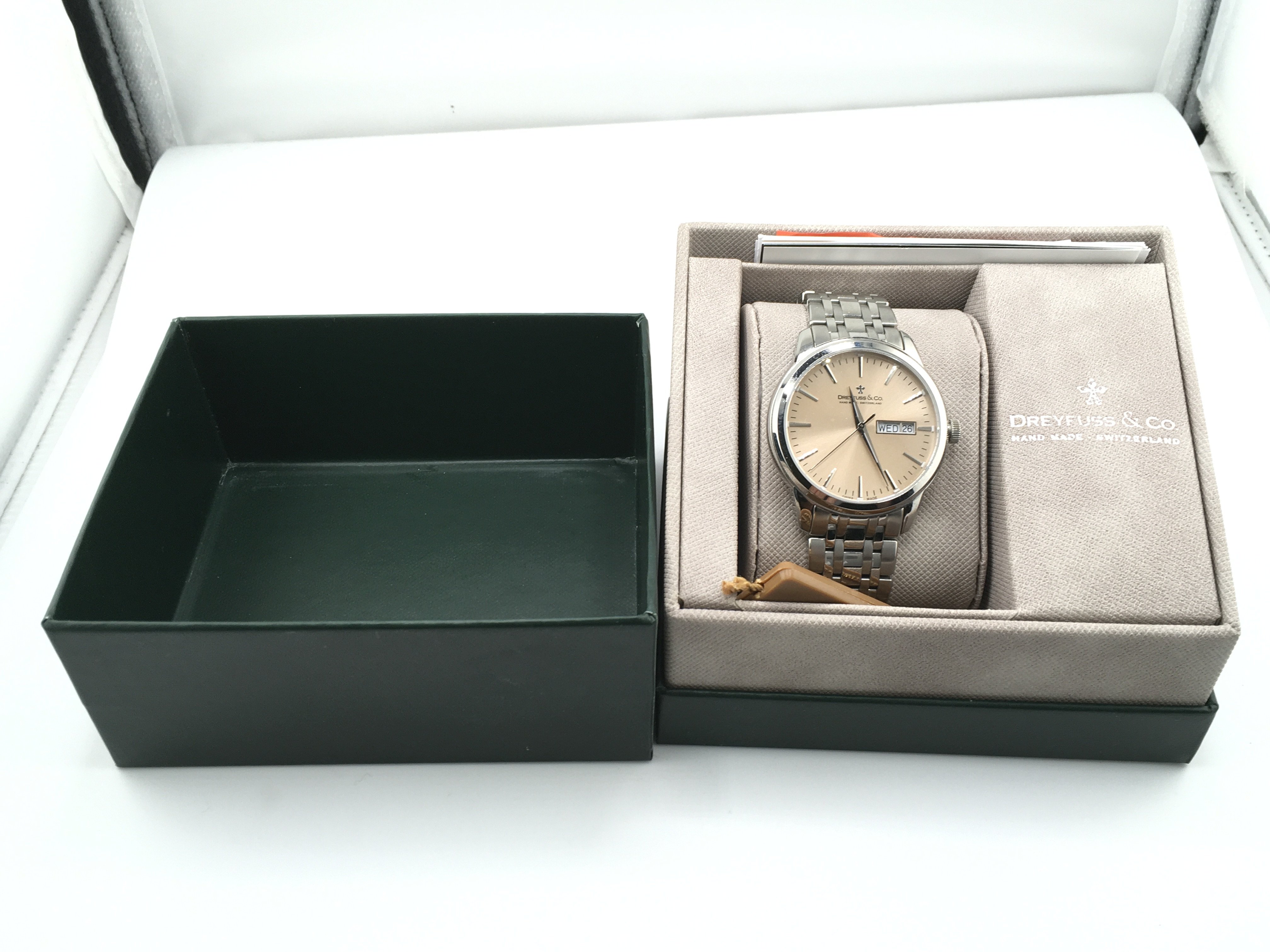A Dreyfuss and co day date watch with box and papers. Seen running. Excellent condition. 40mm case including crown.